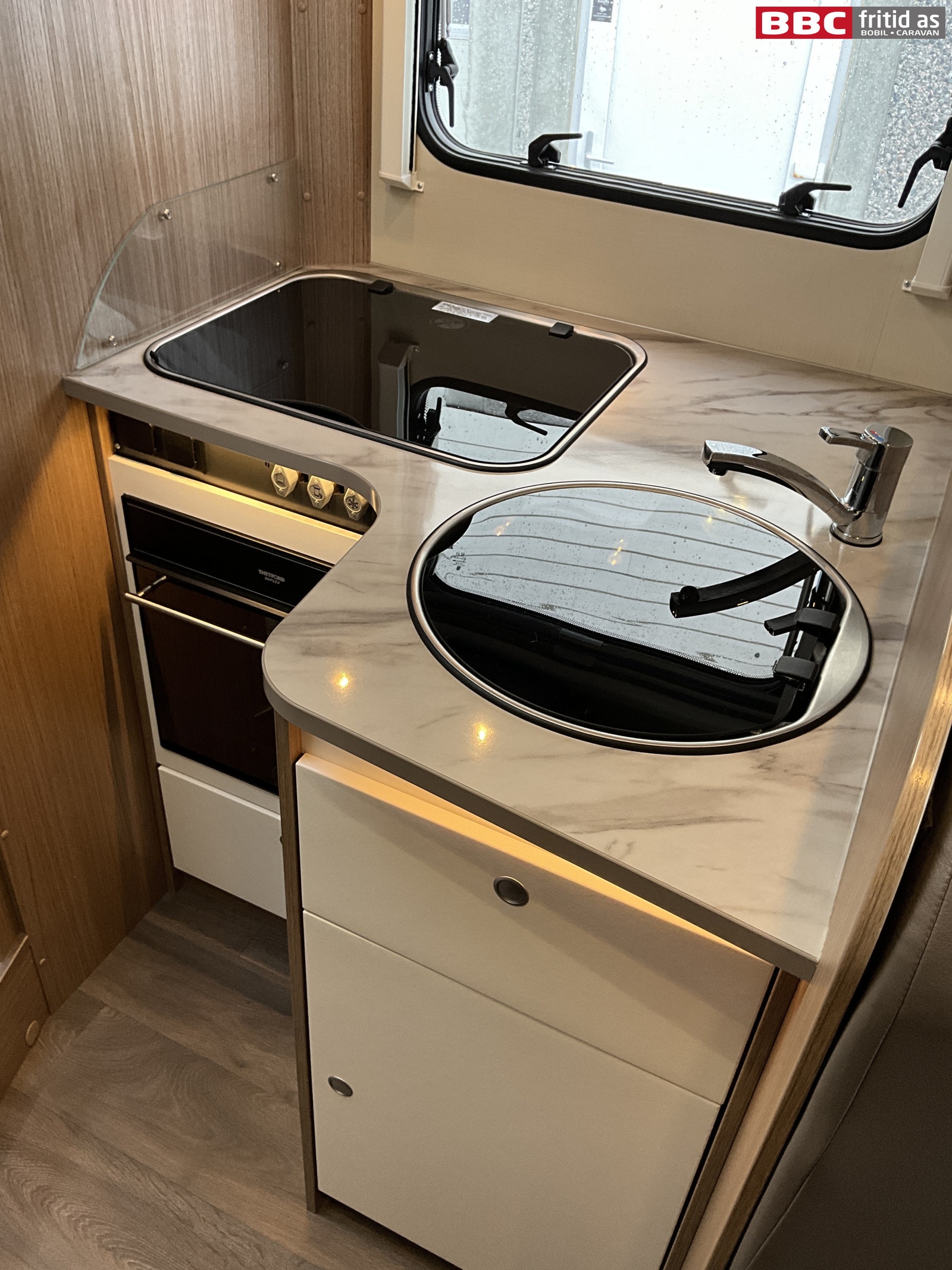 I kjøkkendelen er det 3 kokebluss, vask, overskap, 2 skuffer og 1 underskap. (Masse lagringsplass) Over kjøkkenbenken er det kjøkkenvifte og 2 lys. Takluken måler 40 x 60 cm og slipper inn godt med lys. Kjøleskapet er et Thetford med separat fryseboks. En stor Thetford stekeovn på gass er montert inn i kjøkkenbenken.