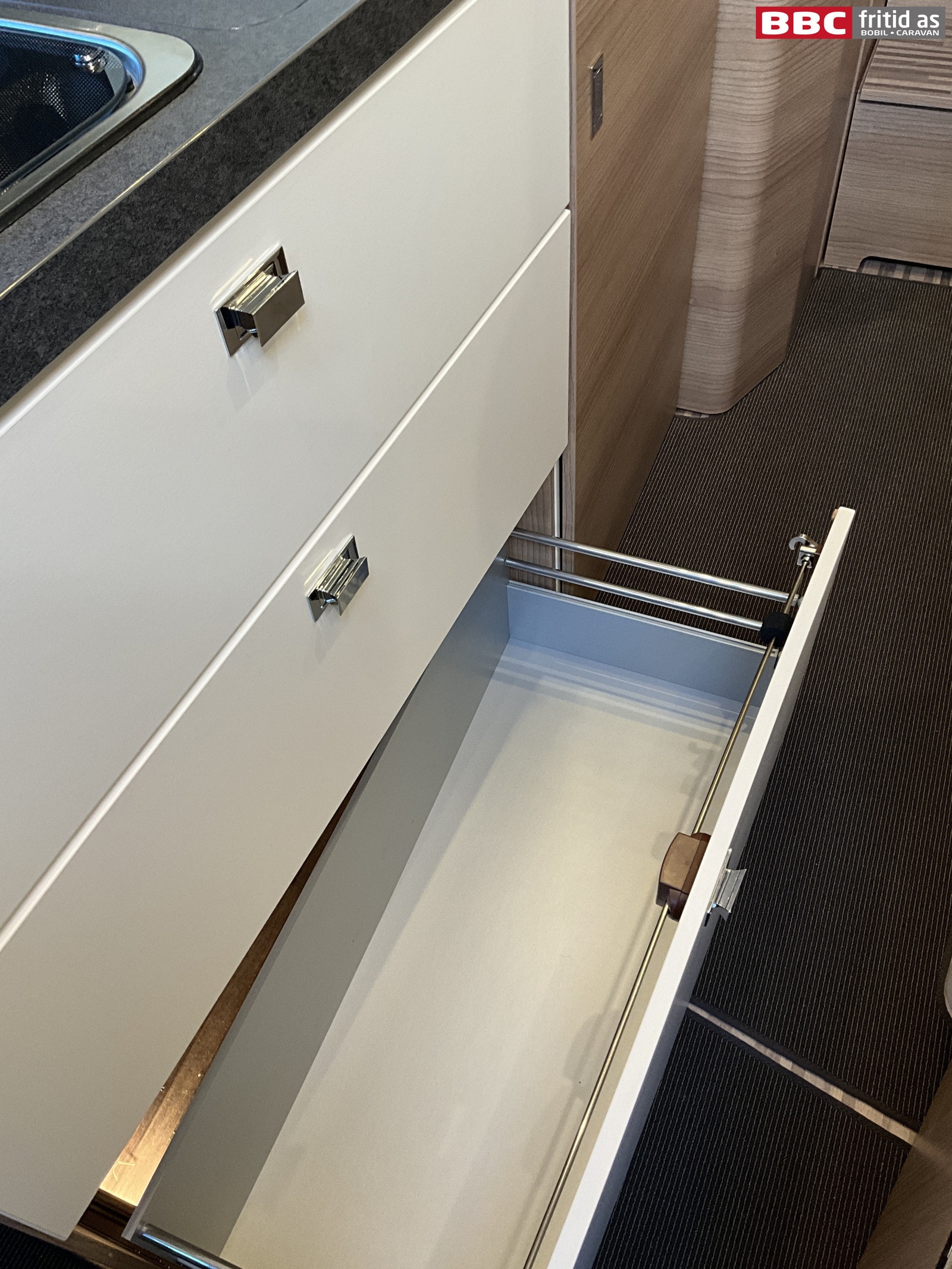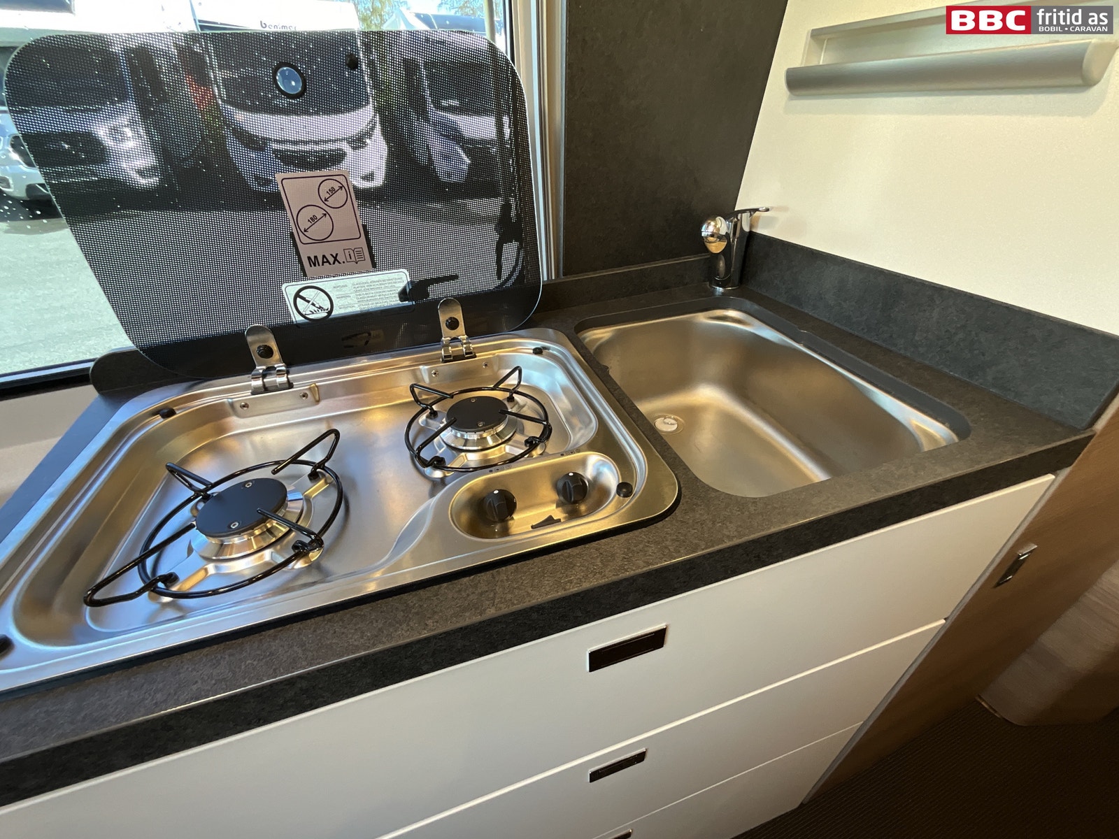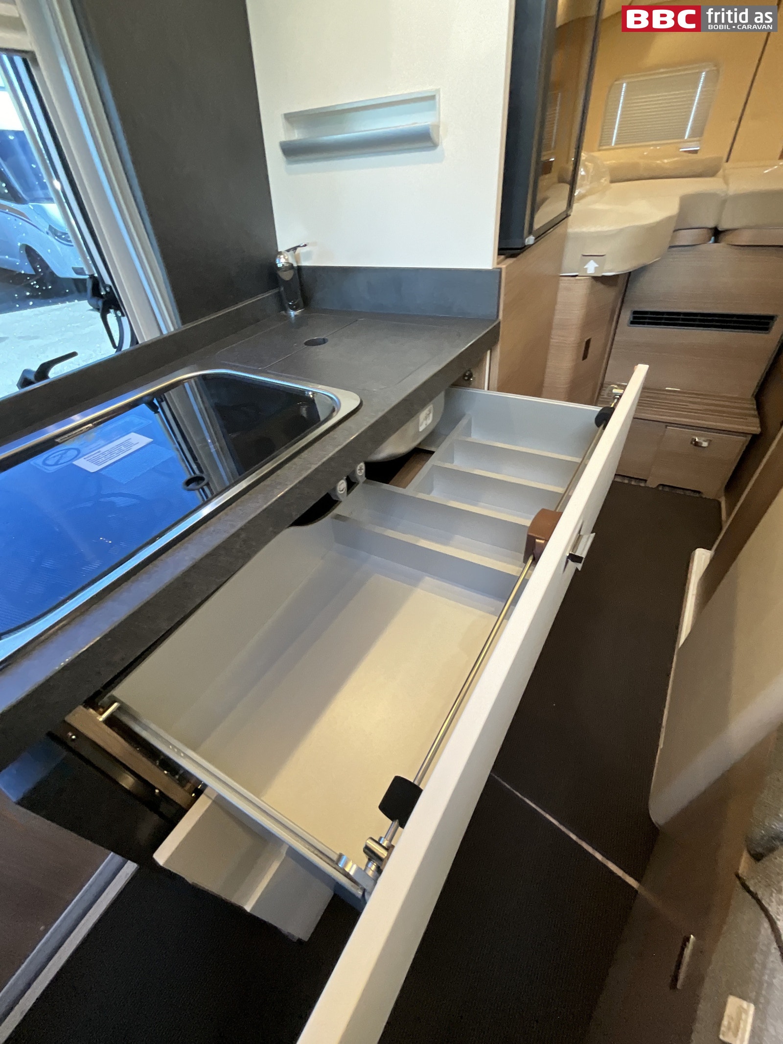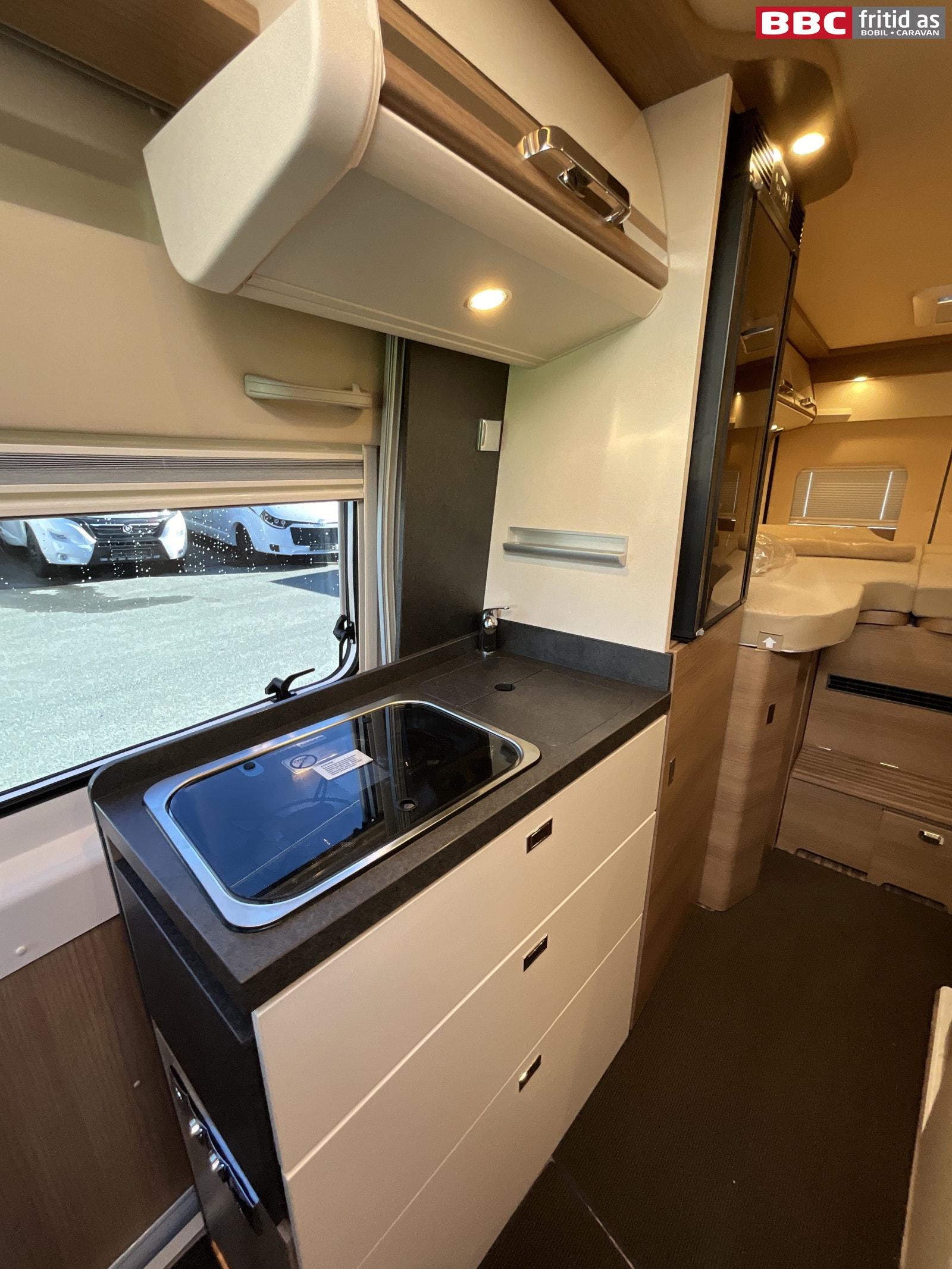 I kjøkkendelen er det 2 kokebluss, vask, 4 overskap, store skuffer, ekstraplate som kan brettes ut for å få større benk, Dometic kjøleskap med innebygd fryseboks. 1 stk 230V-uttak ved kjøkkenbenken.