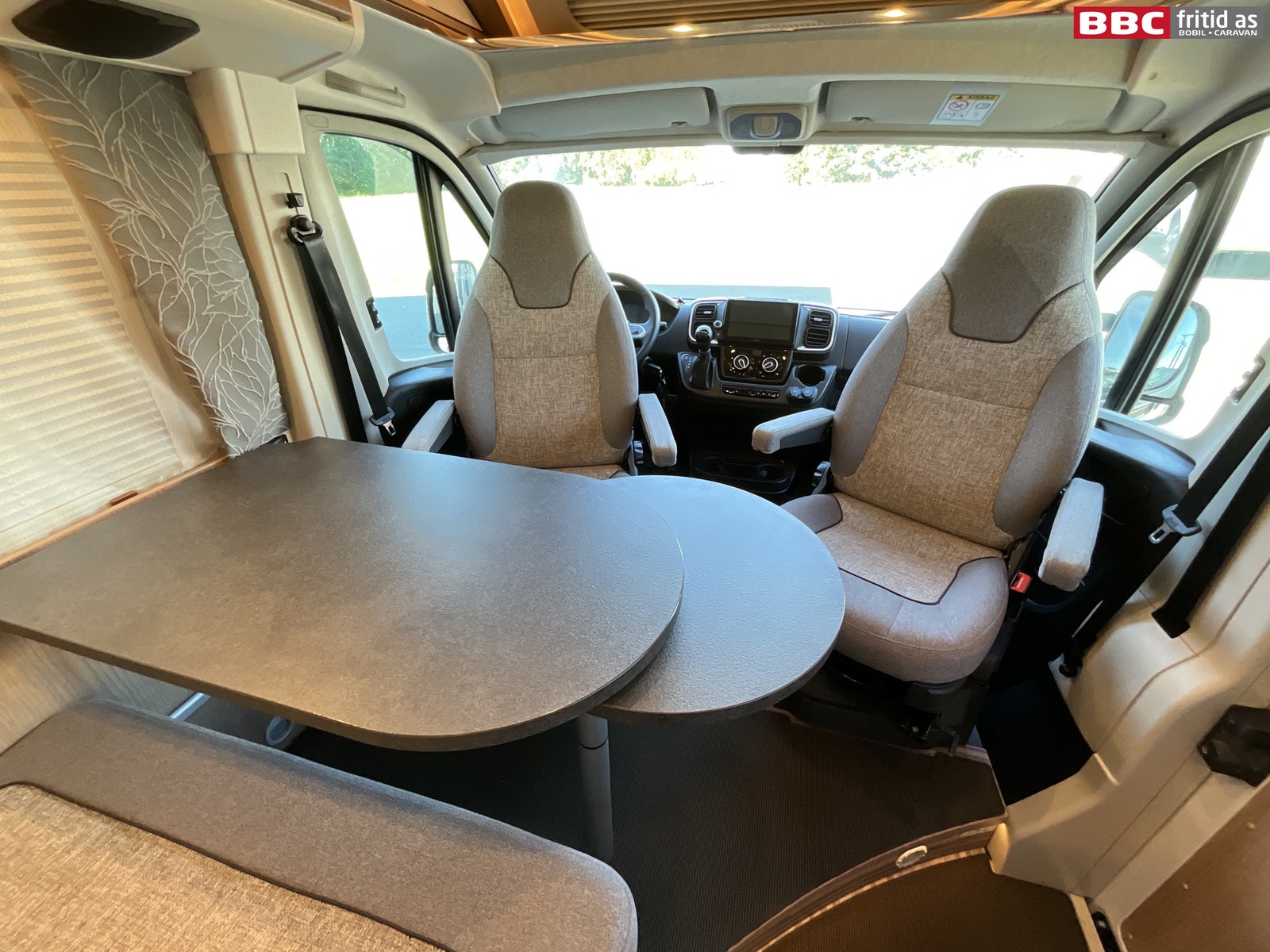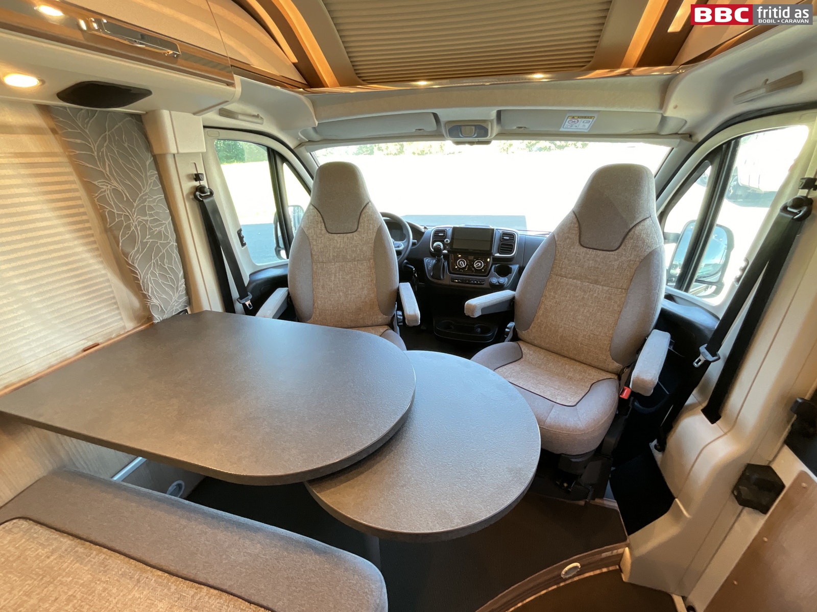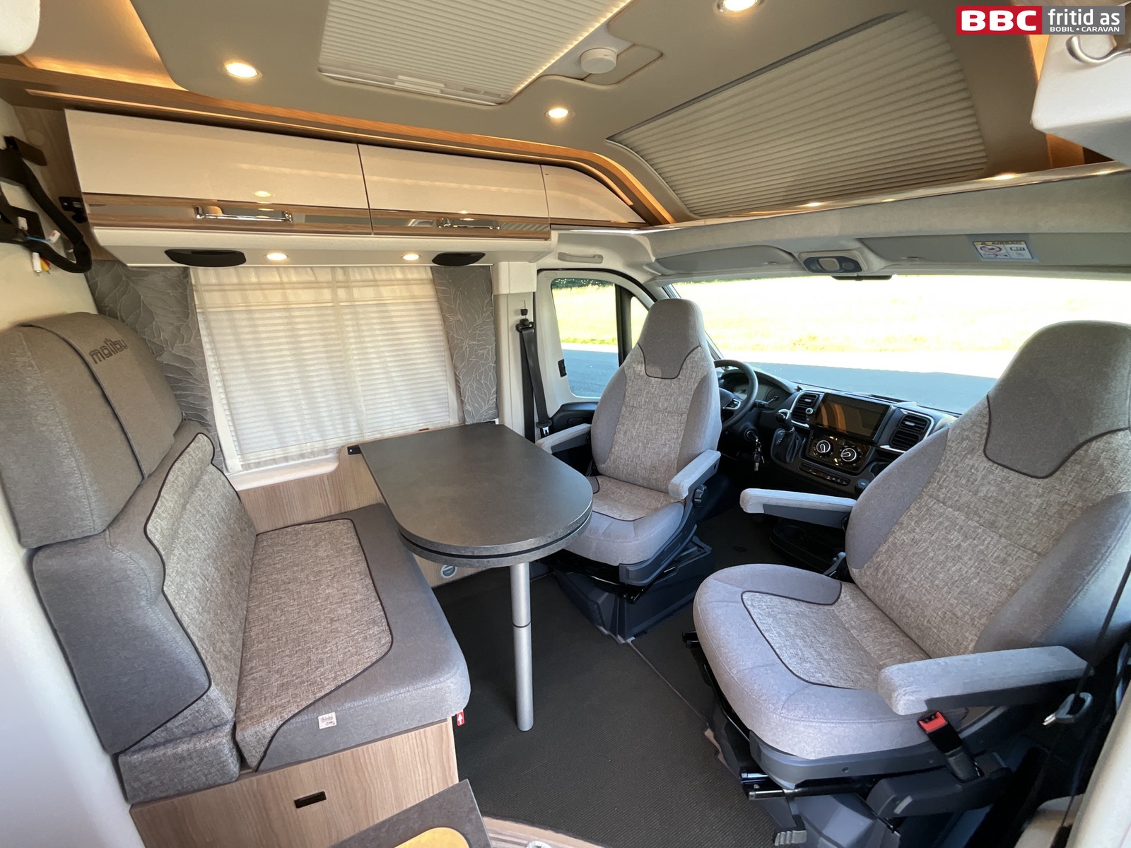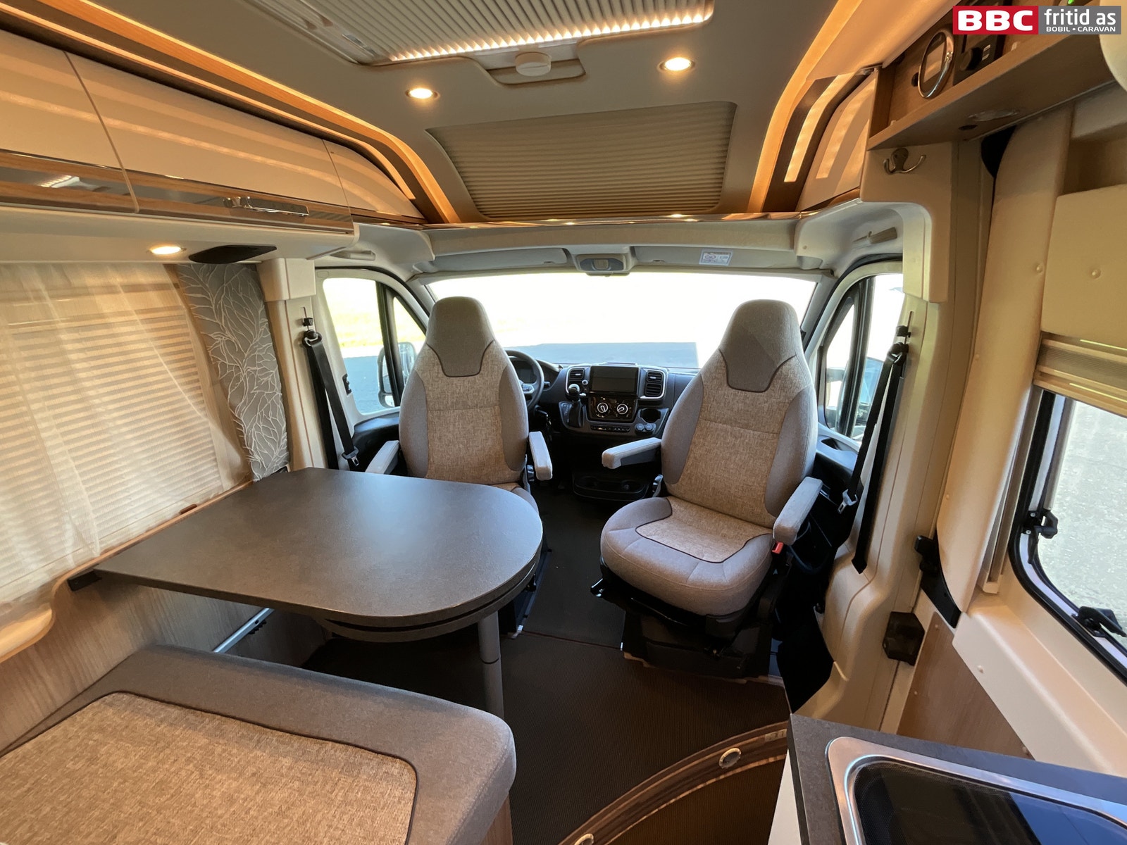Rett-salong med plass til 4 personer når de vendbare fremsetene er snudd rundt. Bordet måler 90 x 54 cm, men kan utvides med 28 cm ved å svinge ut en ekstra original bordplate som ligger under. Bordet kan også taes av for å ordne med ekstra sengeplass ved behov. Ellers er det 4 overskap, stor skuff under salong, 2 stk 230V og 1 stk USB-uttak. 4 taklys, 3 lys under overskapene og ledstriper. Takluken er hele 40 x 60 cm og slipper inn godt med lys i bilen (kan selvsagt blendes og stenges med myggnetting). Det er vindu i den brede bodelsdøren samt myggdør. TV-feste er også montert.
