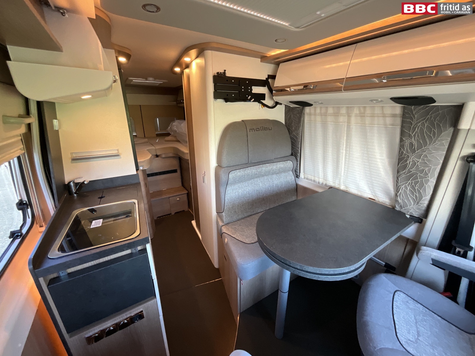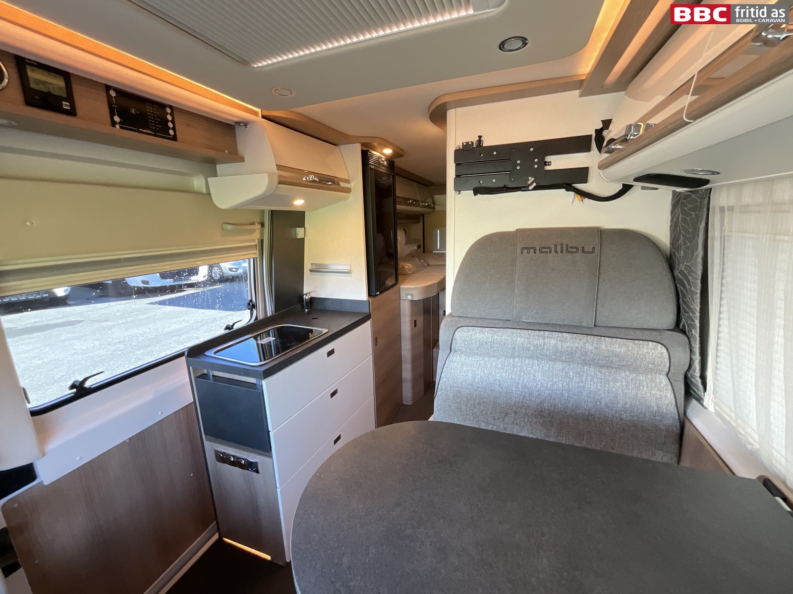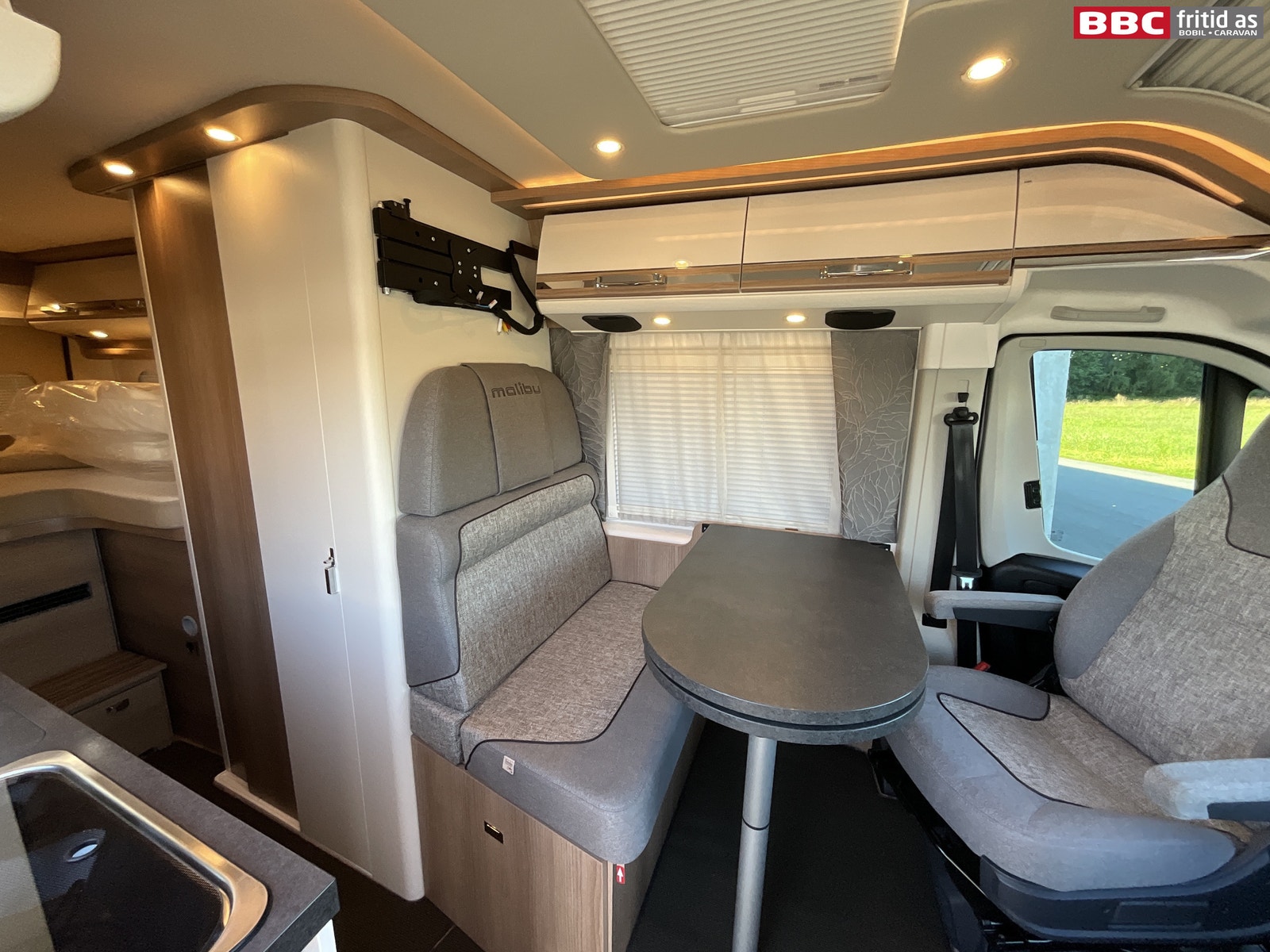 Rett-salong med plass til 4 personer når de vendbare fremsetene er snudd rundt. Bordet måler 90 x 54 cm, men kan utvides med 28 cm ved å svinge ut en ekstra original bordplate som ligger under. Bordet kan også taes av for å ordne med ekstra sengeplass ved behov. Ellers er det 4 overskap, stor skuff under salong, 2 stk 230V og 1 stk USB-uttak. 4 taklys, 3 lys under overskapene og ledstriper. Takluken er hele 40 x 60 cm og slipper inn godt med lys i bilen (kan selvsagt blendes og stenges med myggnetting). Det er vindu i den brede bodelsdøren samt myggdør. TV-feste er også montert.