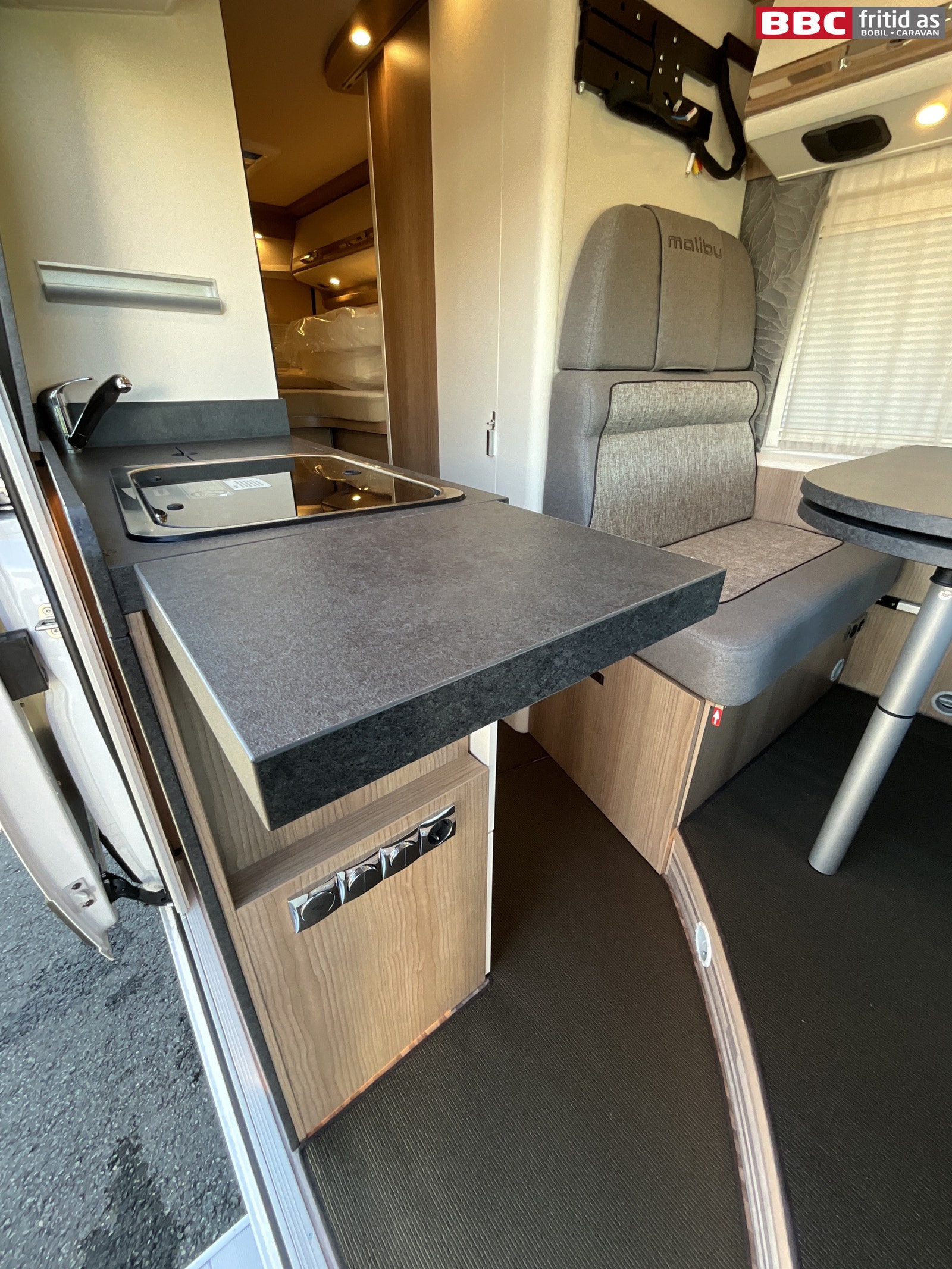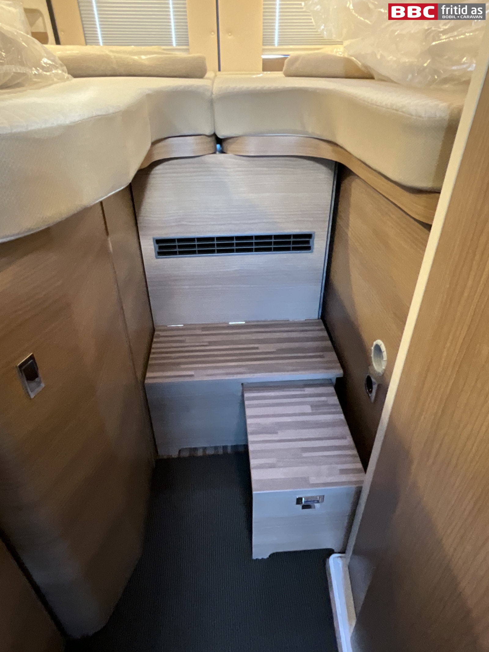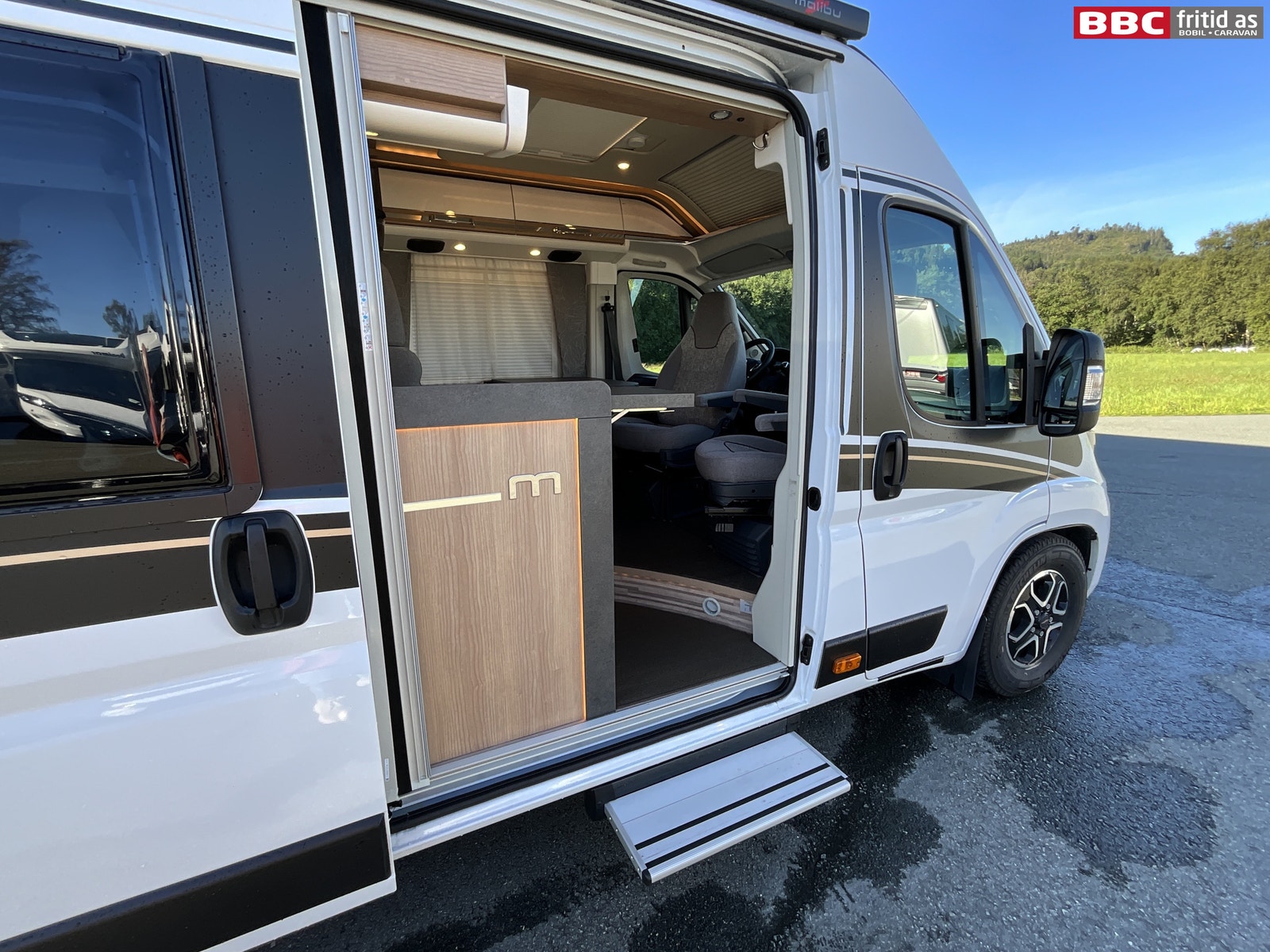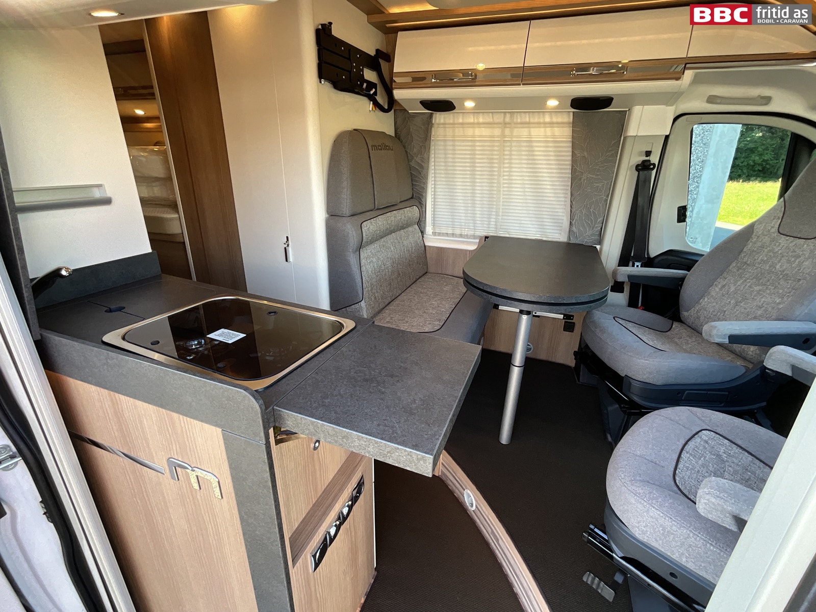 Rett-salong med plass til 4 personer når de vendbare fremsetene er snudd rundt. Bordet måler 90 x 54 cm, men kan utvides med 28 cm ved å svinge ut en ekstra original bordplate som ligger under. Bordet kan også taes av for å ordne med ekstra sengeplass ved behov. Ellers er det 4 overskap, stor skuff under salong, 2 stk 230V og 1 stk USB-uttak. 4 taklys, 3 lys under overskapene og ledstriper. Takluken er hele 40 x 60 cm og slipper inn godt med lys i bilen (kan selvsagt blendes og stenges med myggnetting). Det er vindu i den brede bodelsdøren samt myggdør. TV-feste er også montert.