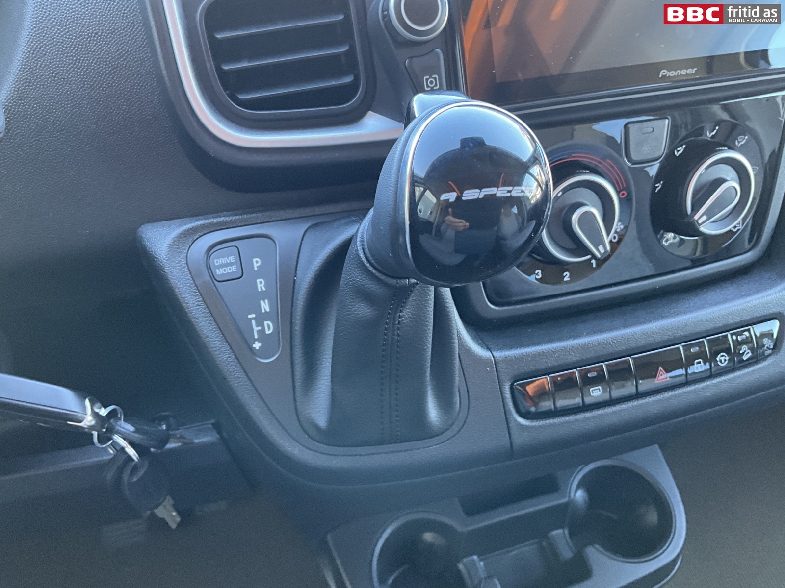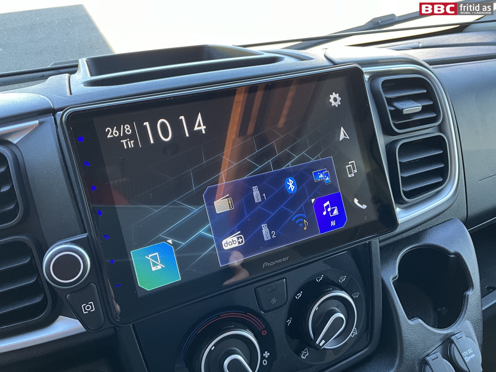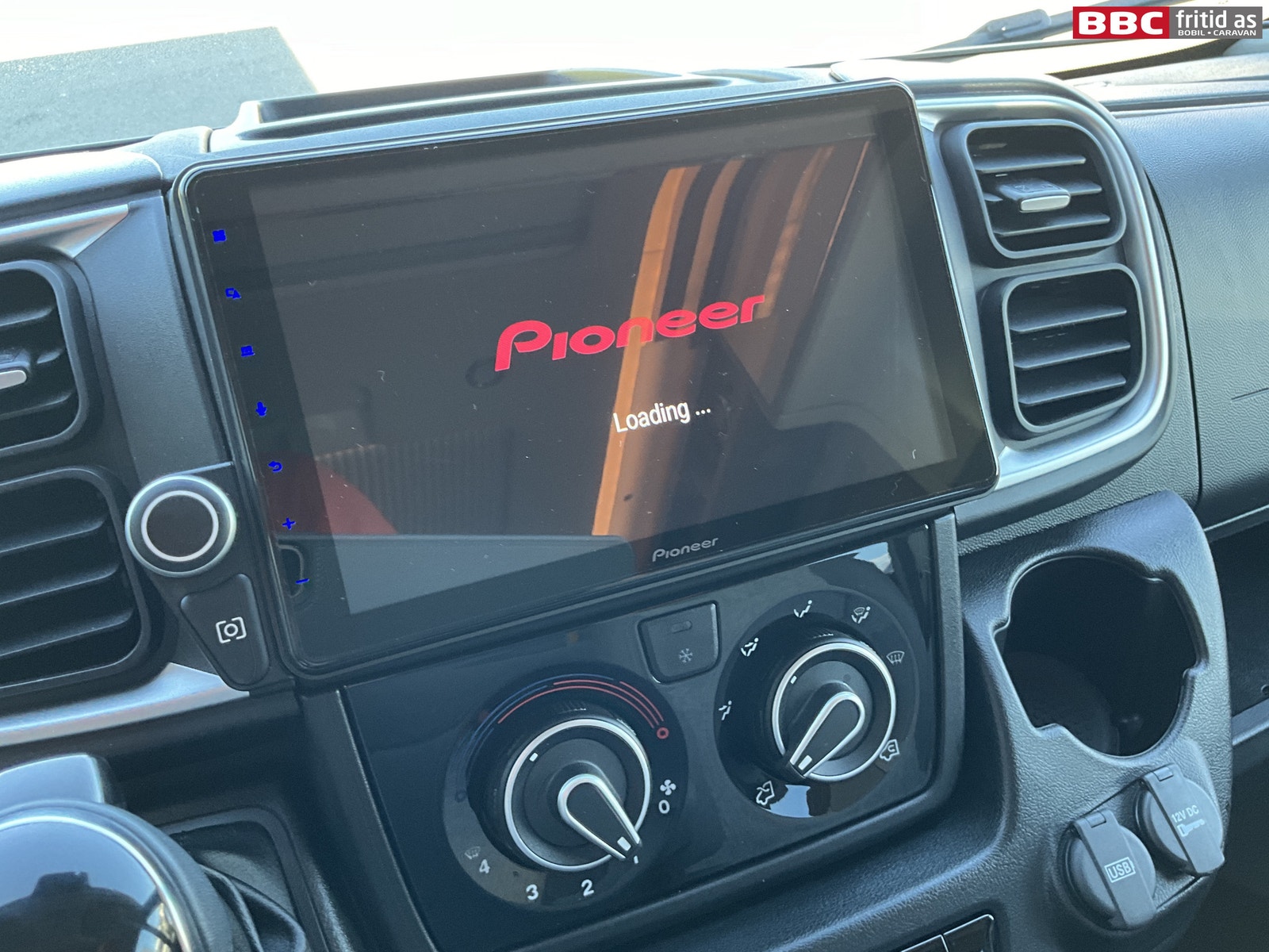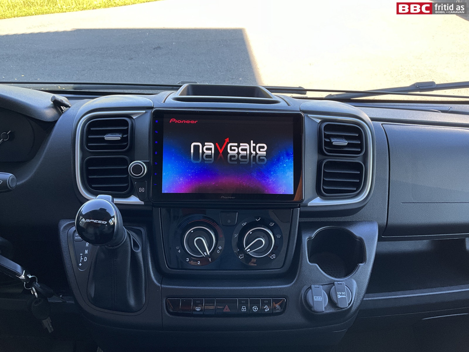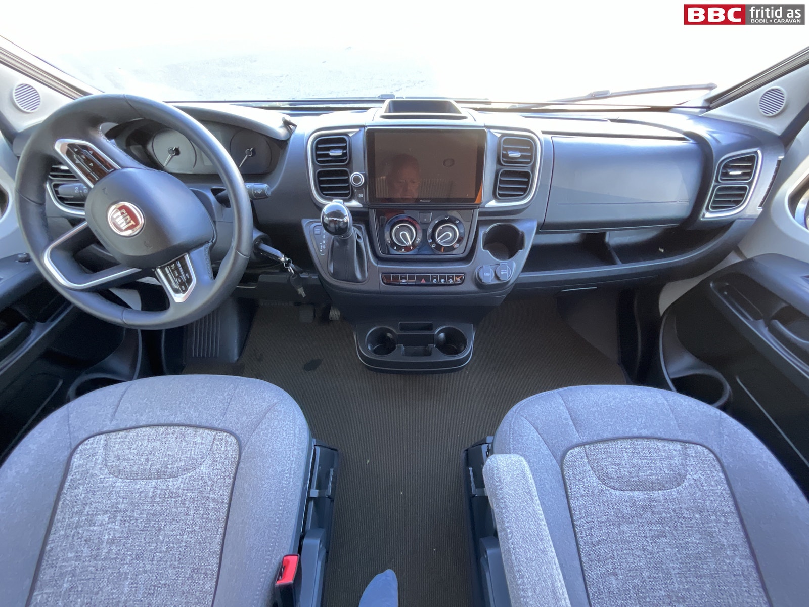 Fremme i bilen er det en Pioneer 2-din radio med ekstra stor og tydelig skjerm, DAB+, handsfree, bluetooth, og masse funskjoner styres fra denne skjermen. Remis blendingsgardiner i alle vinduer forran. Stor takluke over fremsetene. Multifunksjonsratt med mange funksjoner.