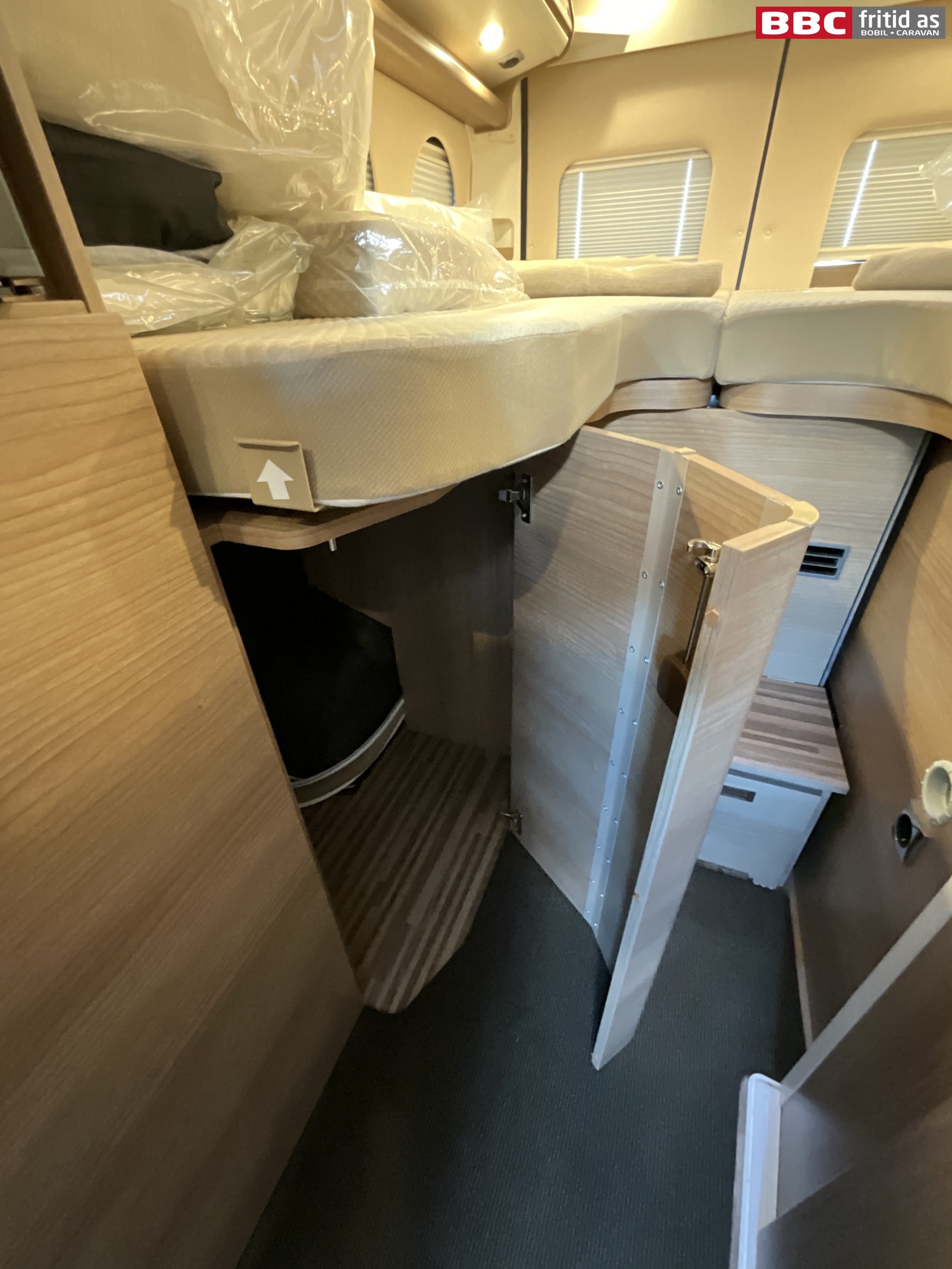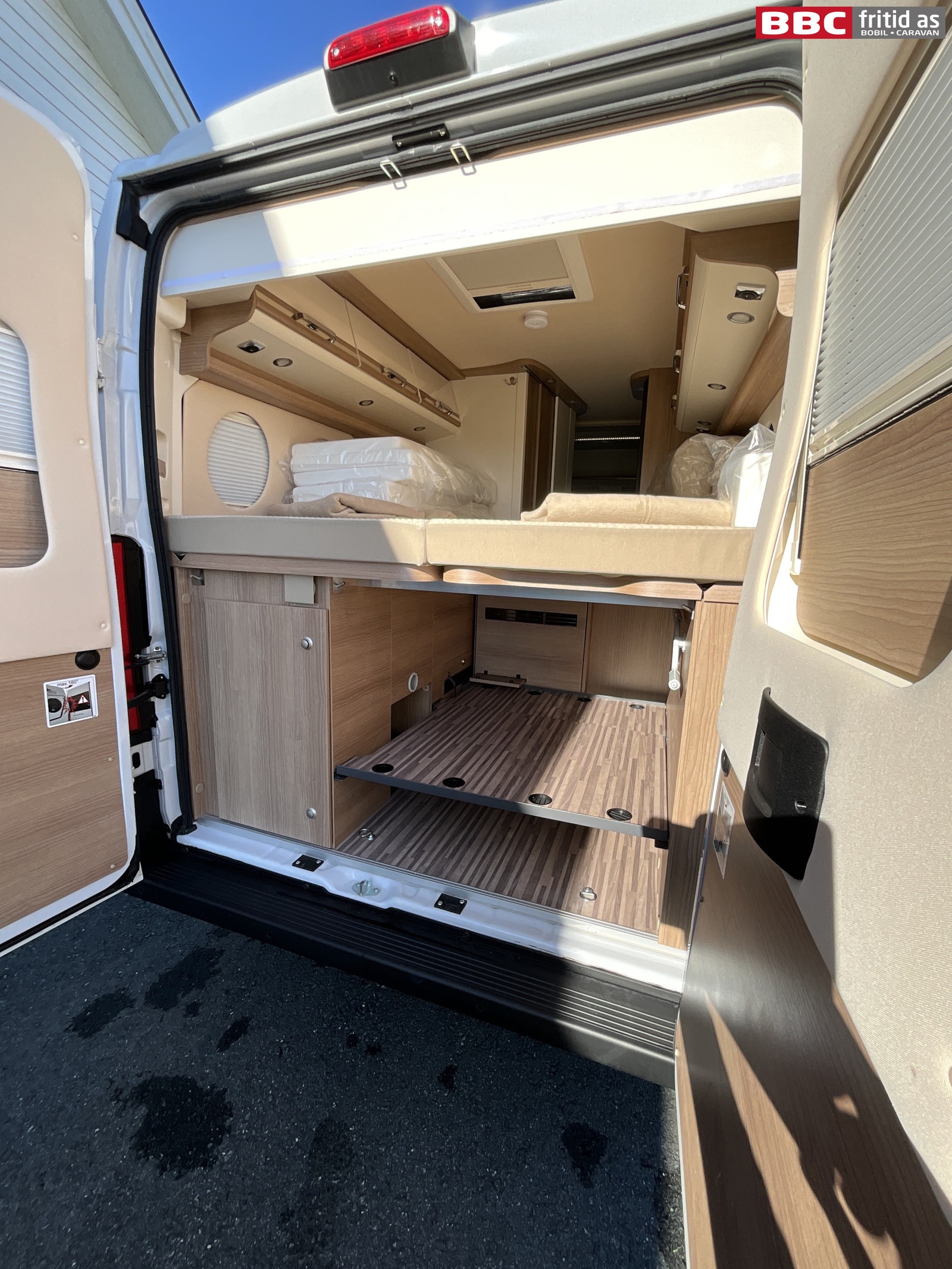 Bak i bilen er det et romslig lasterom under sengene på b: 80 cm, h: 93 cm, d: 120 cm. Ekstra hylle er lagt inn, men kan fjernes enkelt. I gassrommet er det 1 stk stor gassflaske (plass til 2 stk) med industrikobling og crashsensor.