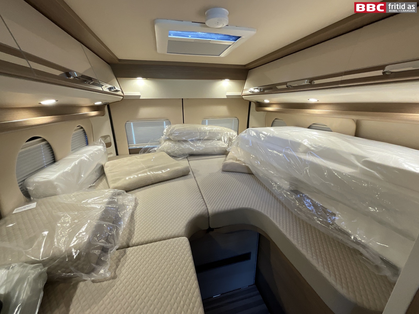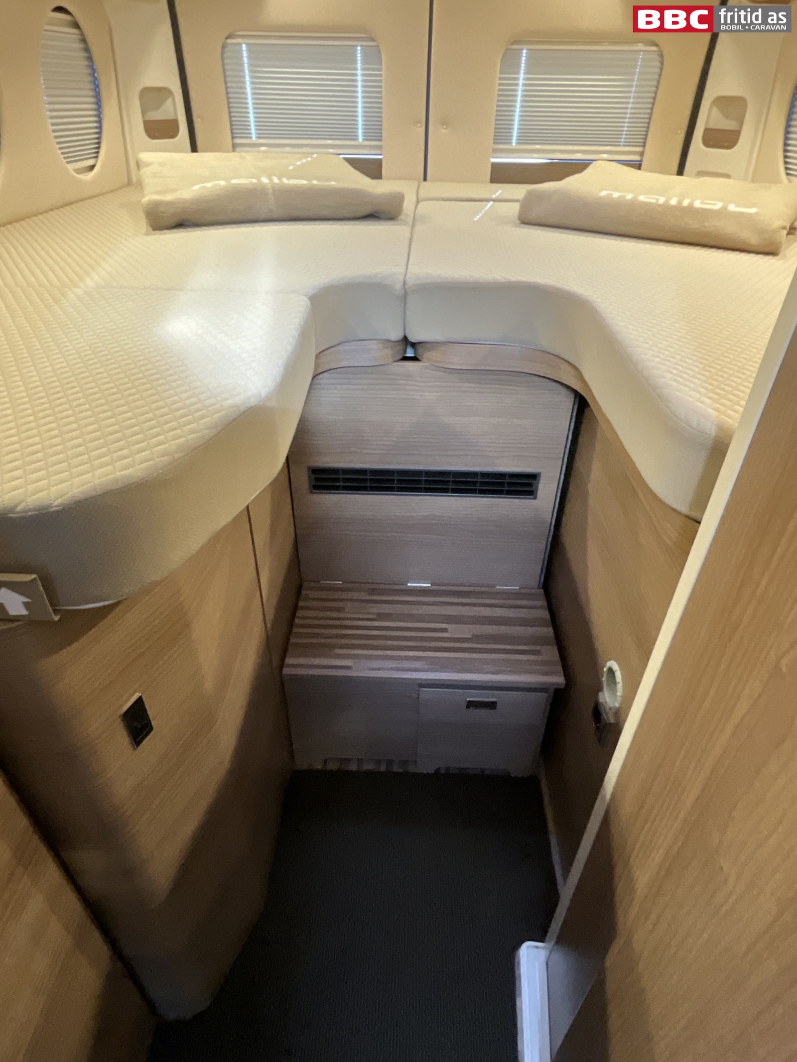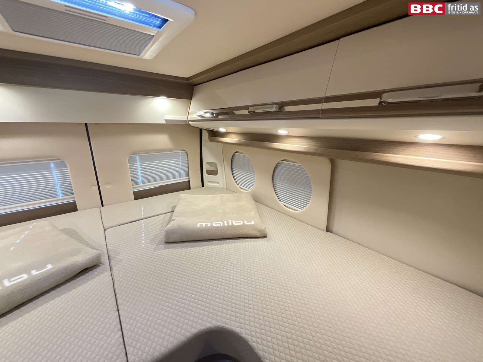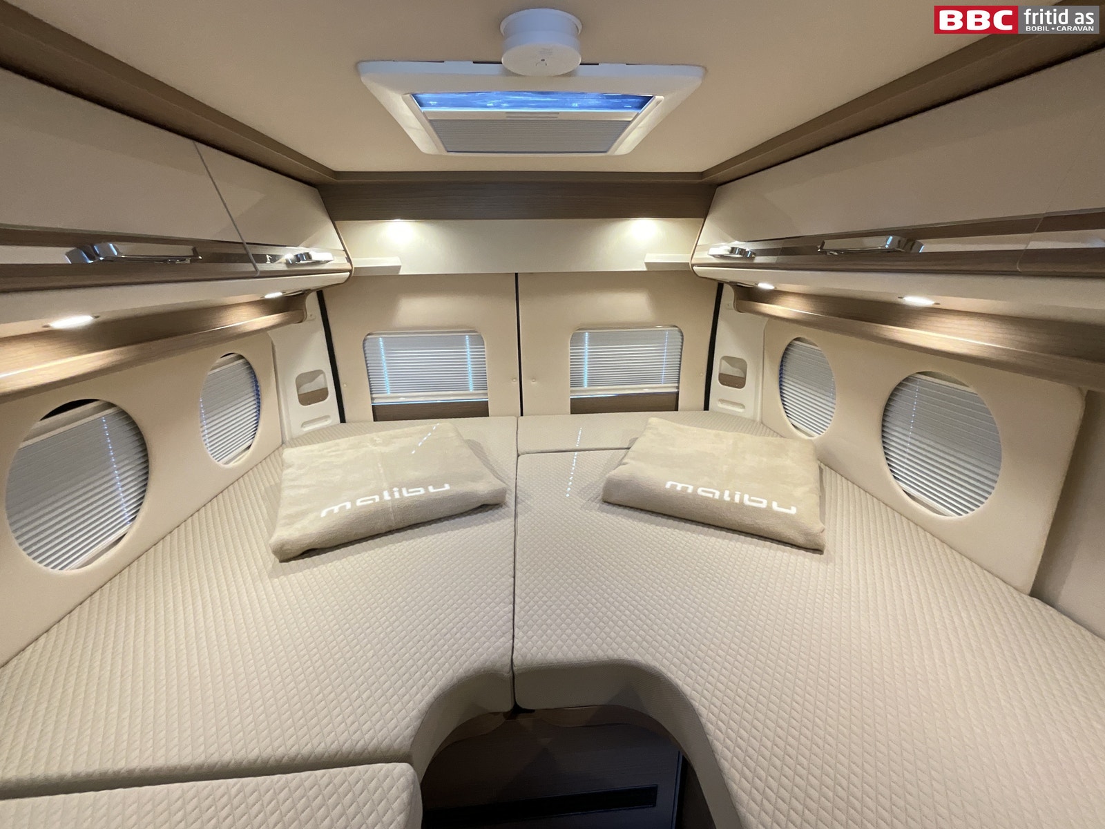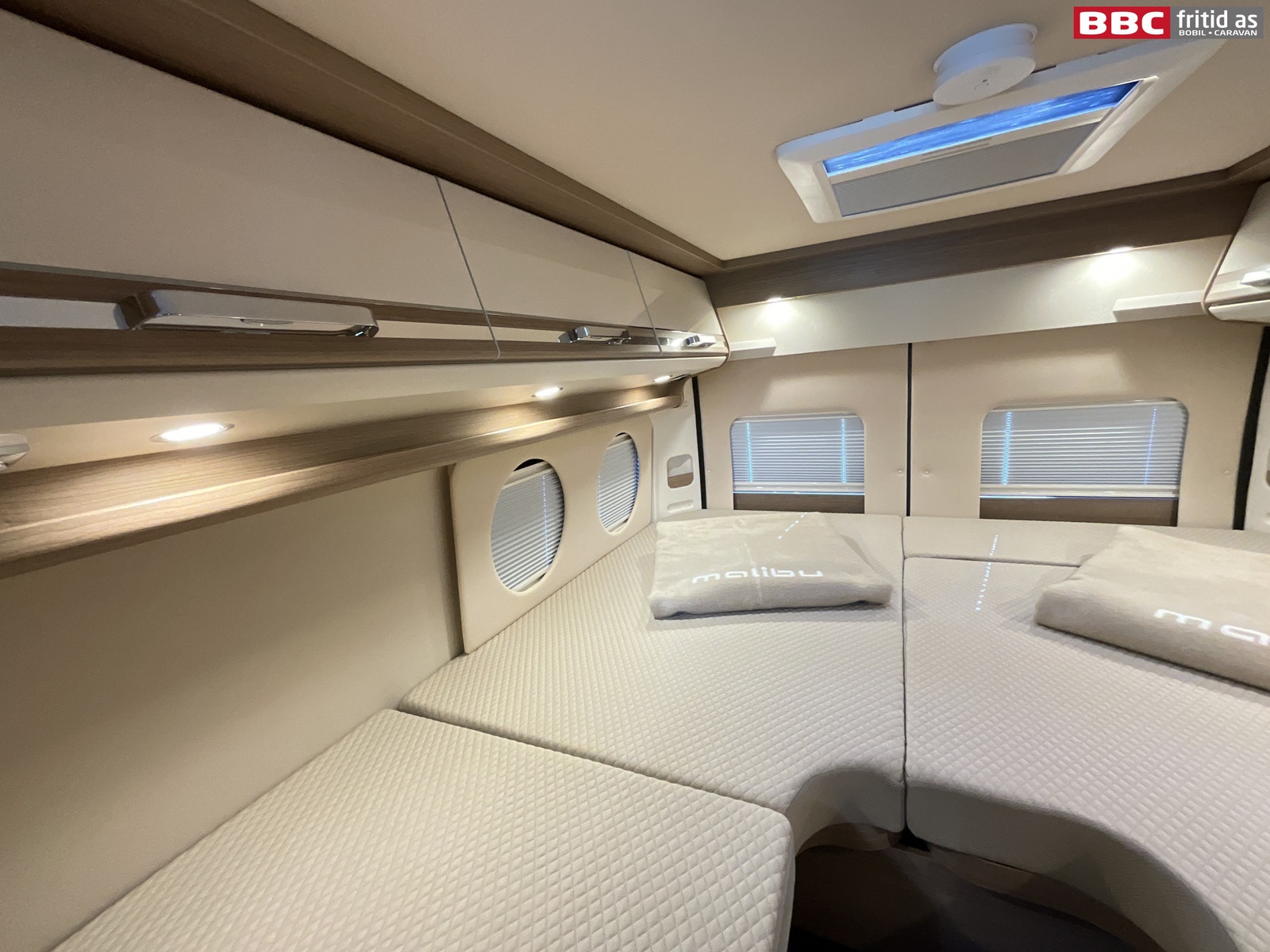 Bakerst i bilen er det 2 enkeltsenger på hhv 180 x 70 og 200 x 70 cm. Disse kan også legges sammen til stor dobbeltseng som et alternativ. Begge sengene kan vippes opp i fotenden for lagerplass. 1 underskap, 1 skuff, 6 overskap, 2 leselys, 1 stk 230V og 2 stk USB-uttak i sovedelen. Takluken er på 40 x 40 cm. 2 originale puter, 4 runde vinduer og trappetrinn for enkel adkomst til sengene.