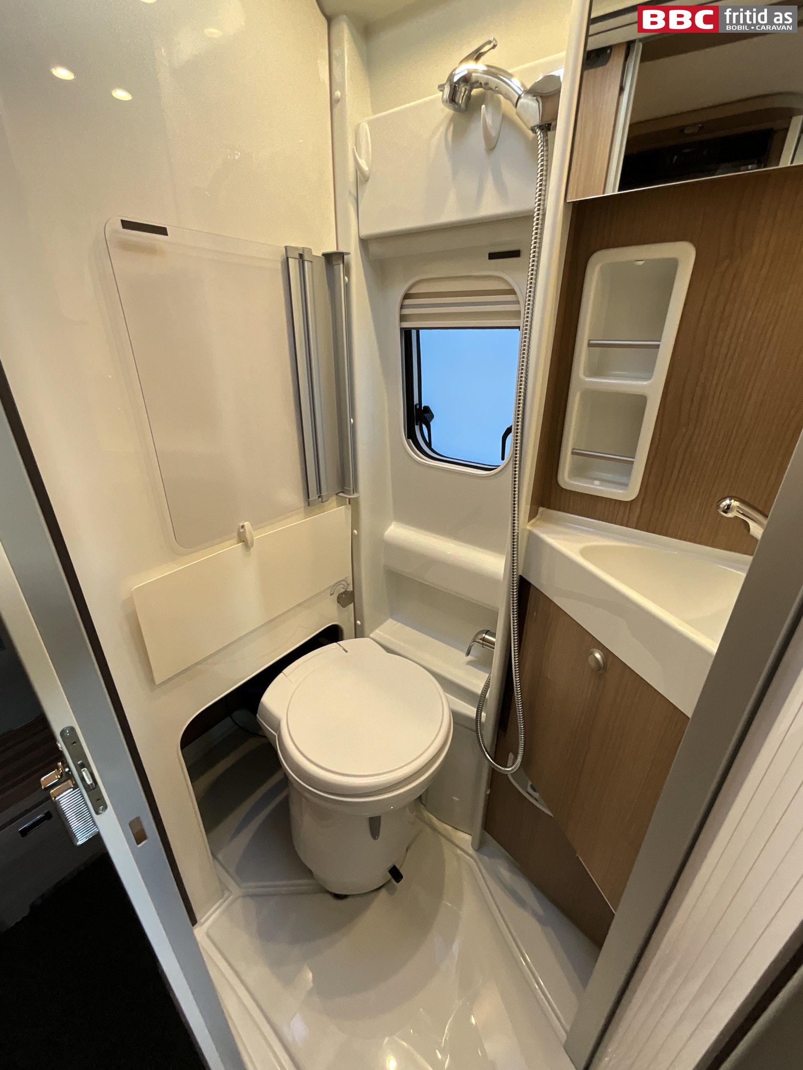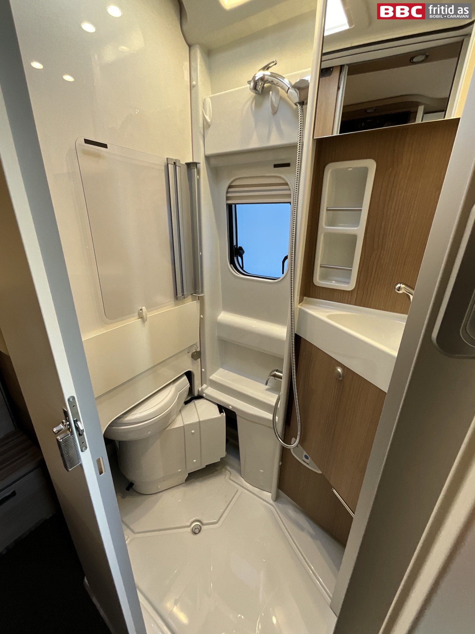 Kompaktbad som er meget praktisk innredet slik at wc-skålen kan svinges inn i veggen når den ikke er i bruk. Dermed får du godt med gulvplass når badet skal brukes til f.eks dusjing. Her er det også underskap, speil, 3 taklys, kroker, 230V-uttak, takluke og skyvedør mot gangen.