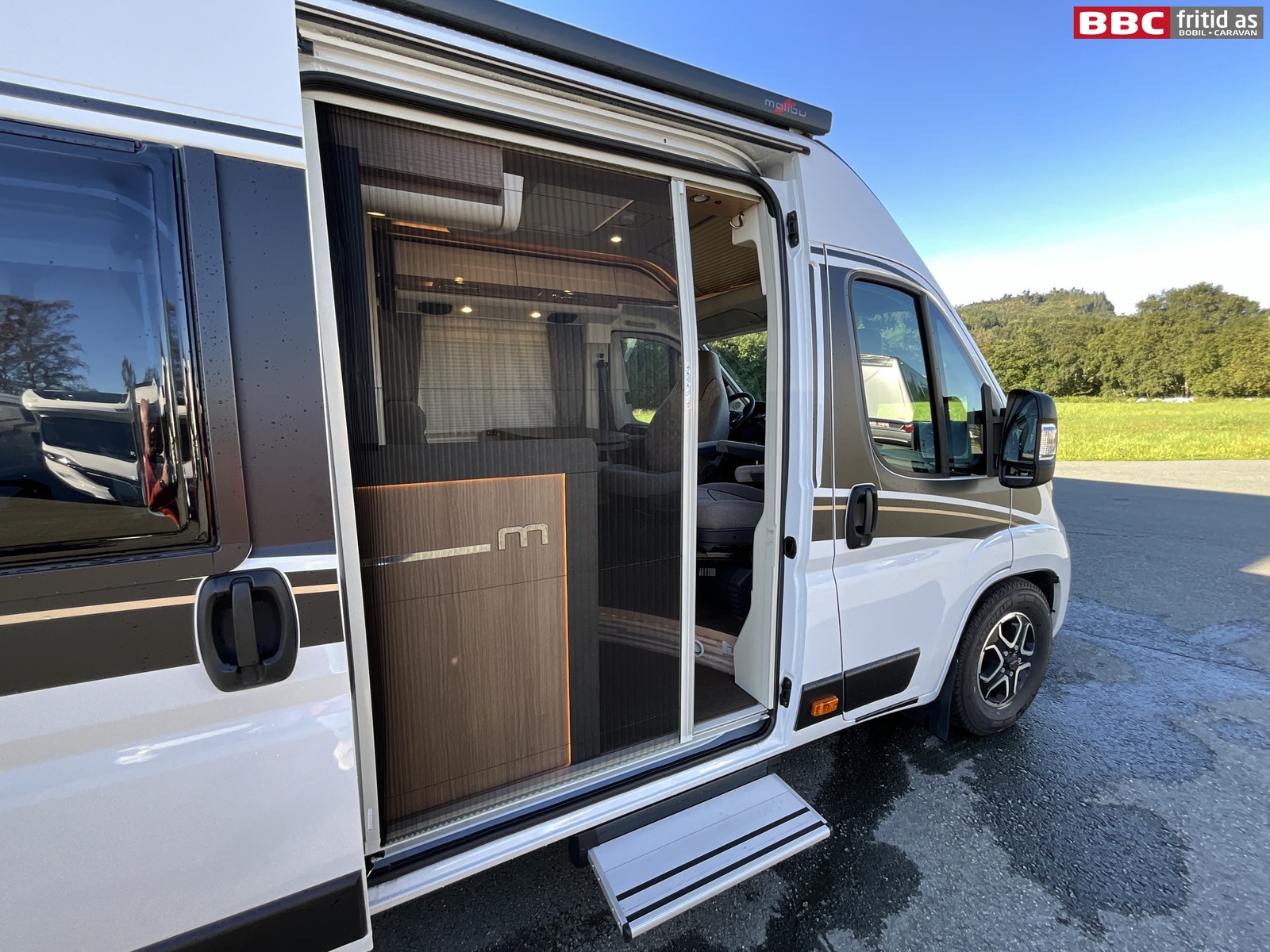 Bilen har en DOMETIC markise (sort boks) på ca 4 meter. Meget pent med sort marksiekassett på hvit bil. Elektrisk stigtrinn under bodelsdøren på 70 cm bredde. Sentrallås på både fører og bodelsdør. 2 stk LED-barer forran gir godt med ekstra lys på mørke kvelder. Solcellepanel på taket.