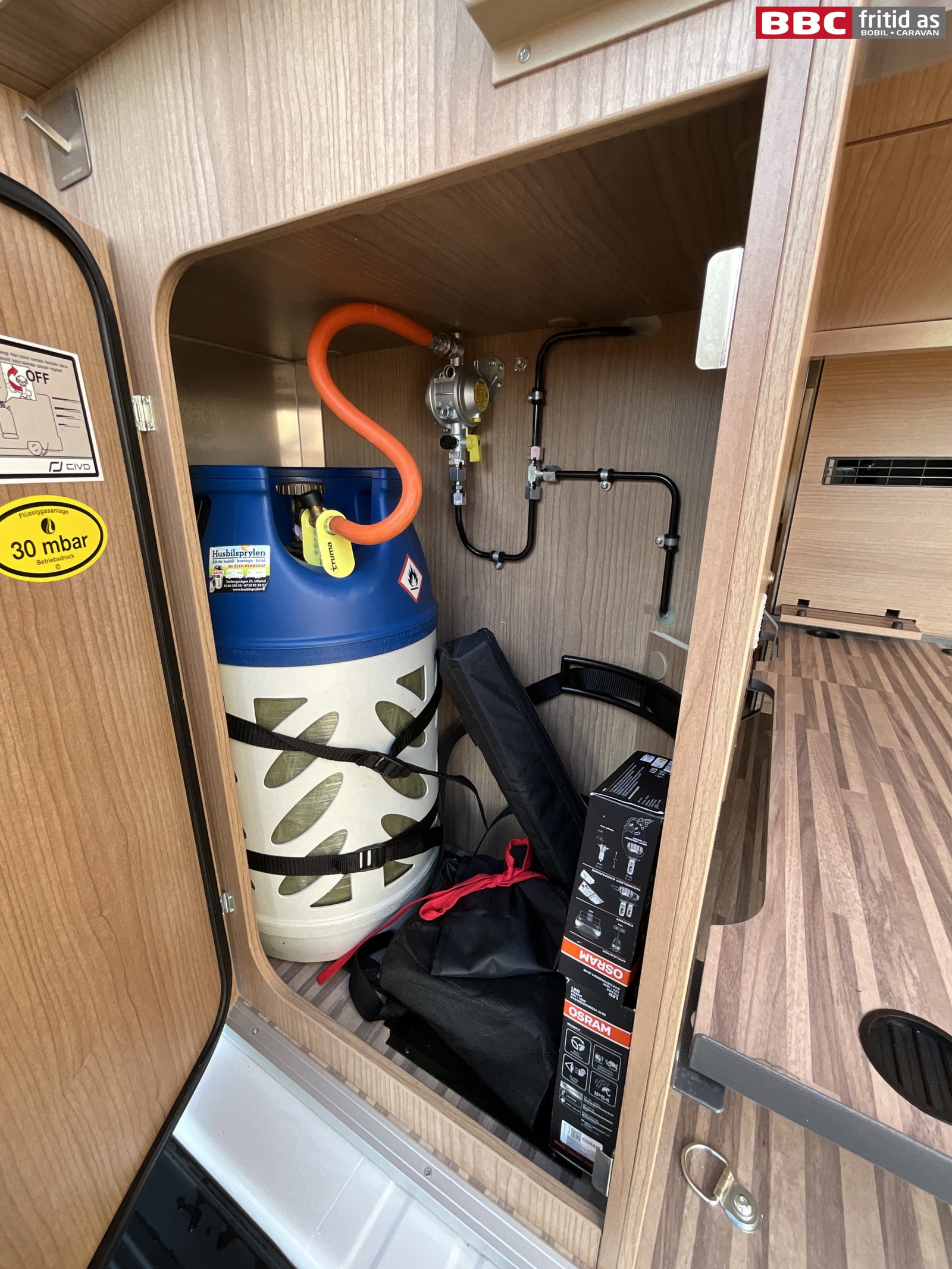 Her er det en TRUMA COMBI på gass og strøm, med digitalt styringspanel. Gassalarm er også montert.