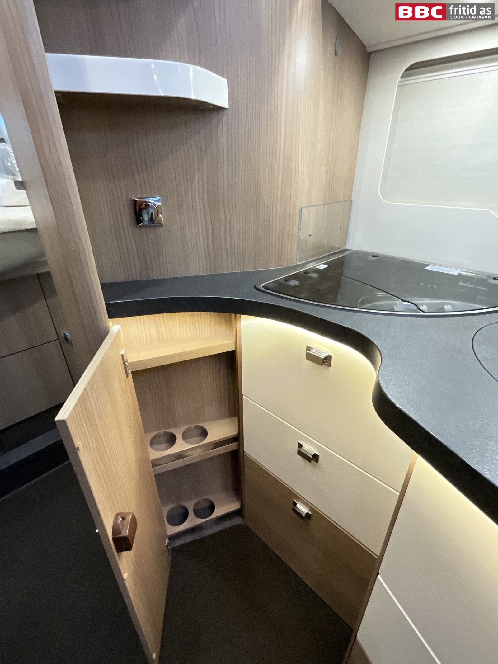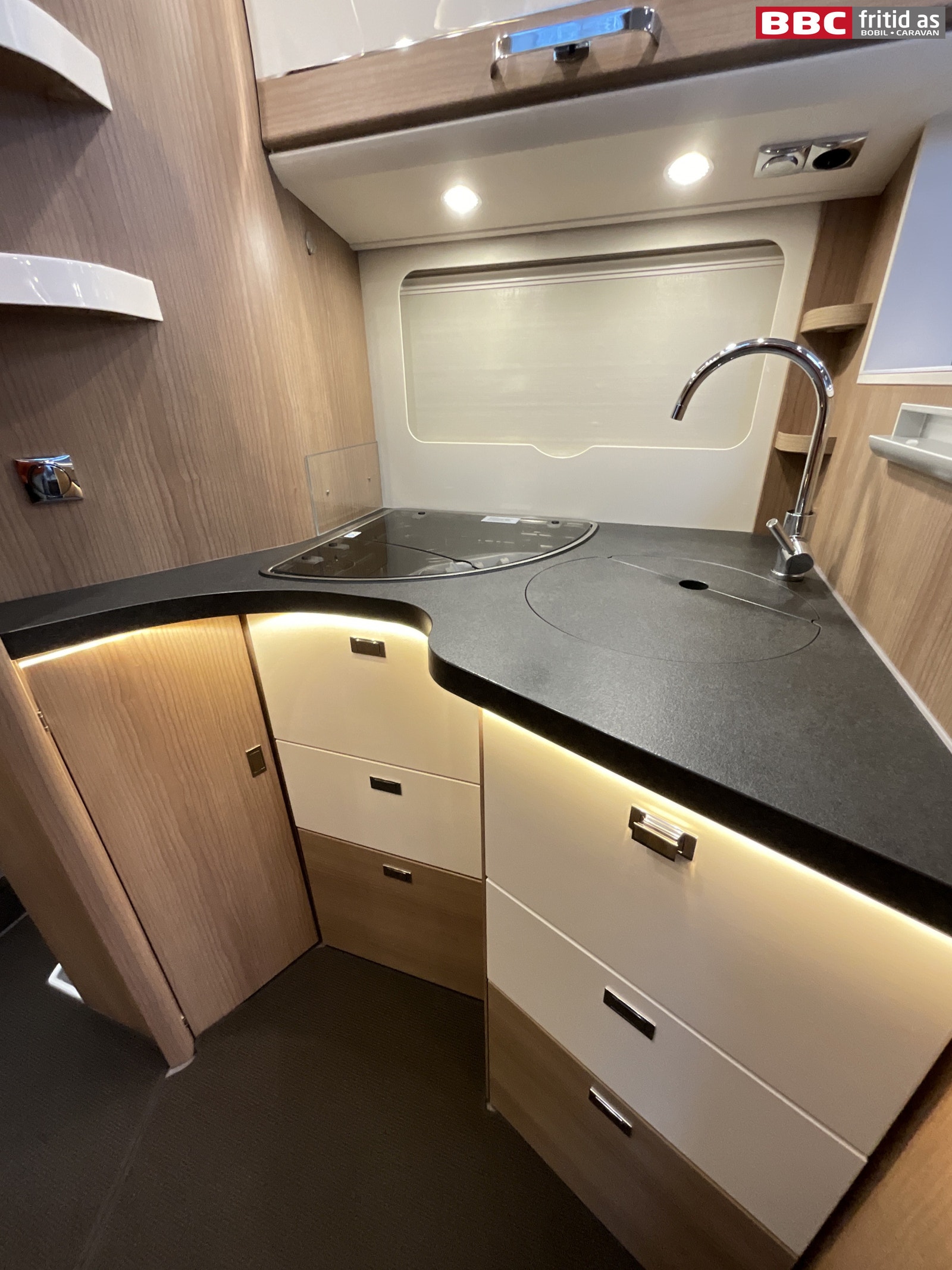 I kjøkkendelen er det en kjøkkenbenk med 3 kokebluss, vask, 1 stort overskap, 6 skuffer, 3 hyller og 1 uttrekk-skap. 3 taklys + 2 lys over benken. Kjøleskapet er et Dometic med separat fryseboks, og dørene kan åpnes både fra høyre og venstre etter behov. Stekeovn på toppen av kjøleskapet (gassdrevet). I taket er det montert en 12V-vifte som kan dra luften både inn og ut etter behov. 2 stk 23V-uttak på kjøkkenet.