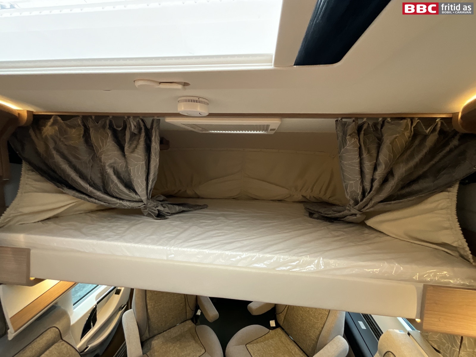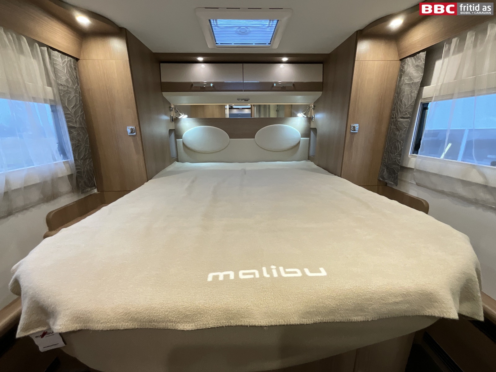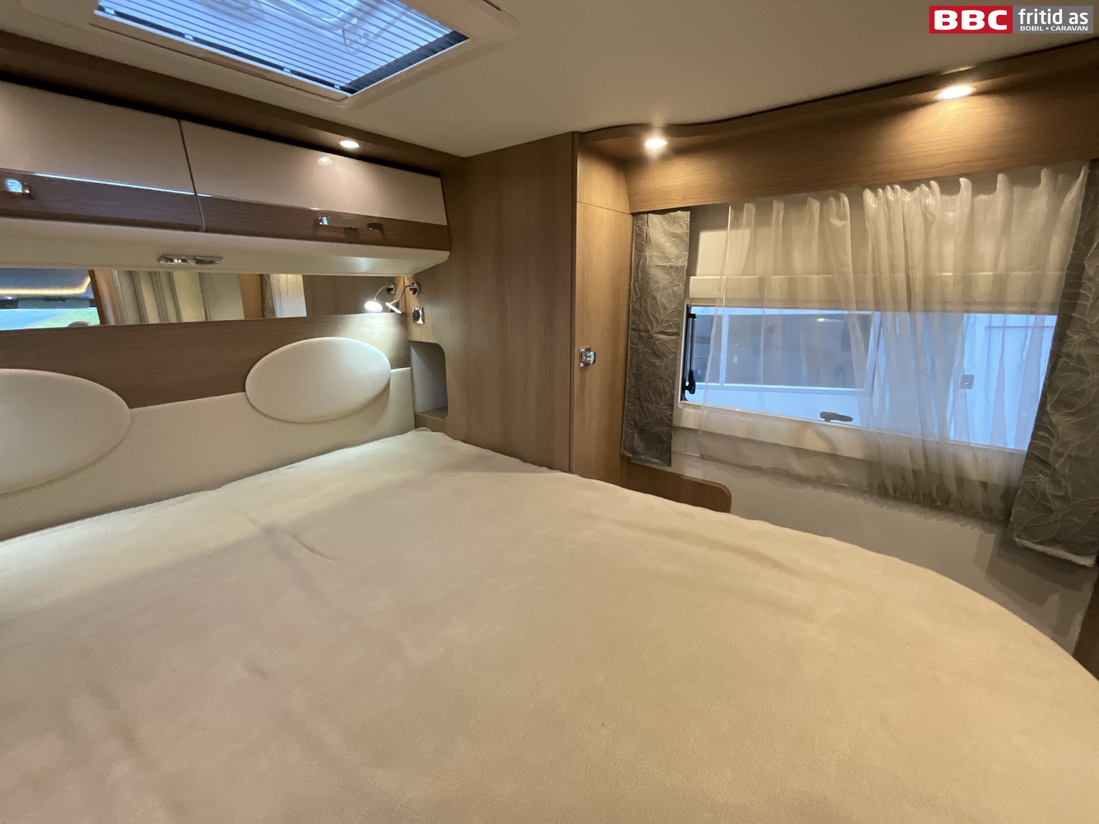 Bak i bilen er det en midtstilt dobbeltseng (QB) på 195 x 145 cm. Under sengen i fotenden er det 2 store skuffer + 2 store skap for oppbevaring. Ellers er det også 2 overskap, 2 hyller, 2 sideskap på ca 110 x 36 cm, 2 leselys, 9 taklys, 3 stk USB-uttak, takluke på 40 x 40 cm, 2 vinduer, langt speil i hodeende på ca 140 x 15 cm.
