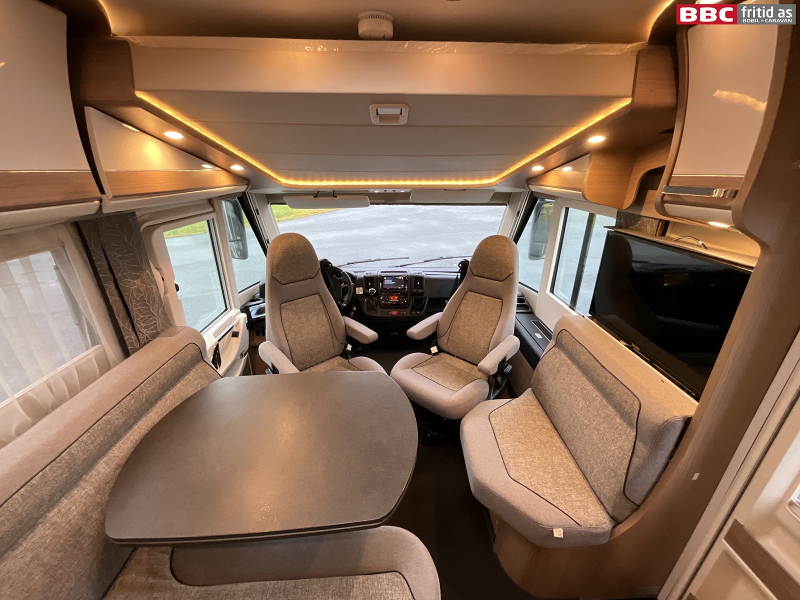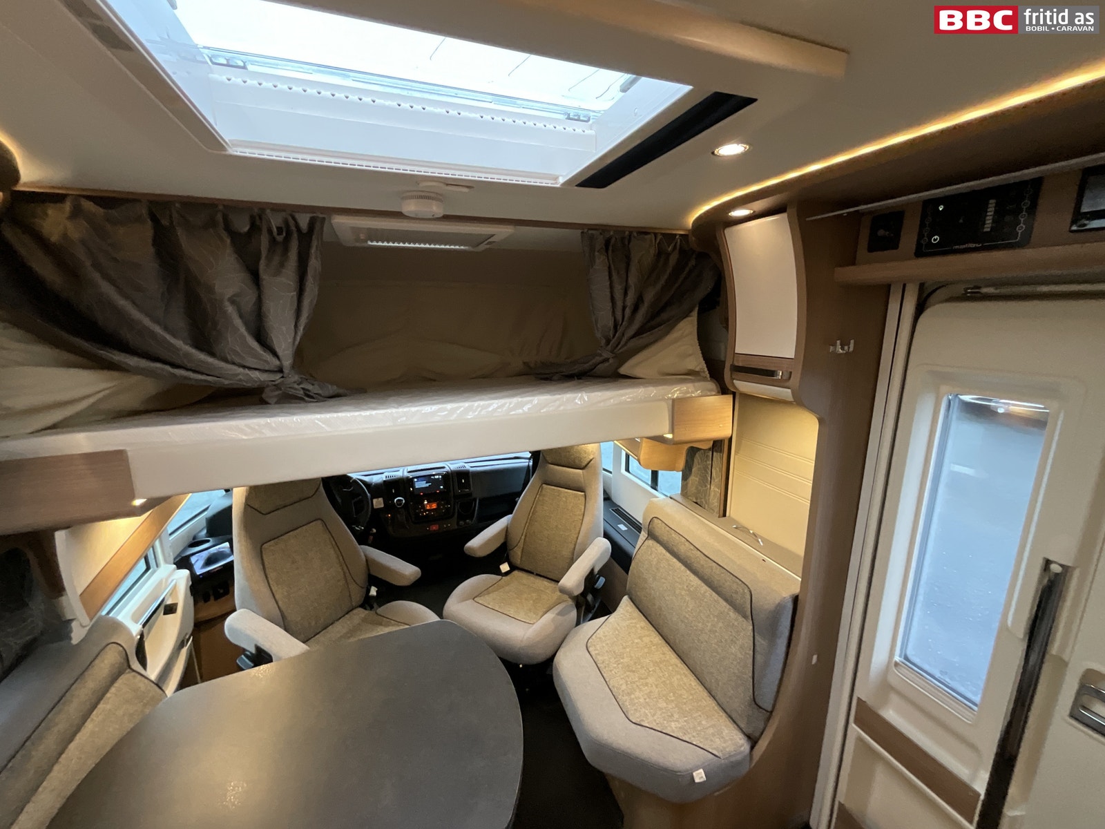Her er det en romslig L-salong i pene farger. Sidesitteren rett innenfor bodelsdøren er 65 cm bred. Bordet er justerbart, og måler 93 x 67 cm og kan høydejusteres. Det er 2 store overskap, 4 stk USB-uttak, 8 taklys, 3 lys under overskapene, stor takluke på 40 x 60 cm, originale formsydde tepper i hele bilen, vindu i bodelsdøren + myggdør. Foran er det også en senkeseng på ca 140 x 190 cm. TV er montert bak ryggen på sidesitteren. Det er en Alphatronic på 32″.