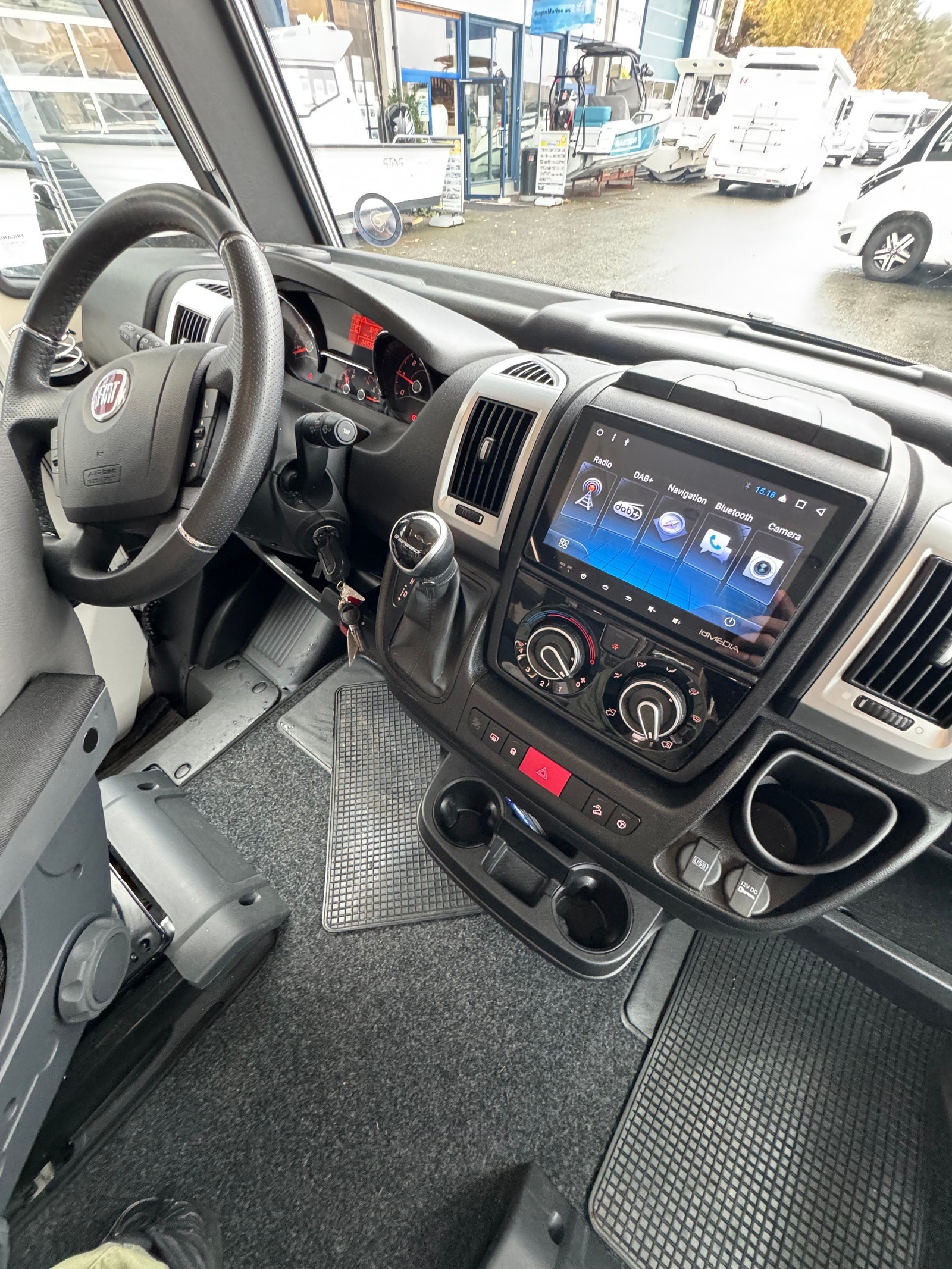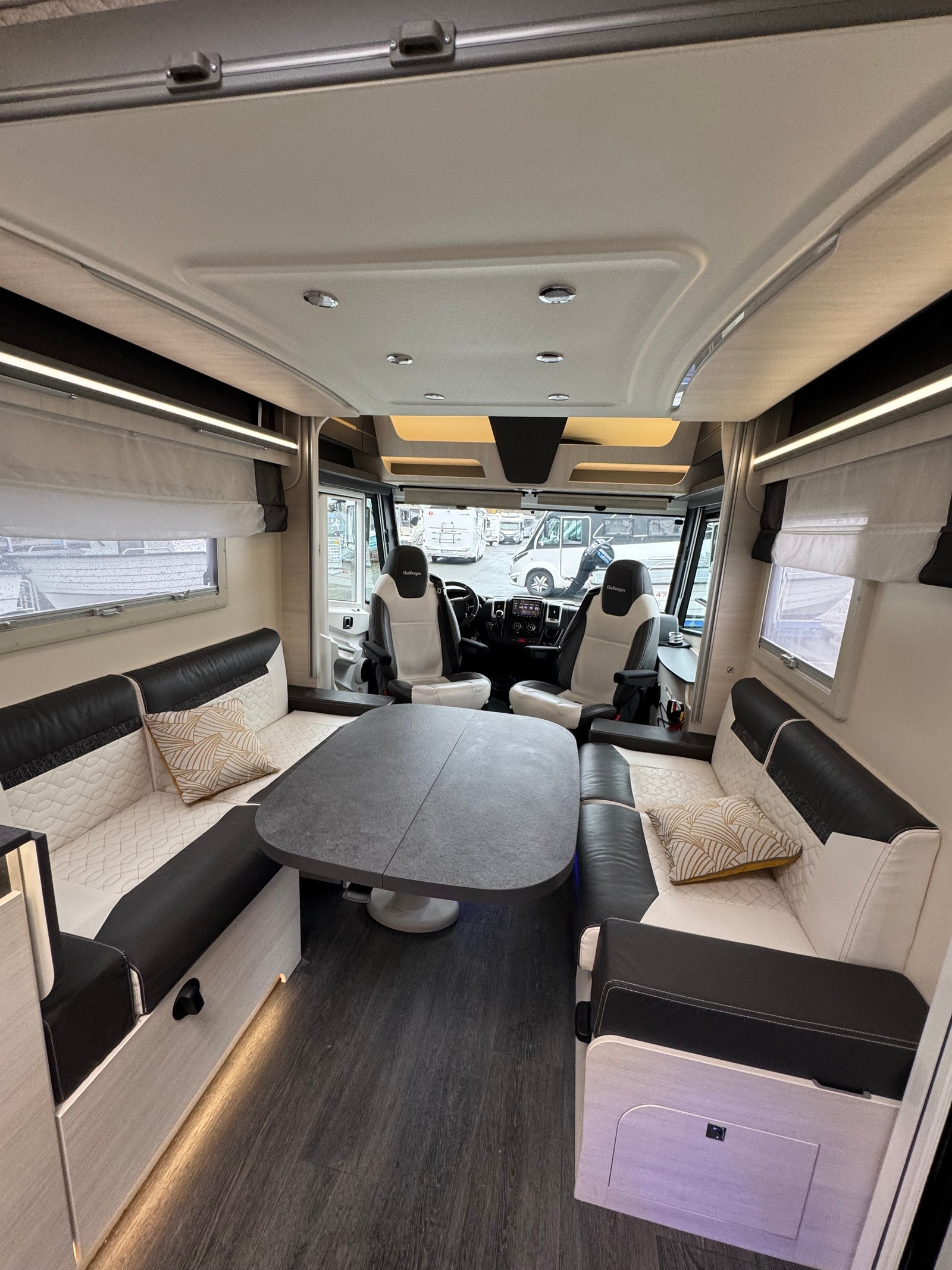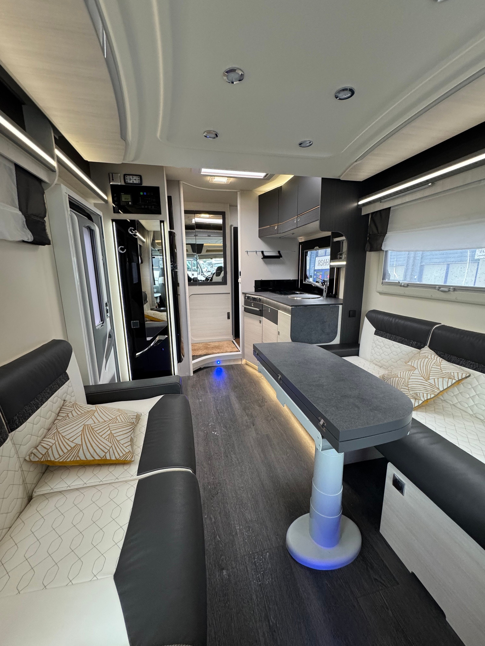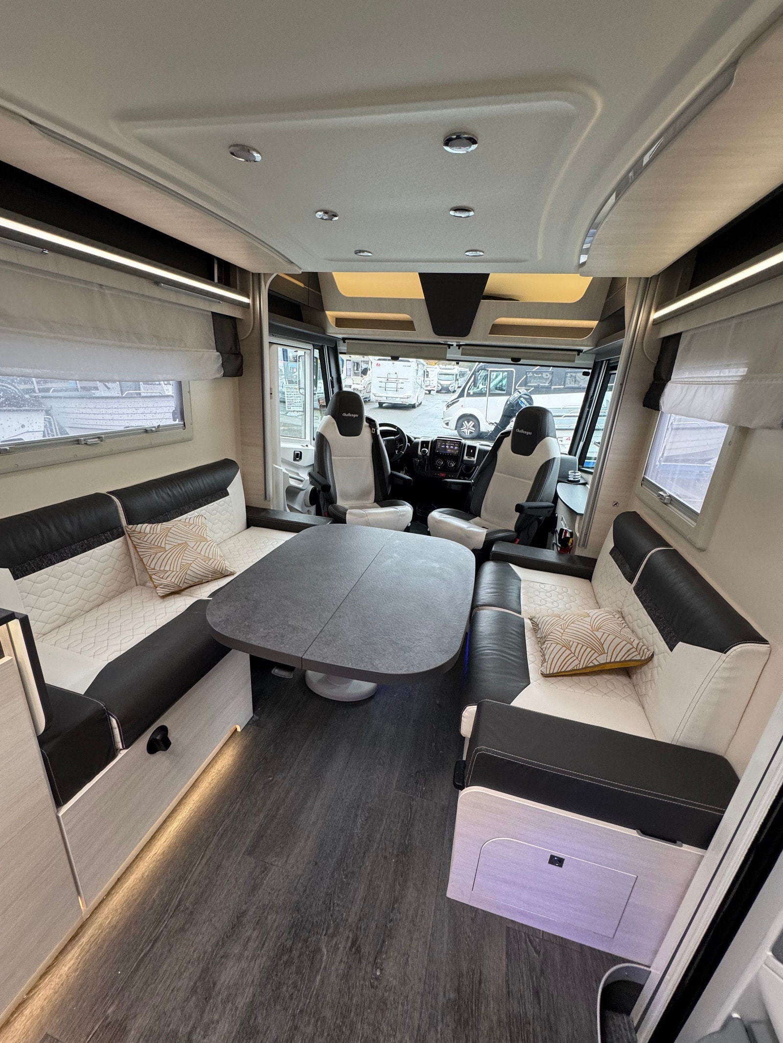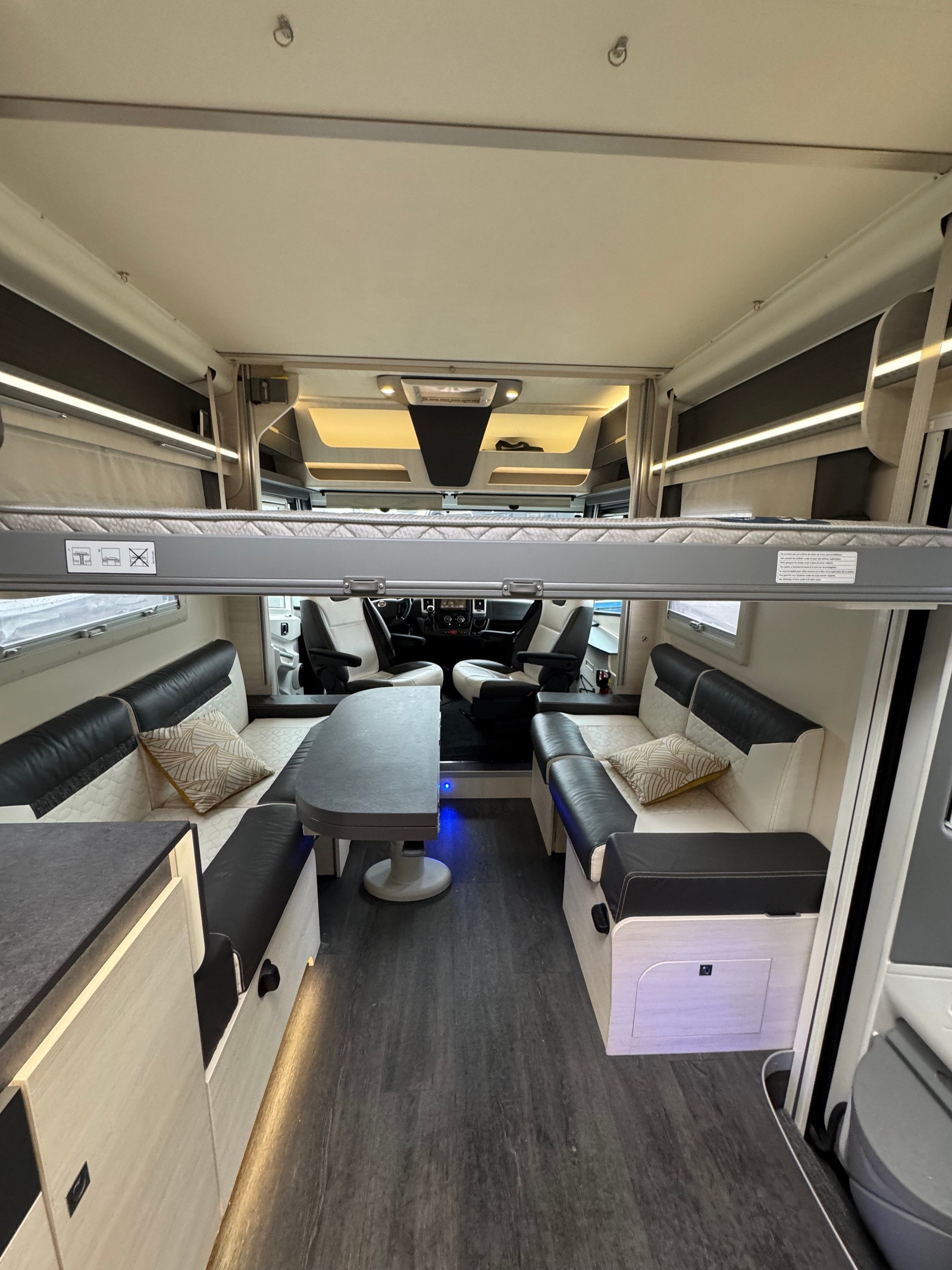 Dette er nok en av våre mest romslige salonger, av bobiler vi har for salg hos oss. Må oppleves!  Stoler i front kan snues rundt om ønskelig. 2 passasjerstoler som kan vippes opp etter behov, disse er også ustyrt med iso-fix.
