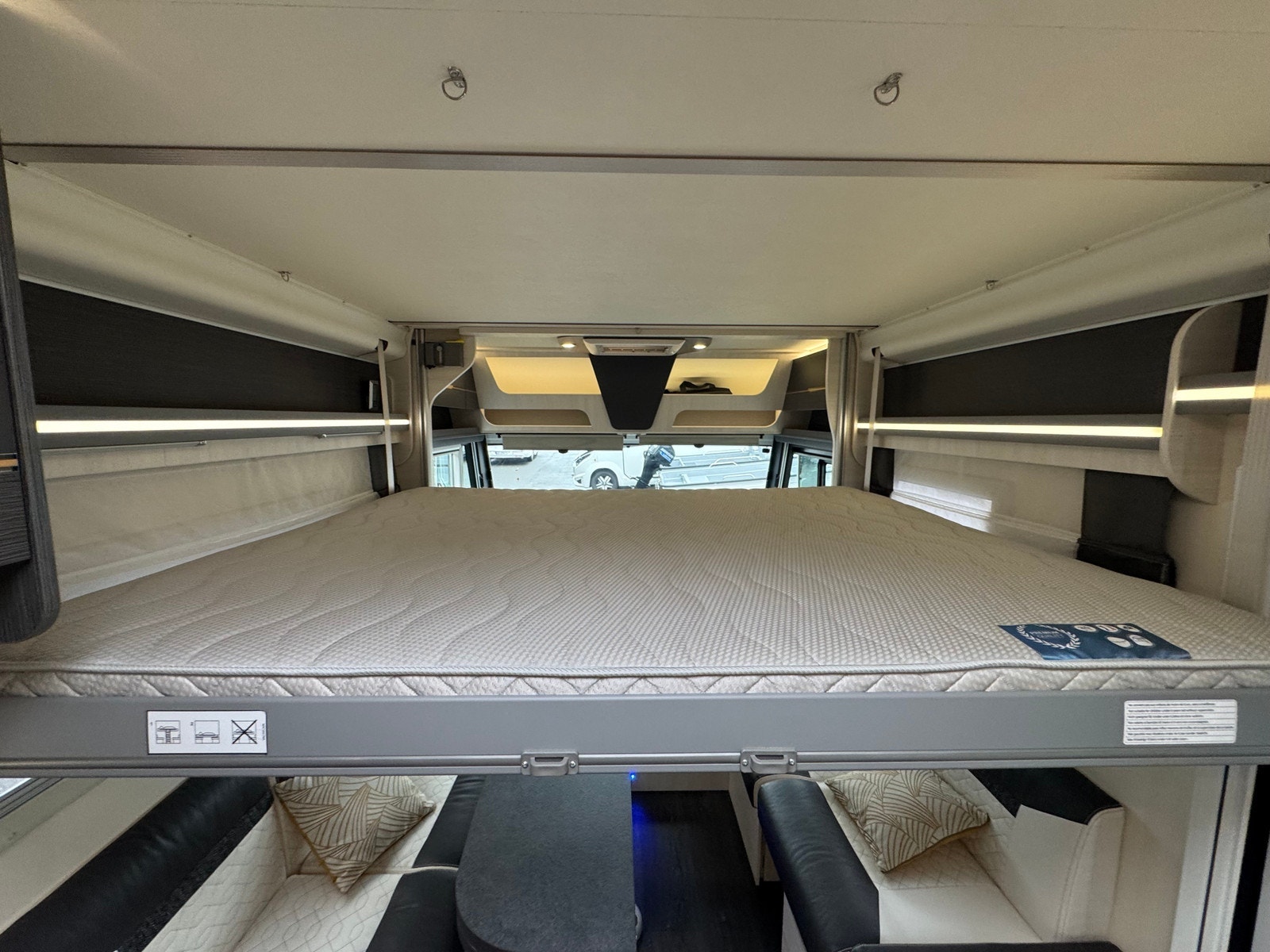 Denne modellen har en stor elektrisk takseng som kan senkes ned over salongbord.  Salong kan også gjøres om til seng v/behov. Meget smidig løsning!