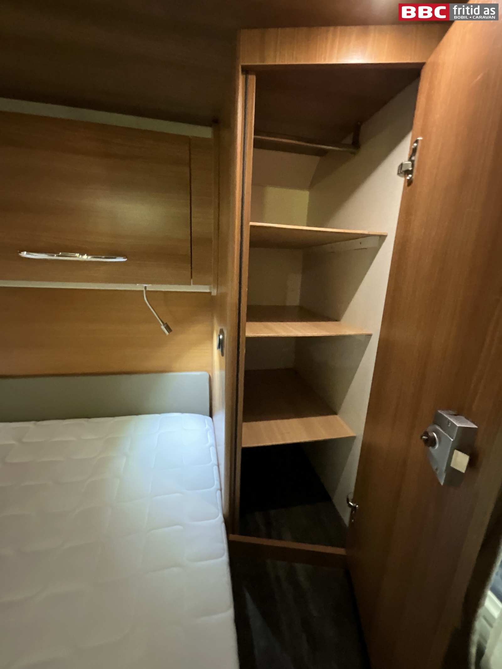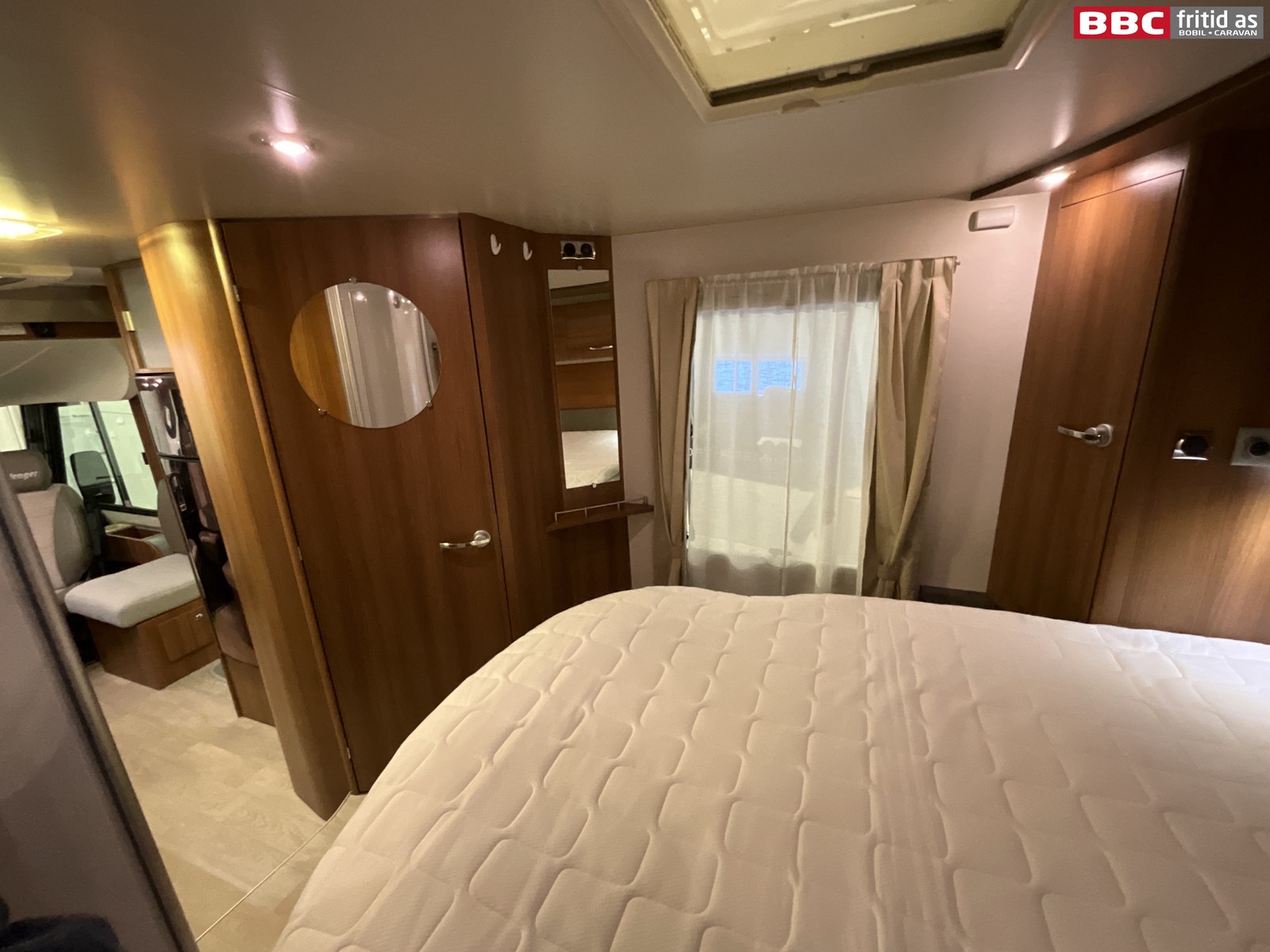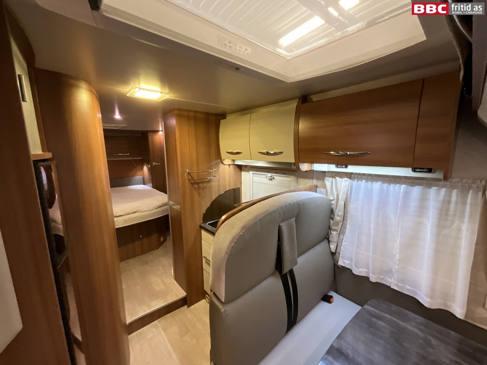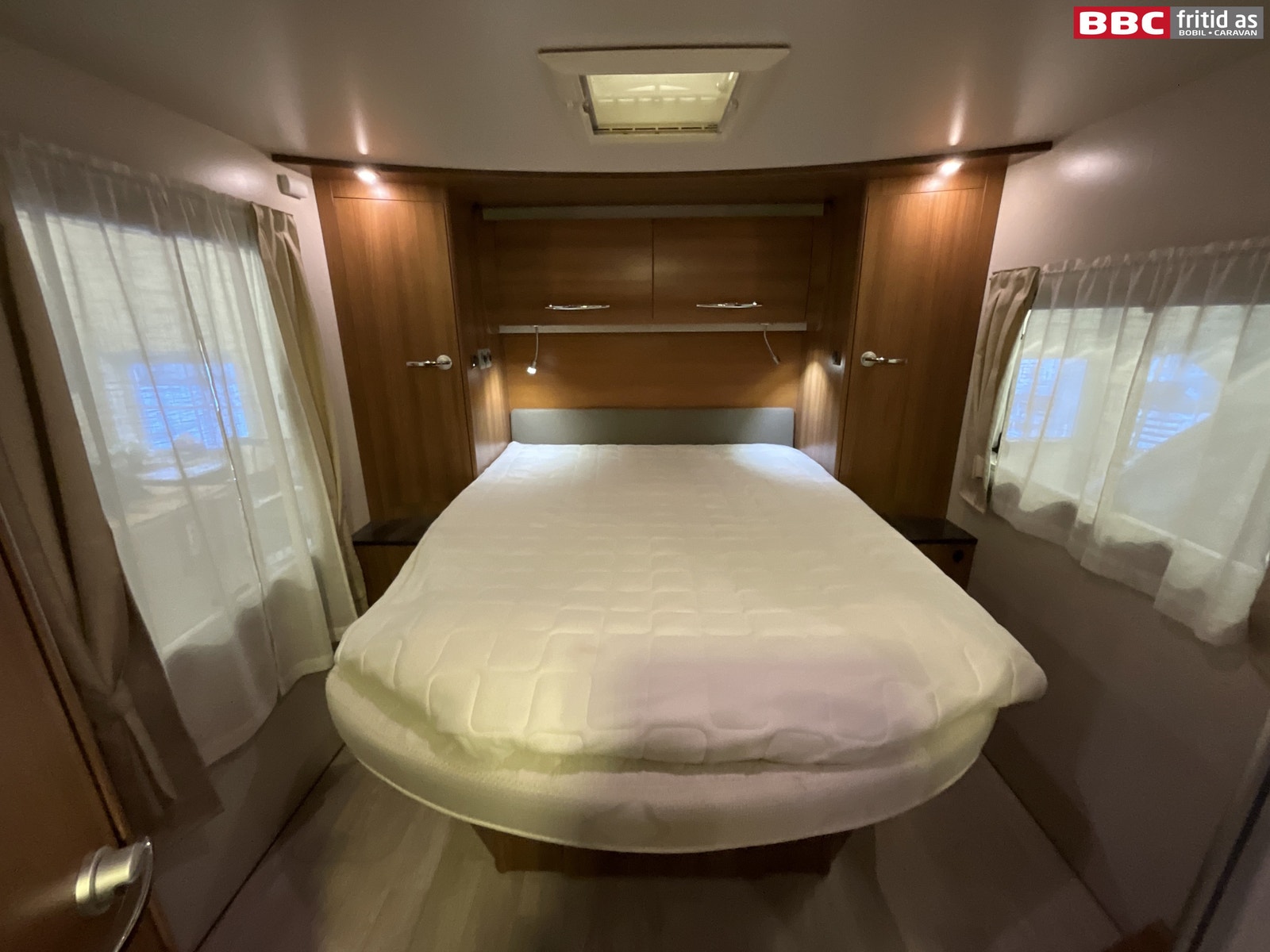 Bakerst i bilen er det en midtstilt dobbeltseng på ca 190 x 140 cm. Lagringsplass under sengen i fotenden. 2 overskap og 2 sideskap på ca 120 x 35 cm hver. 2 leselys, 3 taklys, 2 stk 12V-uttak og en takluke på 40 x 40 cm. 1 speil på 80 x 20 cm i det ene hjørnet + noen praktiske hyller.