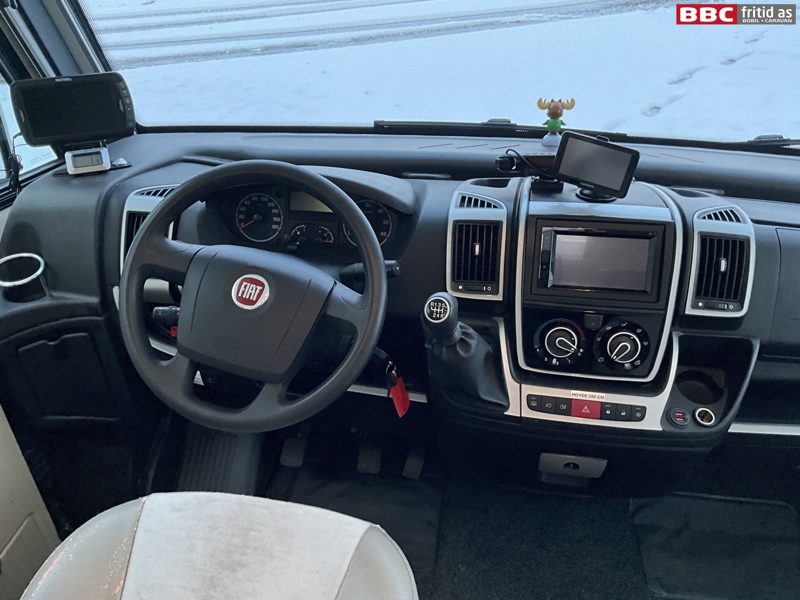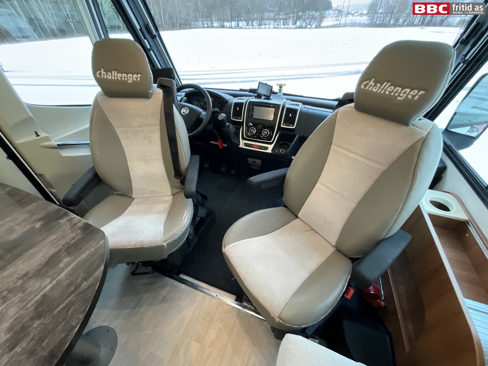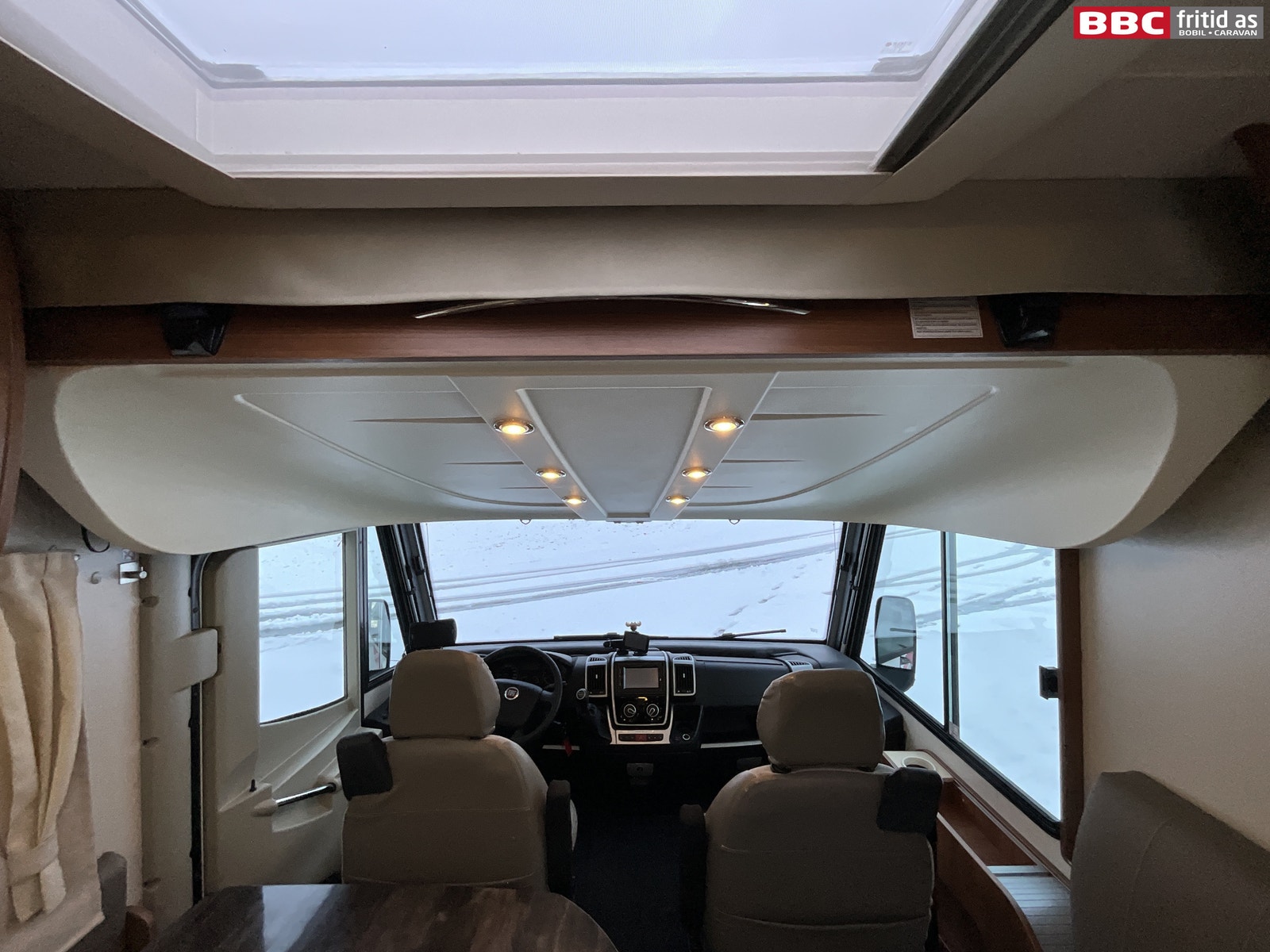 Fremme i bilen er det 2 gode justerbare fremseter. Det er flere koppholdere, 12V og USB-uttak, en Pioneer 2-din DAB+ radio med bluetooth og handsfree. Egen Garmin navigsjon oppe på dashbordet. Separat stor skjerm for ryggekamera til venstre for rattet. Elektriske speil og vinduer, Remis blending på alle ruter foran, og 6 taklys. Det er også montert et dashboard-kamera i bilen.