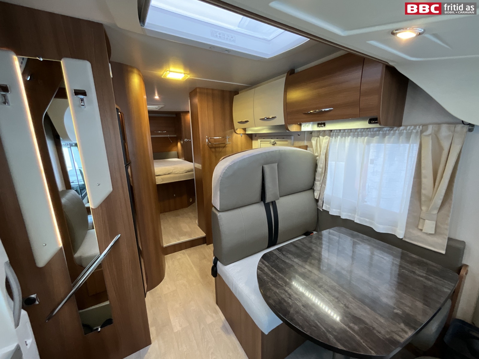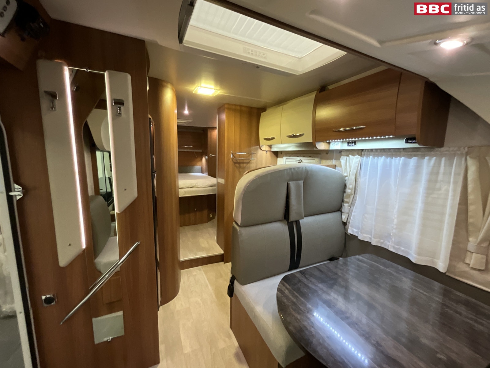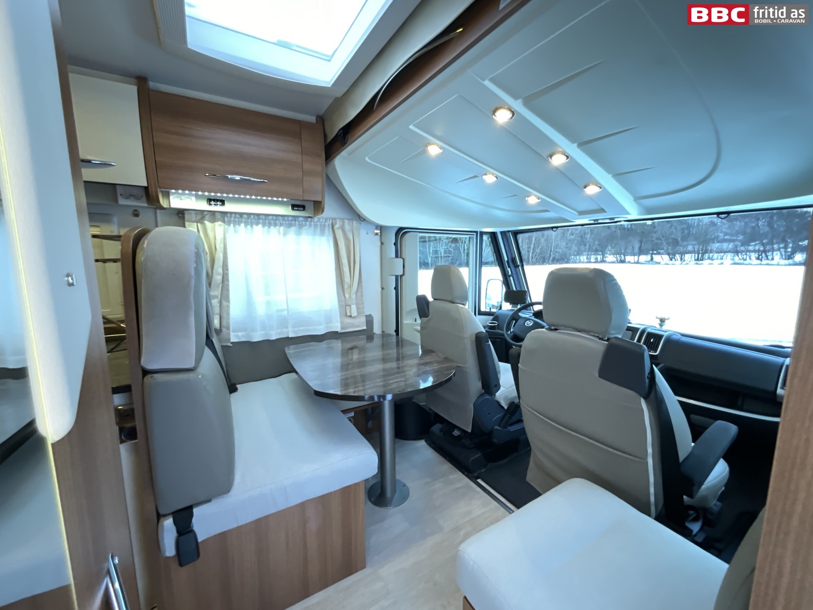 Romslig salonggruppe med 2-seter, sidesitter på ca 50 cm og 2 vendbare fremseter. Bordet måler 95 x 70 cm og kan justeres mtp plassering. Det er 1 stort overskap med ledstripe under, 2 stk 230V og 6 stk USB-uttak for lading av div utstyr. 6 taklys, stor takluke på ca 90 x 55 cm lysåpning, vindu i bodelsdøren, TV montert i eget skap over kjøleskapet og et praktisk speil rett innenfor bodelsdøren på 150 x 15 cm. Stor senkeseng i front på ca 140 x 200 cm som er veldig lett å dra ned/opp.