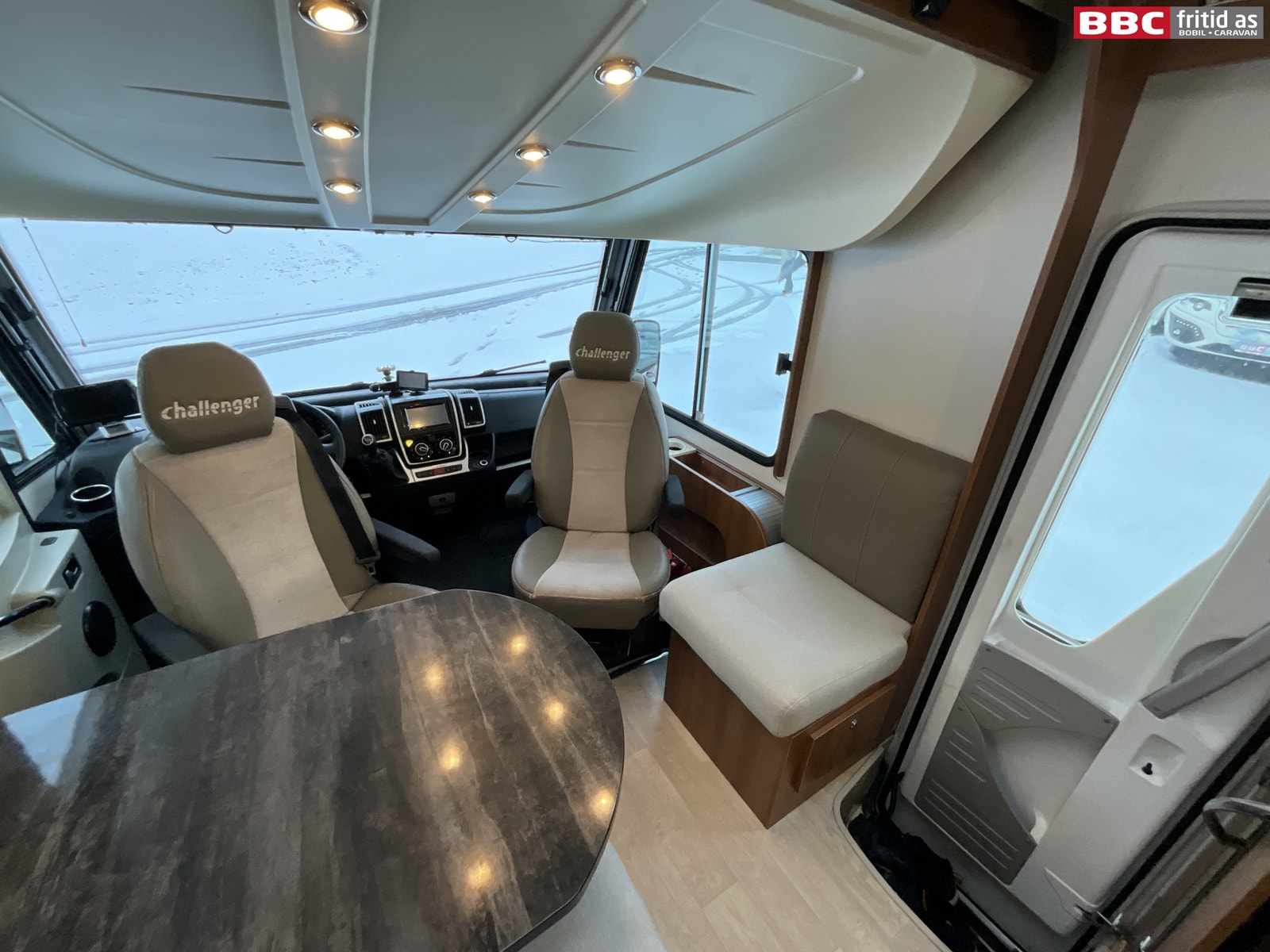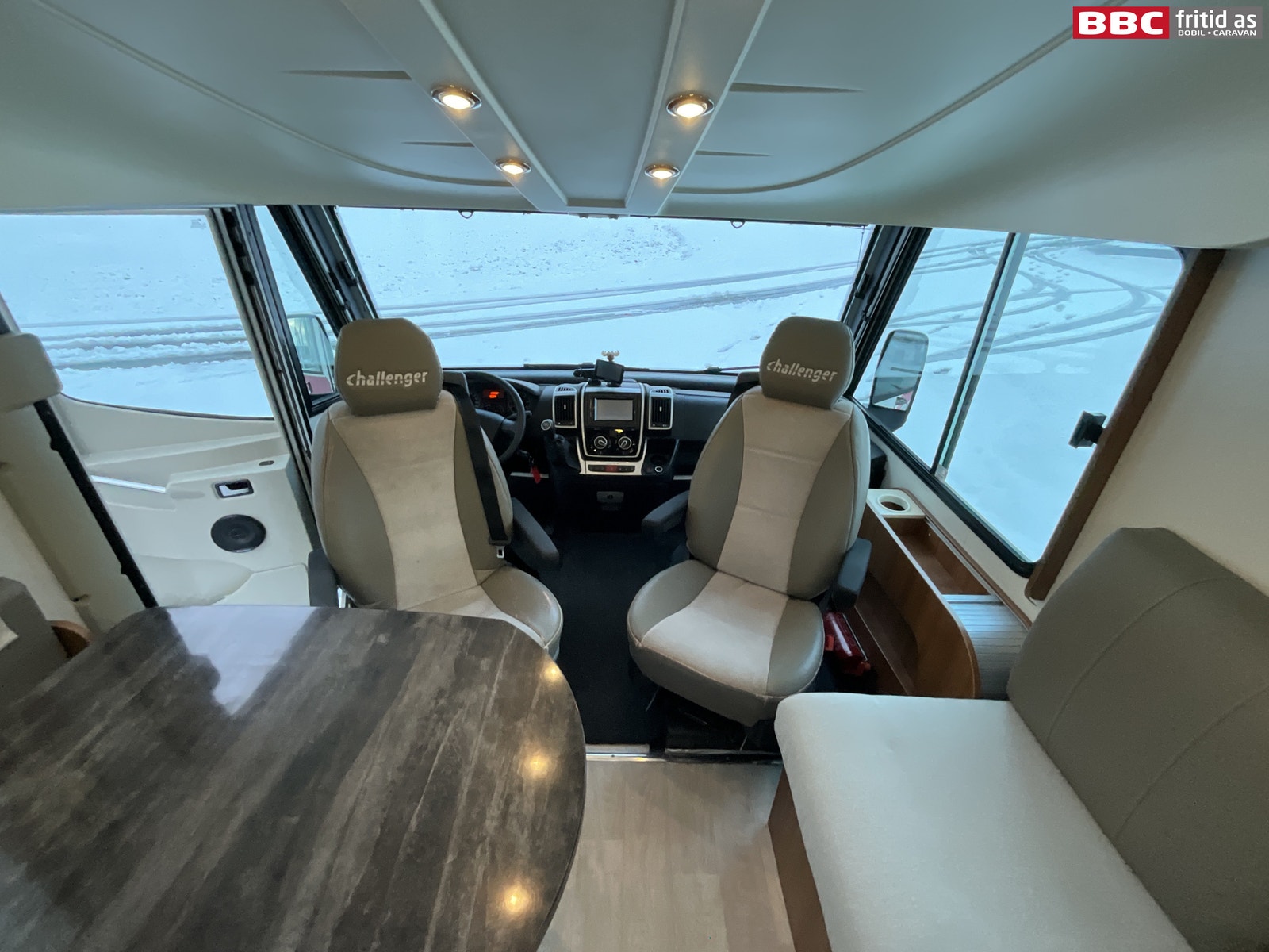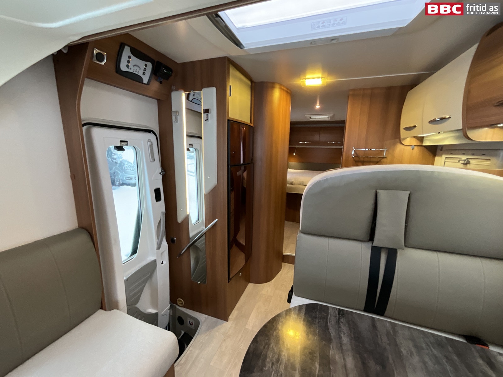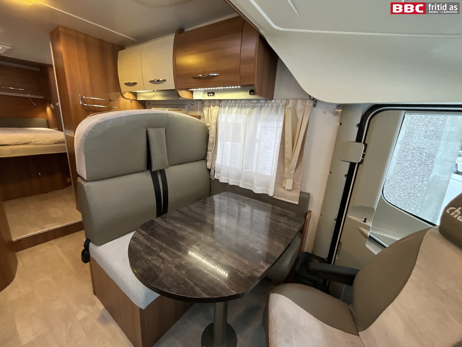 Romslig salonggruppe med 2-seter, sidesitter på ca 50 cm og 2 vendbare fremseter. Bordet måler 95 x 70 cm og kan justeres mtp plassering. Det er 1 stort overskap med ledstripe under, 2 stk 230V og 6 stk USB-uttak for lading av div utstyr. 6 taklys, stor takluke på ca 90 x 55 cm lysåpning, vindu i bodelsdøren, TV montert i eget skap over kjøleskapet og et praktisk speil rett innenfor bodelsdøren på 150 x 15 cm. Stor senkeseng i front på ca 140 x 200 cm som er veldig lett å dra ned/opp.