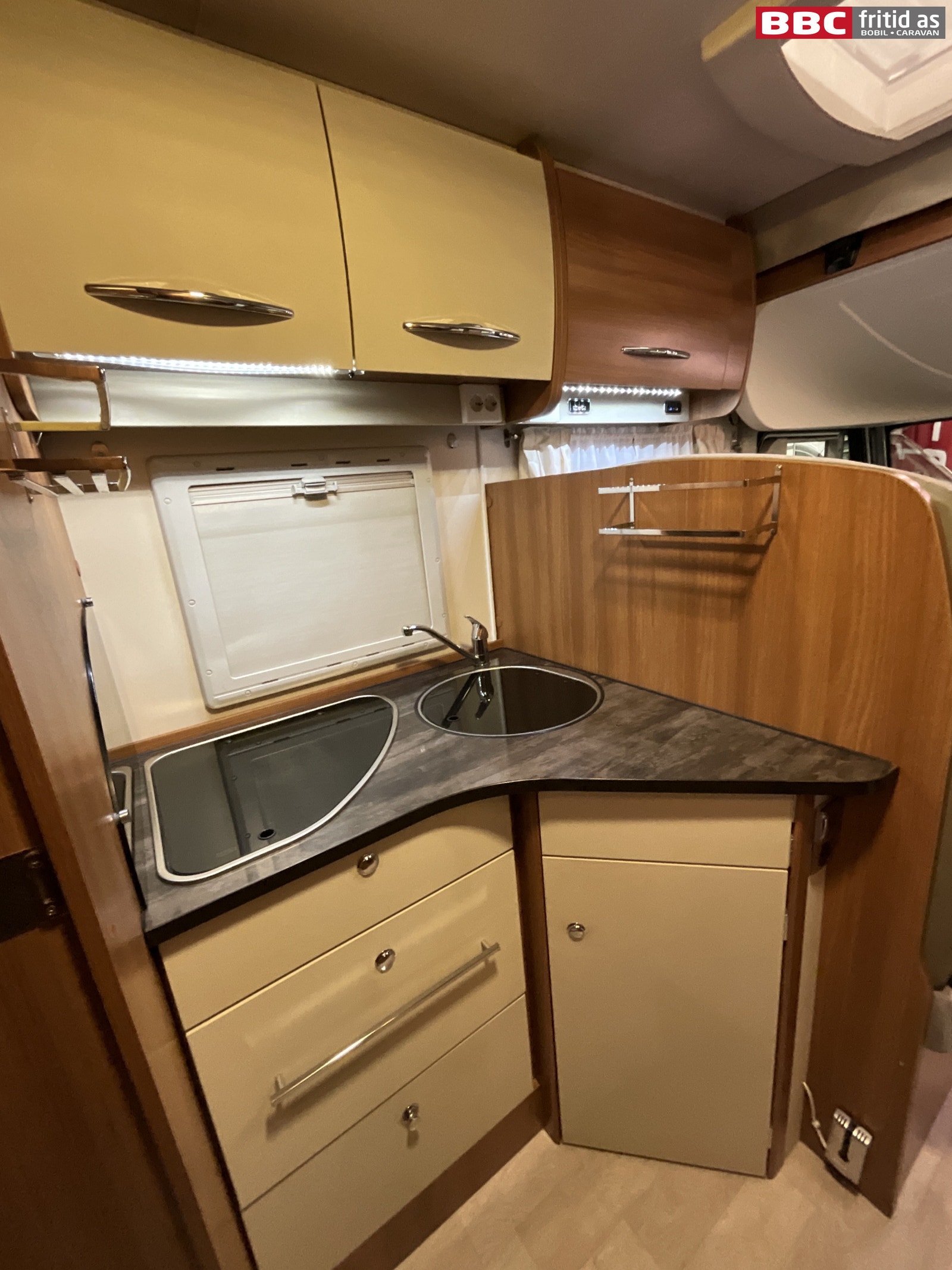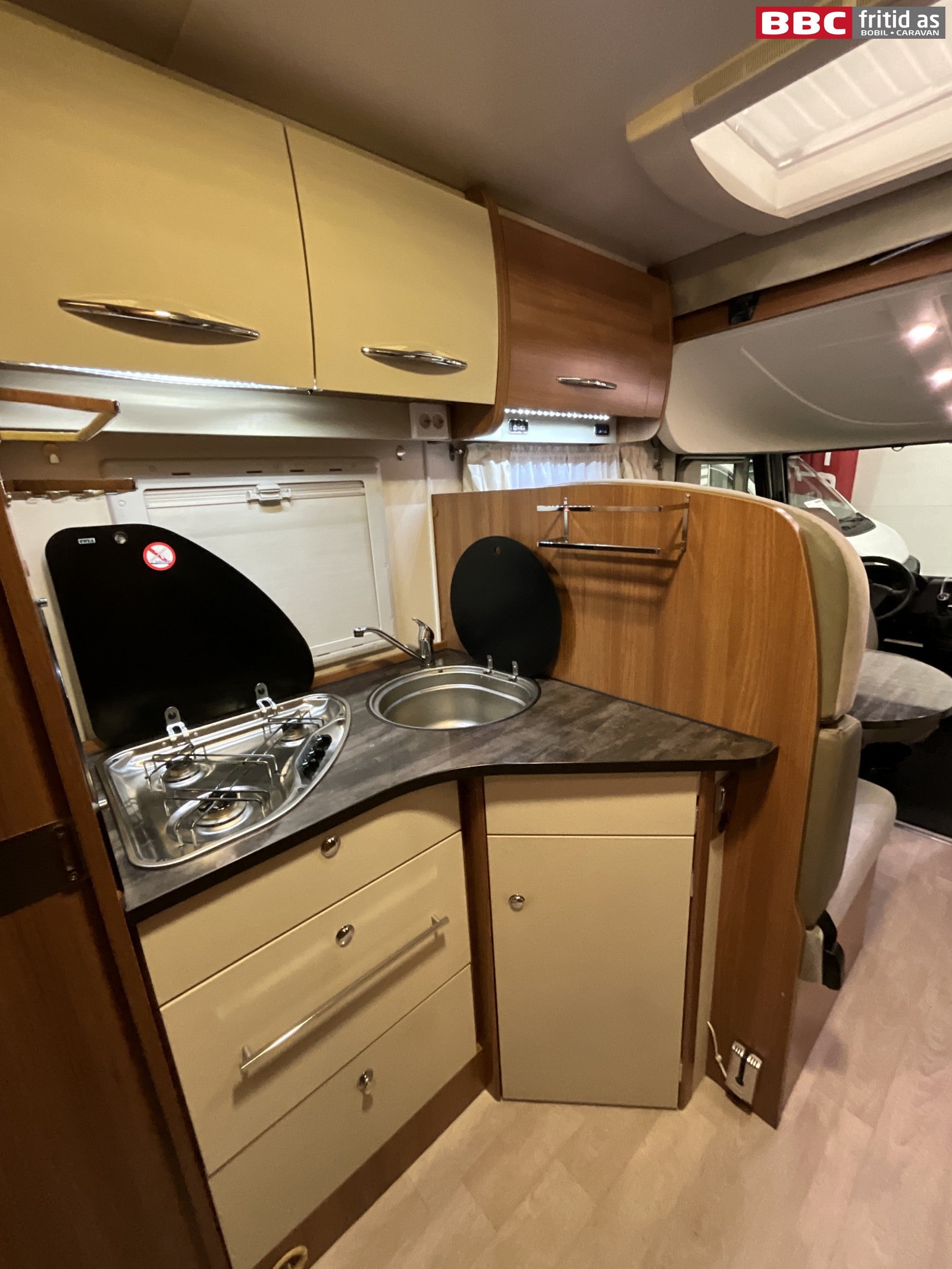 I kjøkkendelen finner du 3 kokebluss, vask, 2 overskap, 2 skuffer, 2 underskap og 2 hyller. Lys under overskapet og 1 taklys. Kjøleskapet er et Dometic med separat fryseboks. Totalt 3 stk 230V og 1 stk 12V-uttak ved kjøkkenbenken. Dør kan stenges av inn mot bad/soverom.