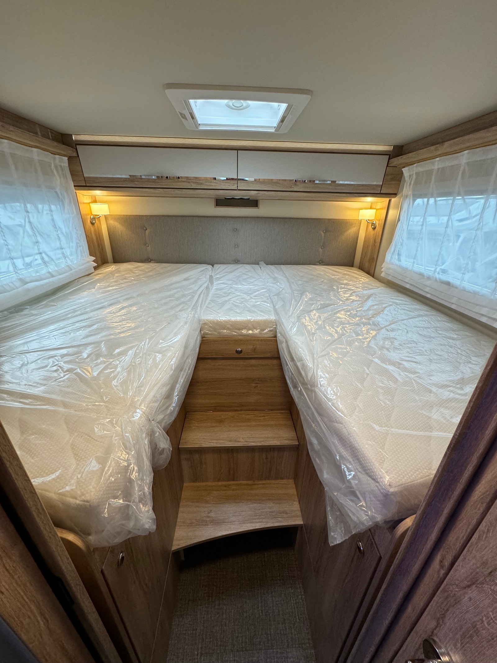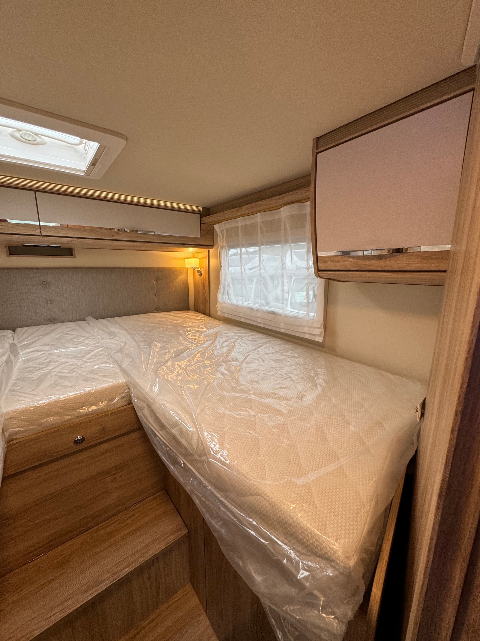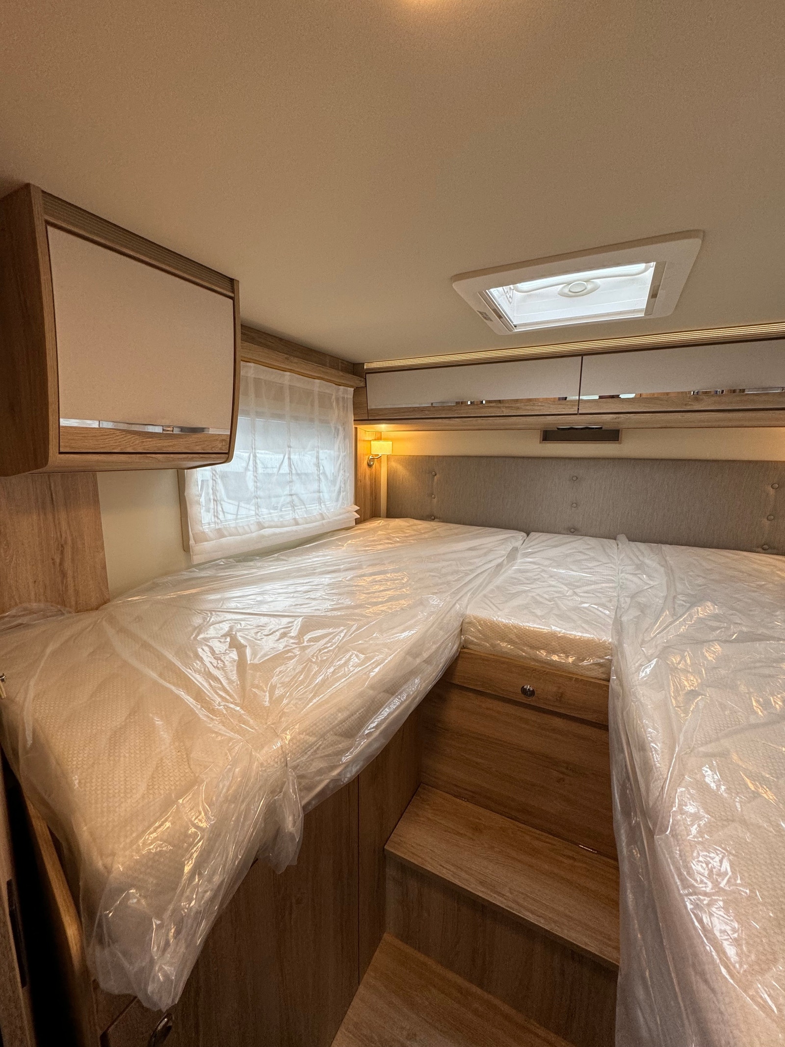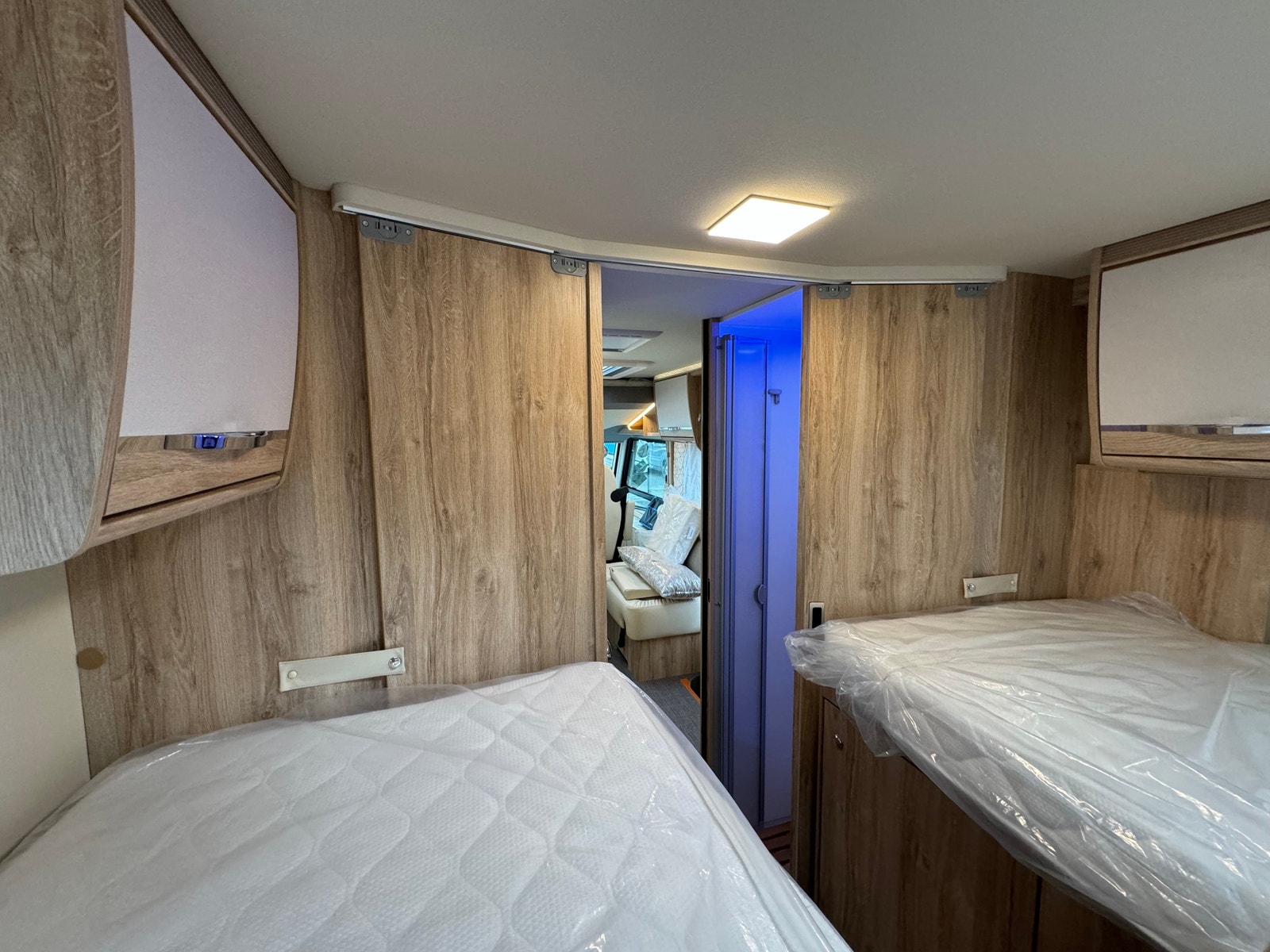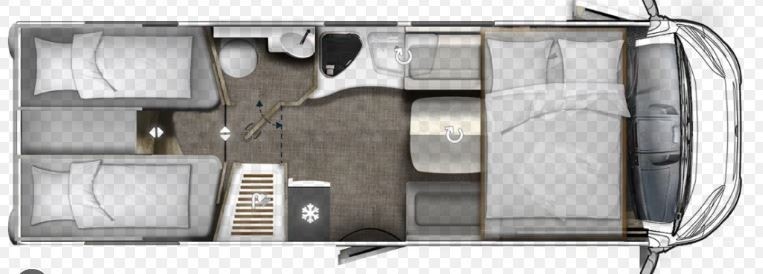 Bak i bilen er det to enkle senger, som lett kan gjøres om til stor dobbelseng.  Det er godt med skapplass under og over seg. I tillegg så har denne modellen stor garasjeplass med plass til sykler om ønskelig.