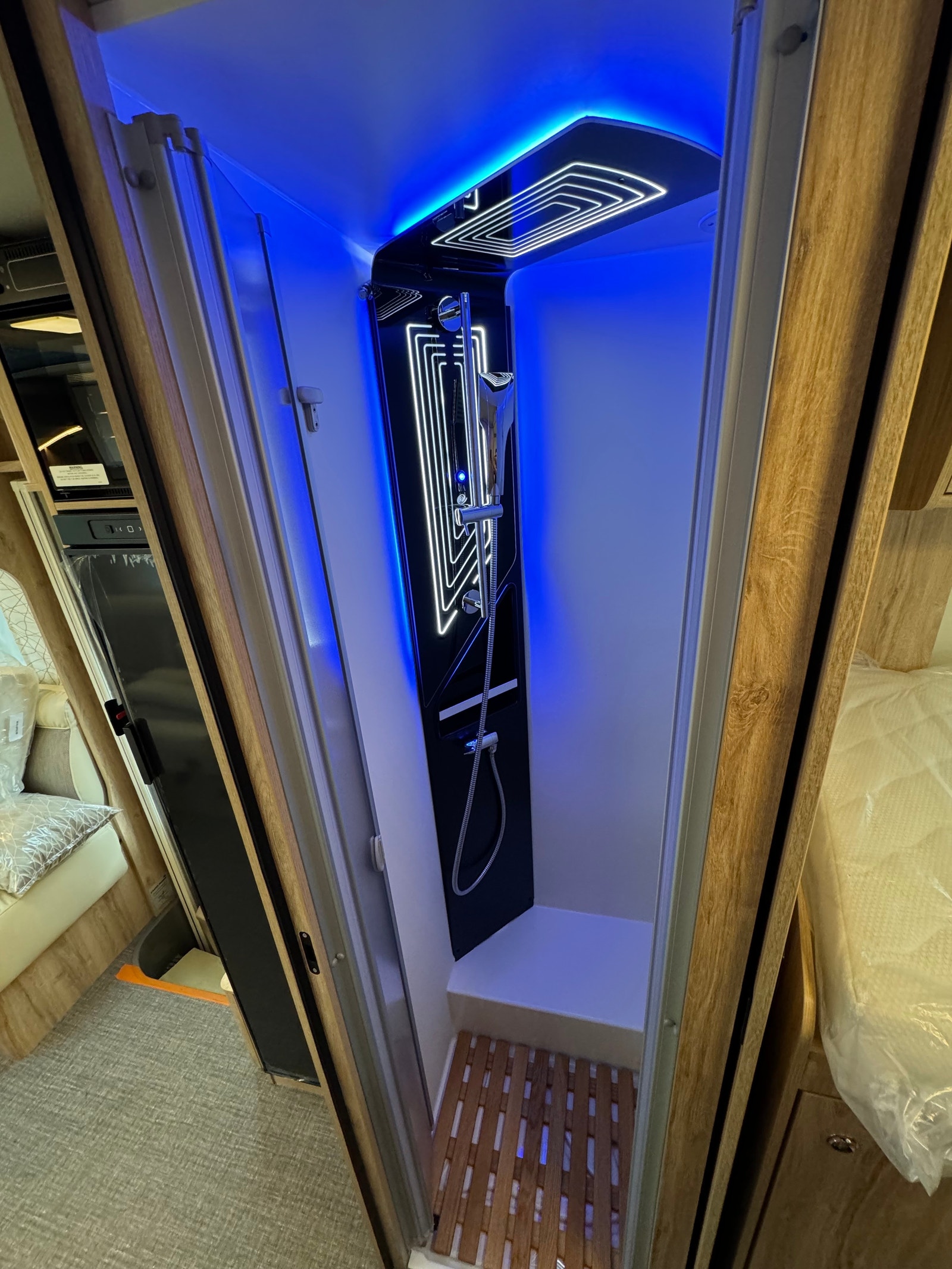 Separert dusj og toalett, det er mulig å lukke igjen skyvedør bak mot soverom i tillegg til å lukke igjen dør frem mot kjøkken. Bad kan med andre ord være helt avlukket.
