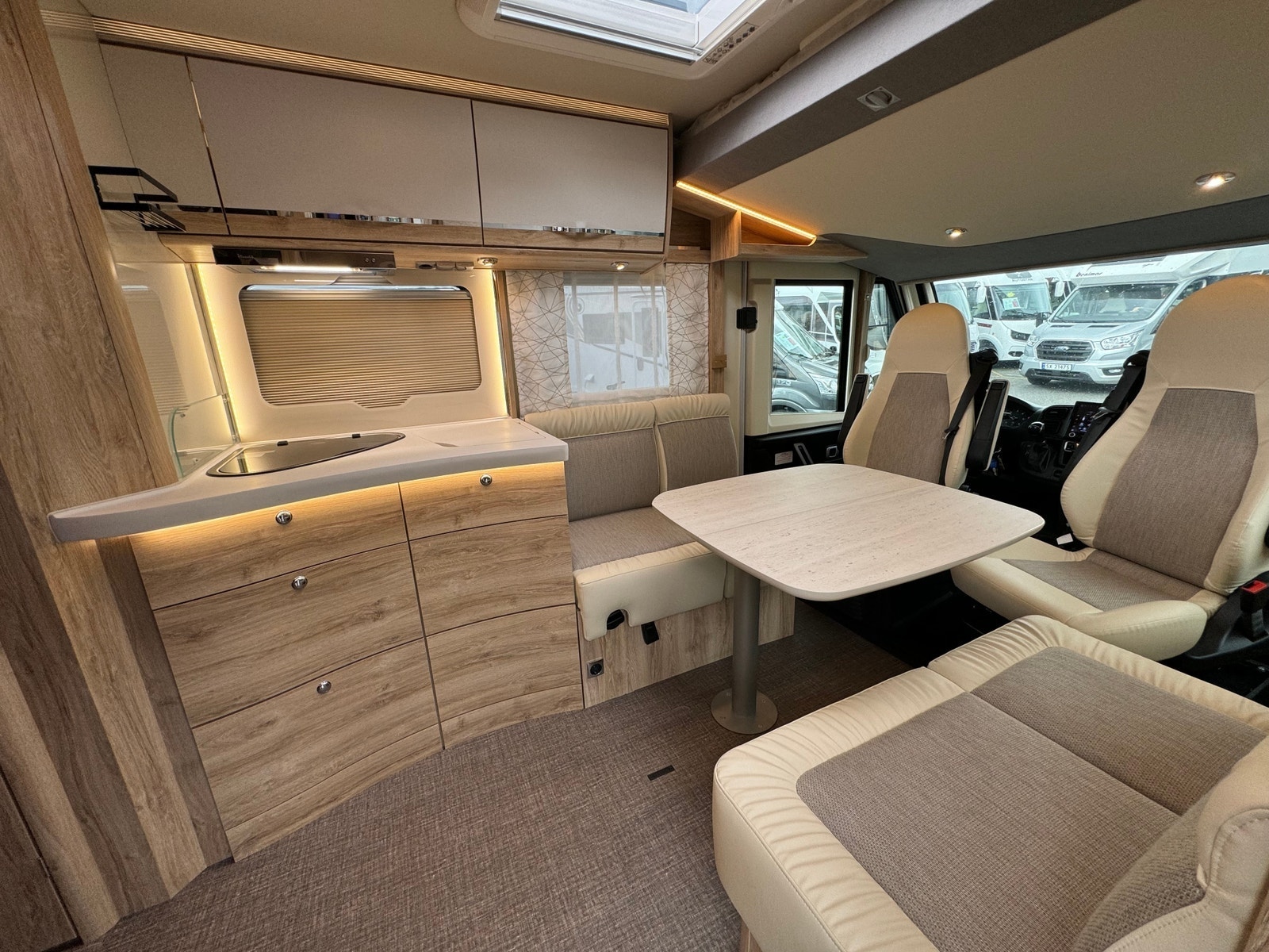 Romslig face-2-face salong med vendbare pilotstoler i front. Det også mulig å trekke ned dobbelseng over førerhus. Må sees!