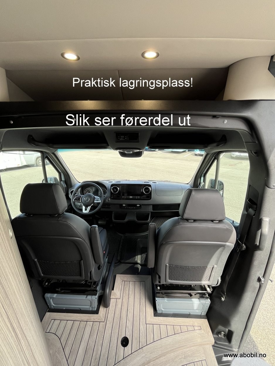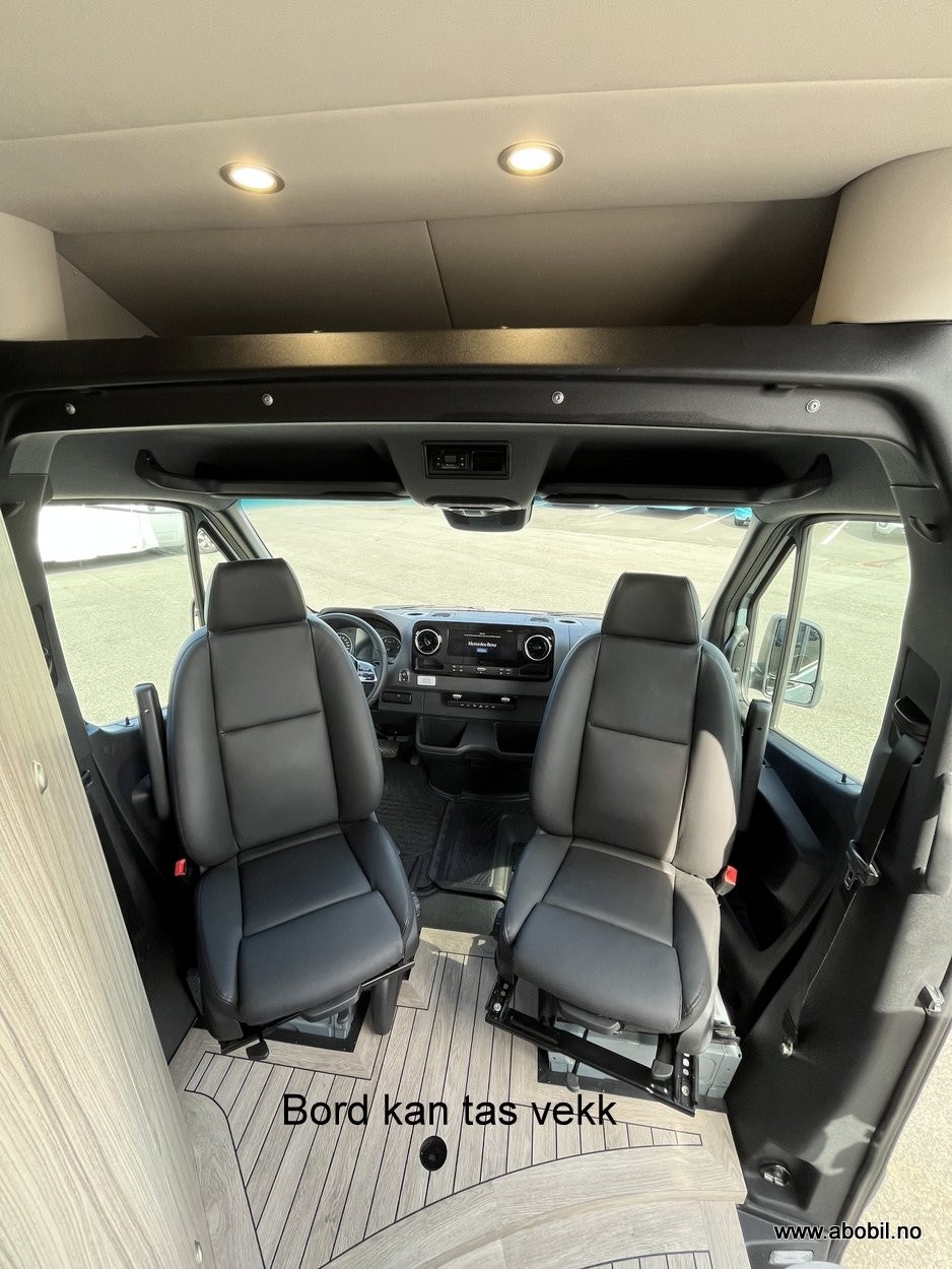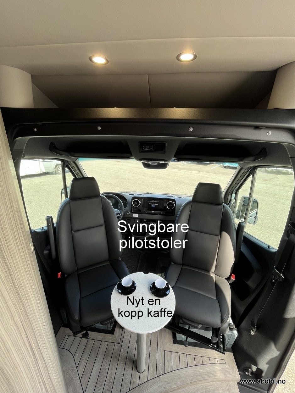 I fremre del finner du 2 komfortable pilotstoler med et mulighet for å plassere et medfølgende kaffebord i samme tøffe kvalitet som resten av benkeplatene.