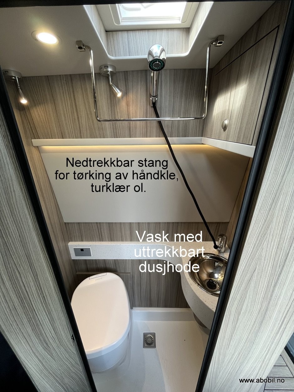 Selvsagt har du alle de komfortable fasilitetene en bybobil skal ha som; Toalett, Dusj inne og ute, kjøkken, Solcellepanel , Truma varmeapparat og masse mer!