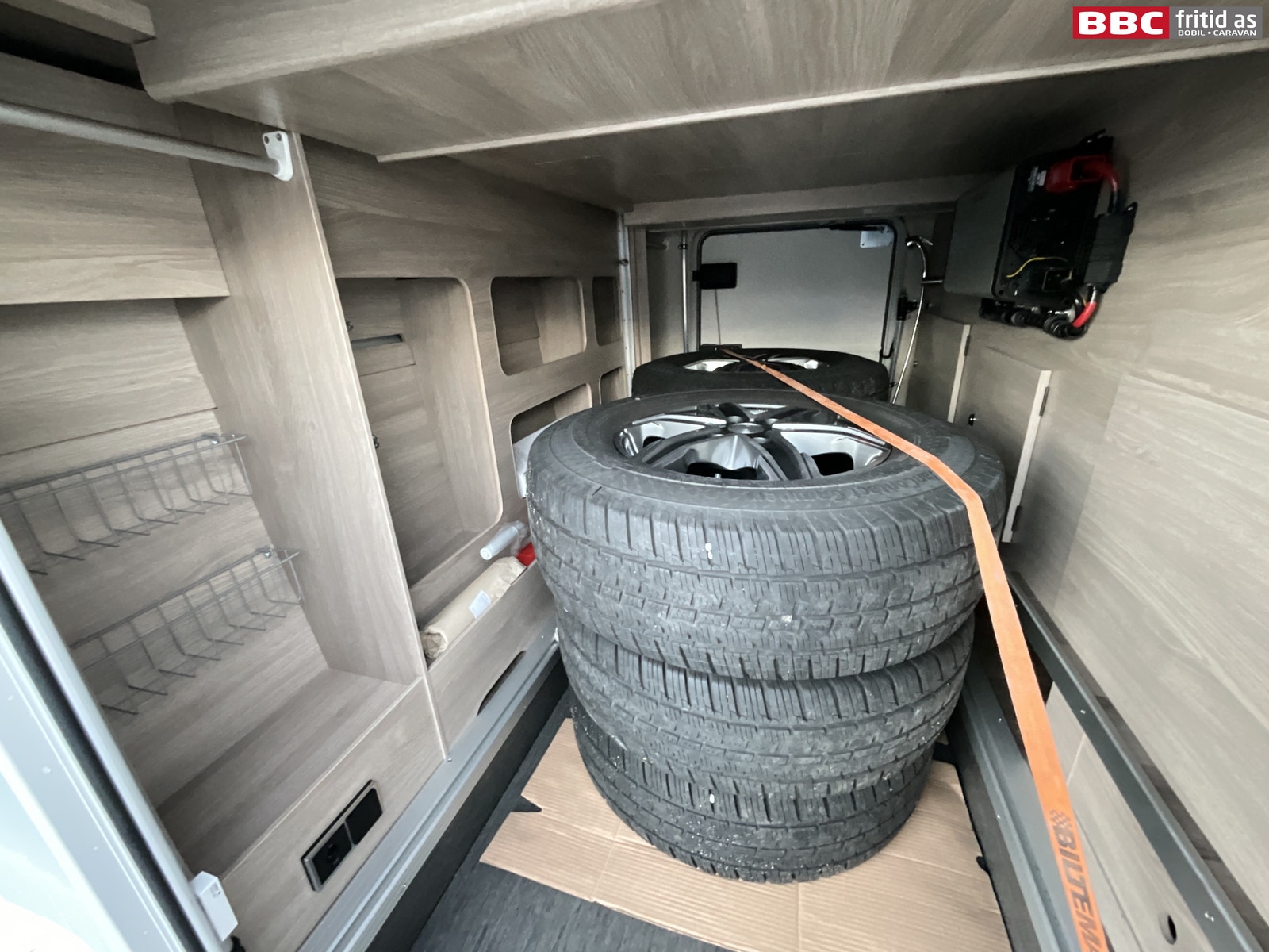 Store lasteromsdører på begge sidene av bilen på 105 x 77 cm. 230V og 12V-uttak, utedusj i lasterommet, ledstripe for belysning i rommet, surrekroker for sikring av last, varme i rommet og egen hovedbryter for all strøm i bilen.