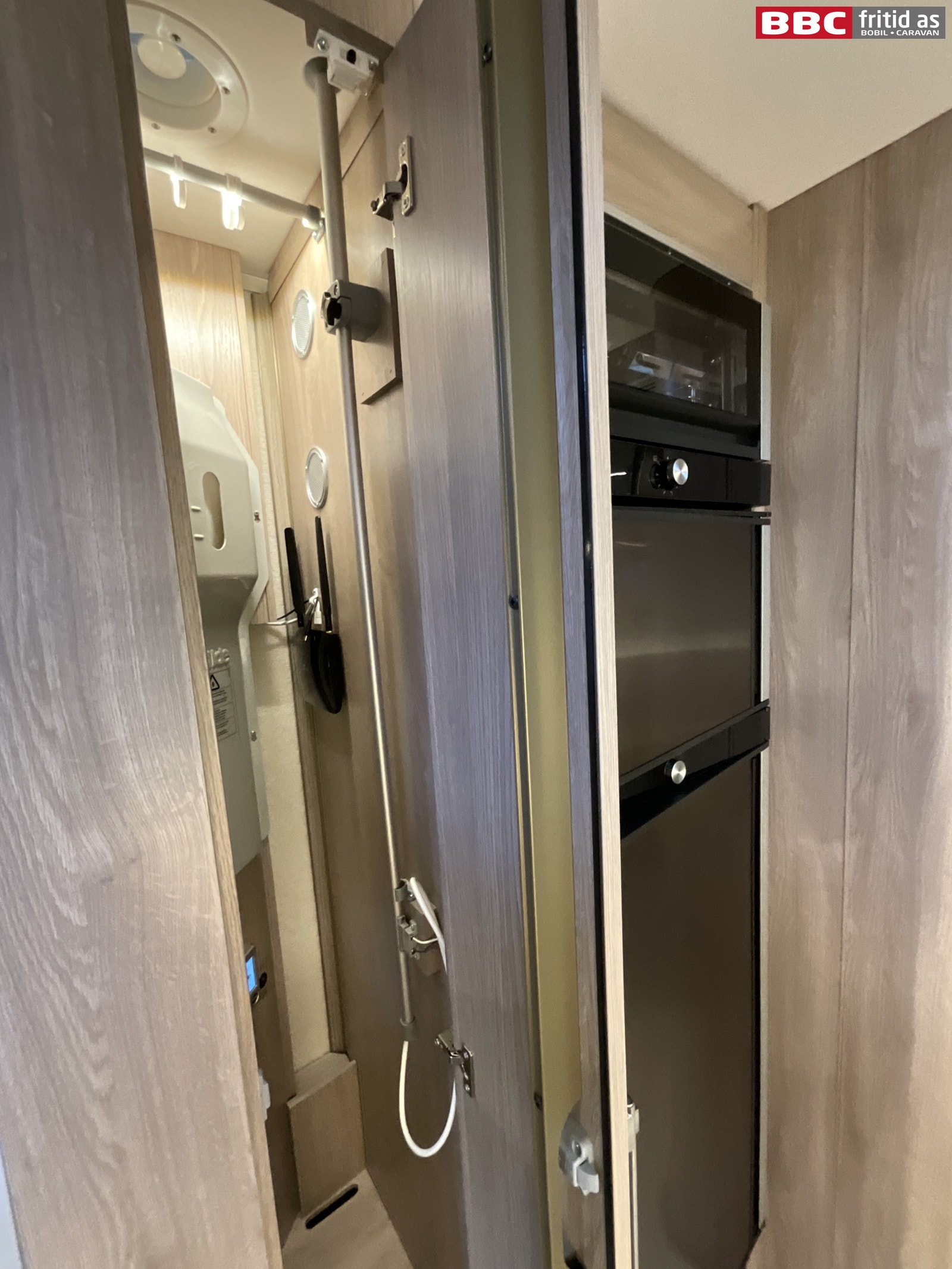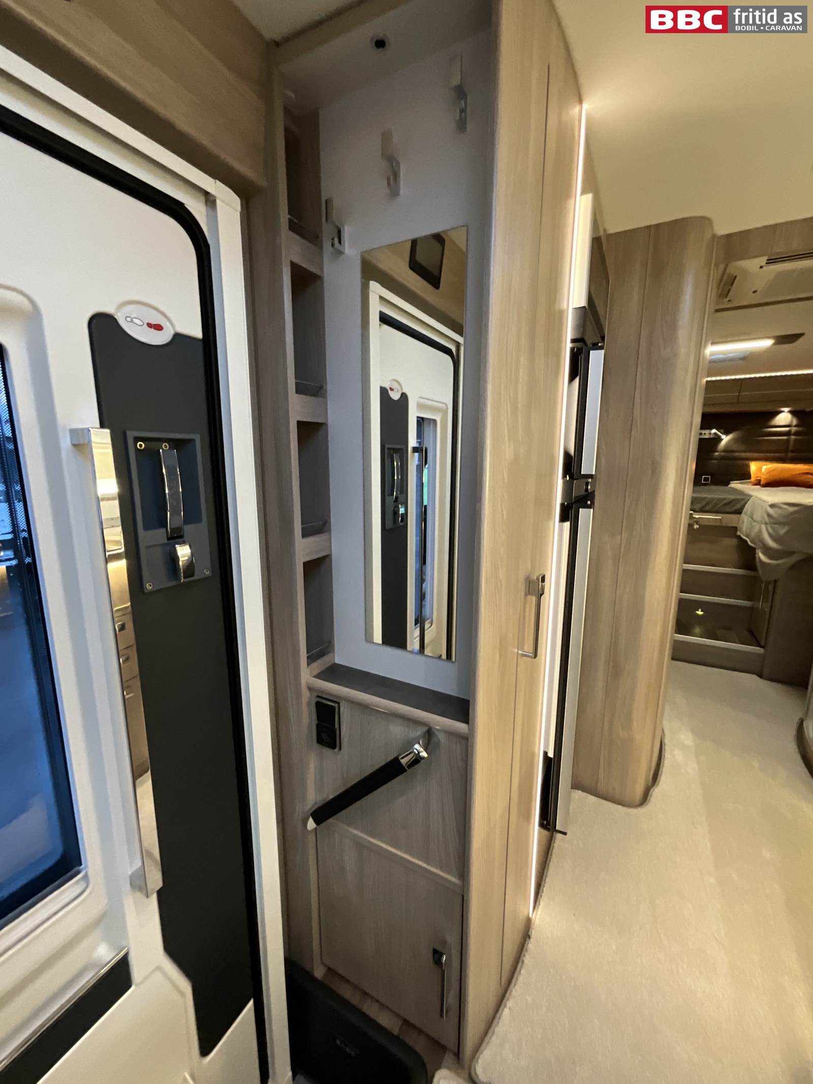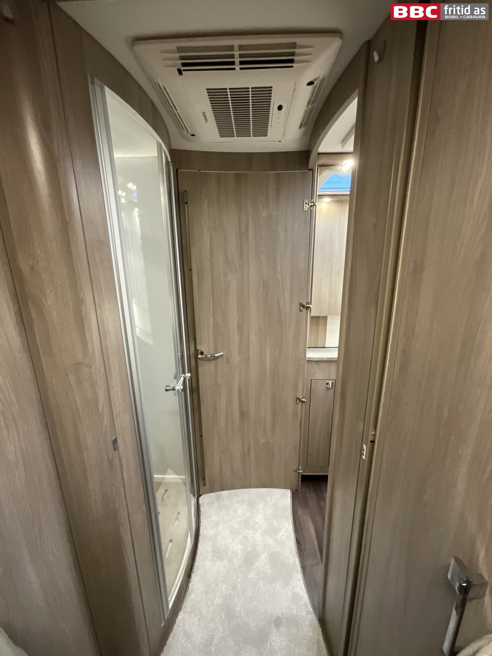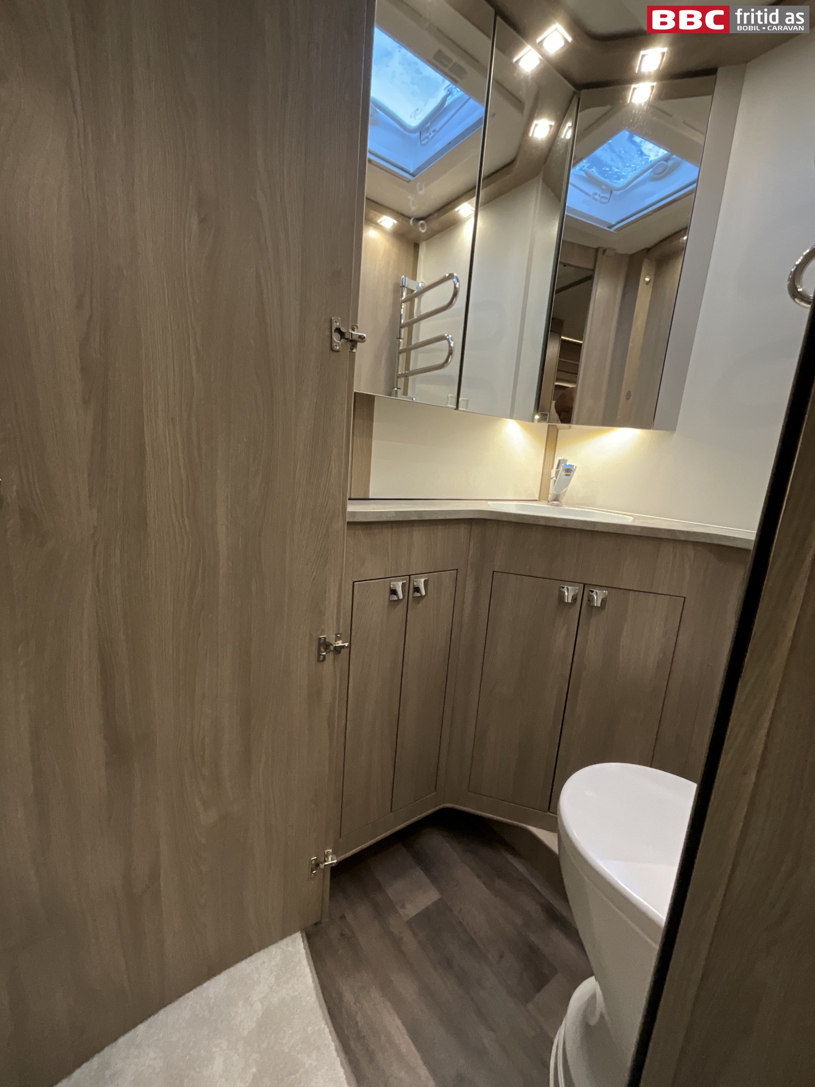 Fastdør inn mot badet, som også kan brukes som fastdør mot kjøkken/stue. Vask 3 overskap, 2 underskap, 3 speil, 6 taklys, kroker for oppheng, ALDE håndklevarmer på veggen, 230V-uttak, takluke 40 x 40 cm og et Cinderella WC (forbrenningstoalett).