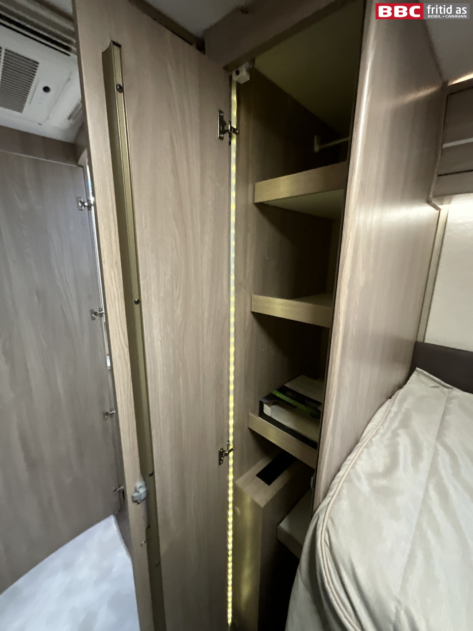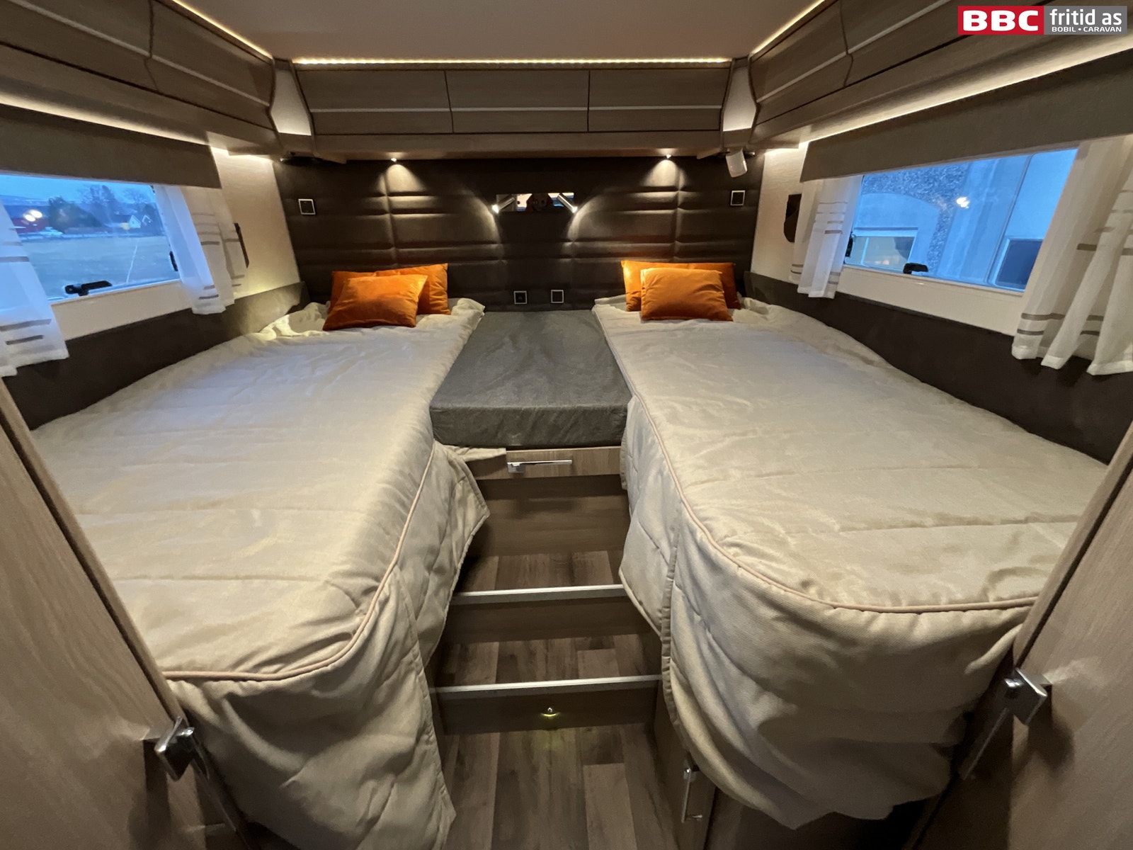 Bakerst i bilen er det 2 enkeltsenger på 200 x 80 cm hver. Kan legges sammen til stor dobbeltseng ved behov. I rommet er det også 2 underskap og hele 9 overskap. Høyskap på ca 200 x 30 cm med 5 hyller. 2 leselys, taklys og flere innfeldte led-striper gir veldig behagelig belysning. 2 stk 230V, 1 stk 12V og 2 stk USB-uttak. På veggen er det Tv-feste med uttak. Dometic Aircondition i taket med fjernkontroll, takluke med 2-veis el-vifte på 40 x 40 cm. 4 puter, 2 vinduer, behagelig trapp til sengene og 2 vegglommer for oppbevaring. Røykvarsler er montert i taket.