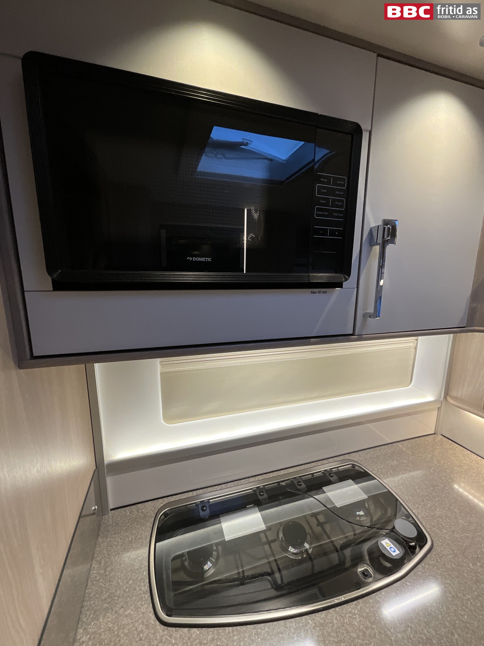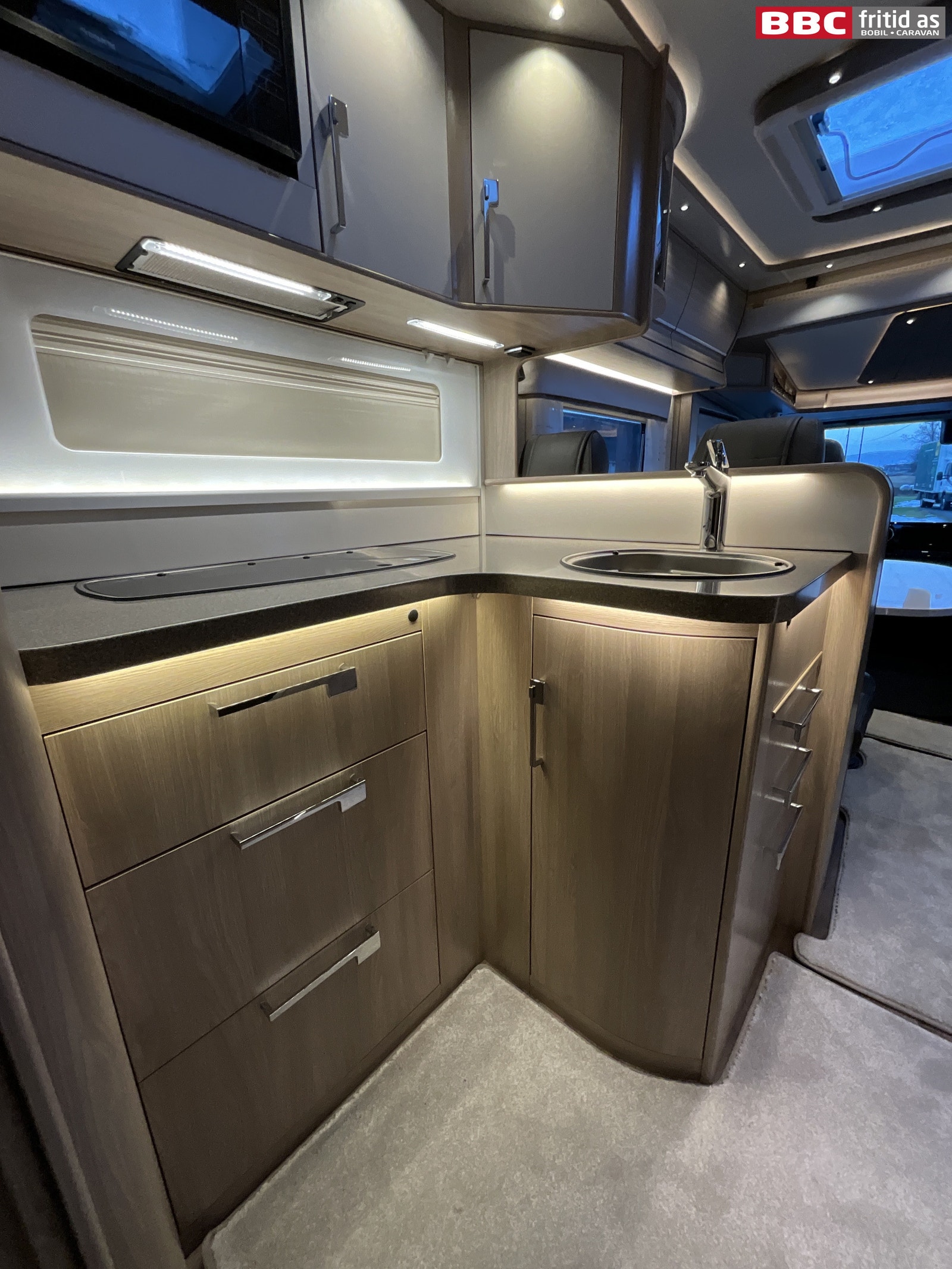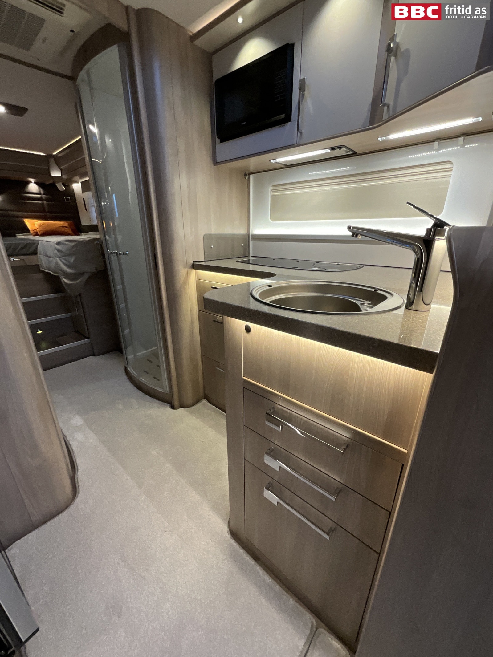 Her er det 3 kokebluss, vask, 2 overskap, 6 skuffer og 1 underskap. 2 lys over kjøkkenbenken, og en takluke på 40 x 40 cm. Dometic kjøleskap med separat fryseboks + stekeovn på toppen. Kjøleskapdøren kan åpnes fra både høyre og venstre side. Micro-ovn montert over kjøkkenbenken. Fastdør inn mot bad.