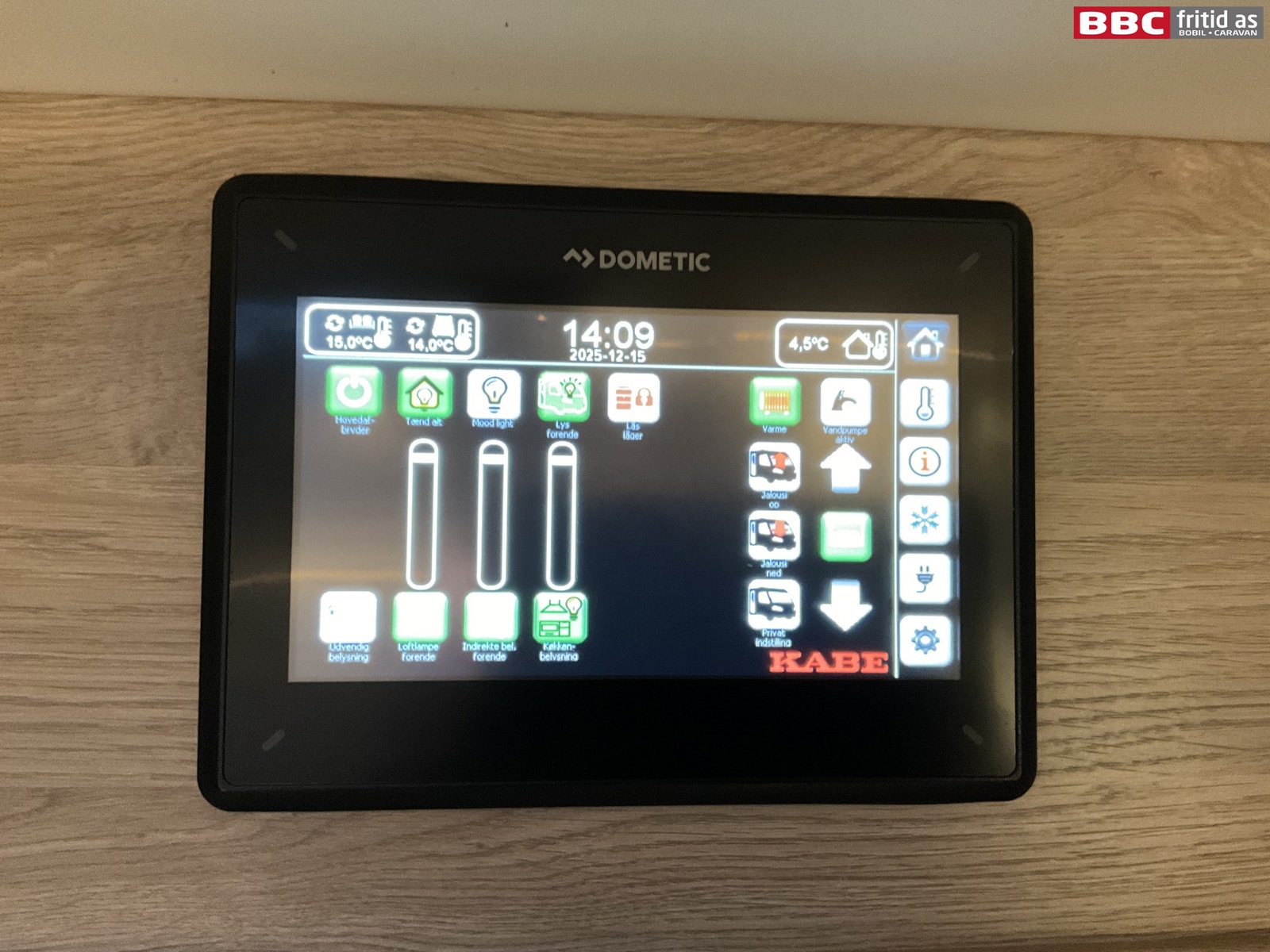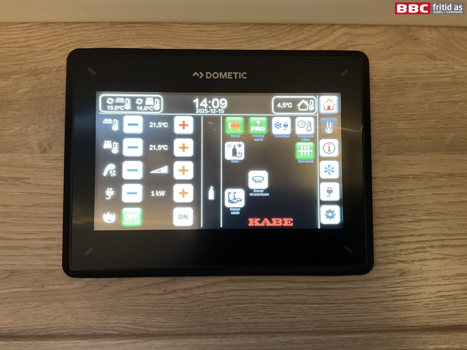 Bilen har ALDE 3030 med digitalt styringspanel og vannbåren gulvvarme. Gassalarm er også montert. Innbruddsalarm montert på lasteluker og dører.