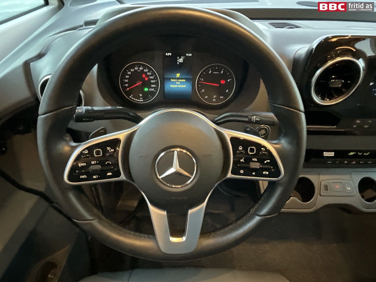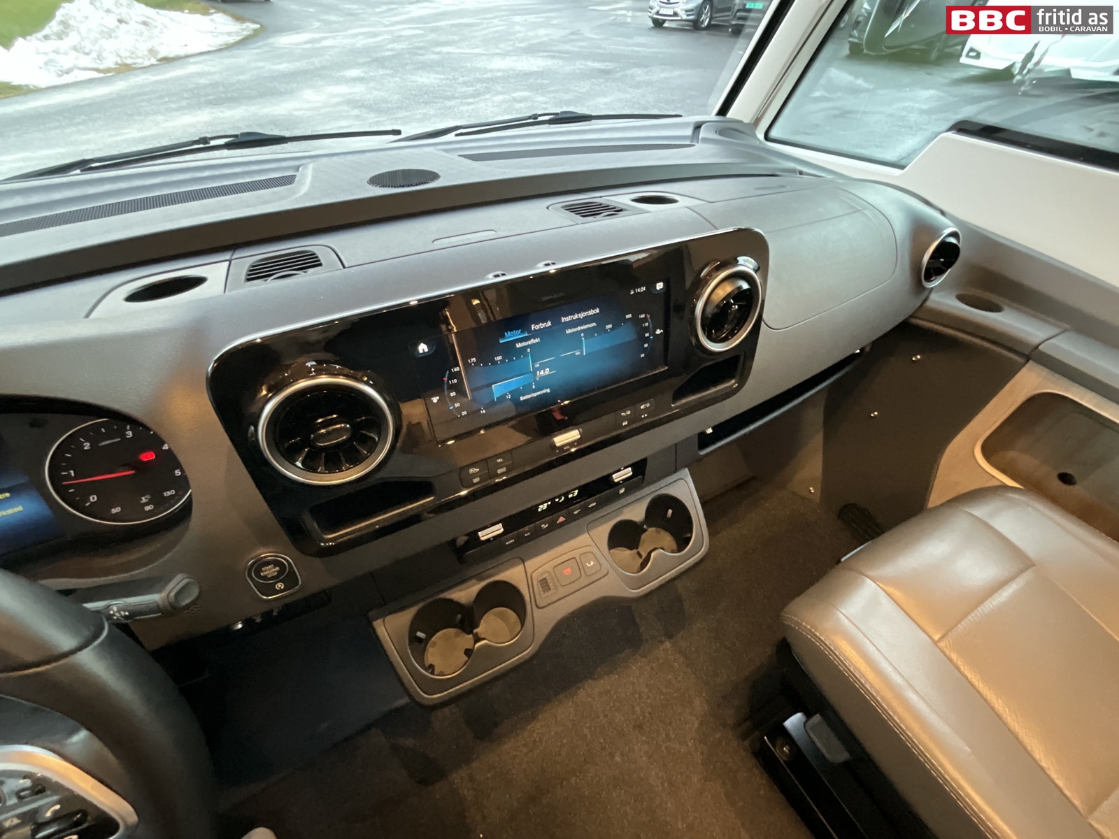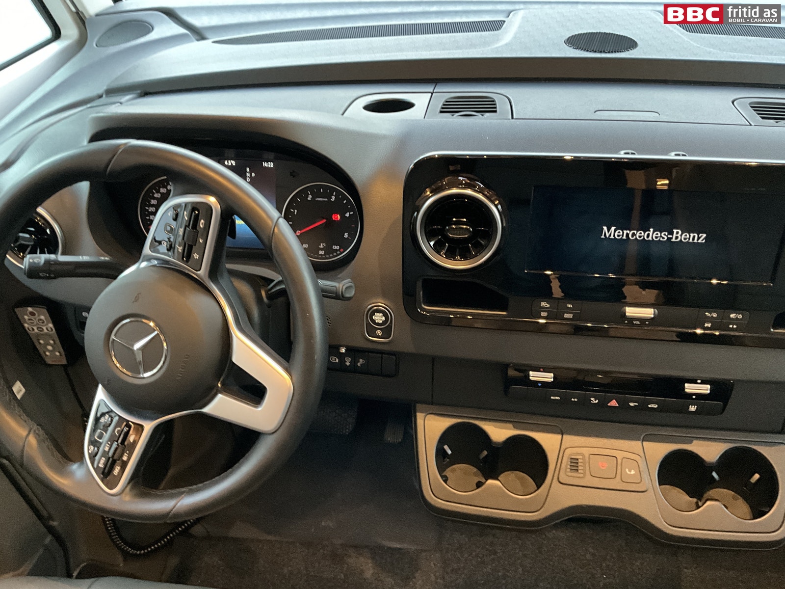 Fremme i bilen har du Mercedes sitt oversiktlige førermiljø. 7 koppholdere, 2 stk USB-uttak, ladeplate for mobil, Mercedes sitt stereo-system med touch-skjerm og masse av bilens funksjoner i ulike menyer. Selvsagt med DAB+, skjerm for ryggekamera, navigasjon, handsfree, bluetooth. Multifunksjonsratt med masse muligheter. Digitalt varmeapparat styres fra skjermen, AC, 7 lys i taket, 8 hyller, elektrisk blendingsgardin i frontrute, remis-gardiner på siderutene, varme i fremsetene (flere styrker), og adaptiv cruisecontrol som fungerer kjempefint opp mot bilen motorstyrke og automatgir.