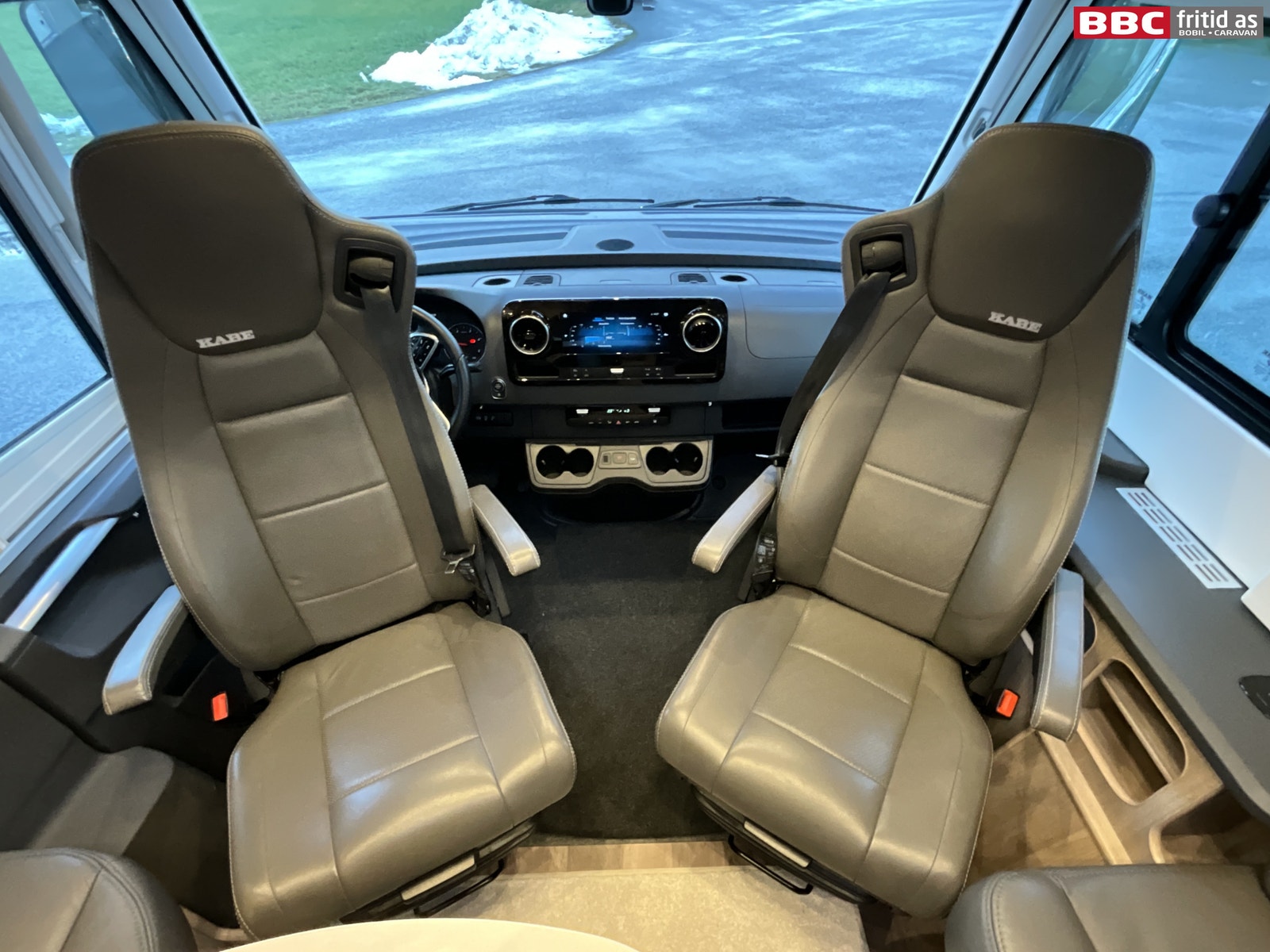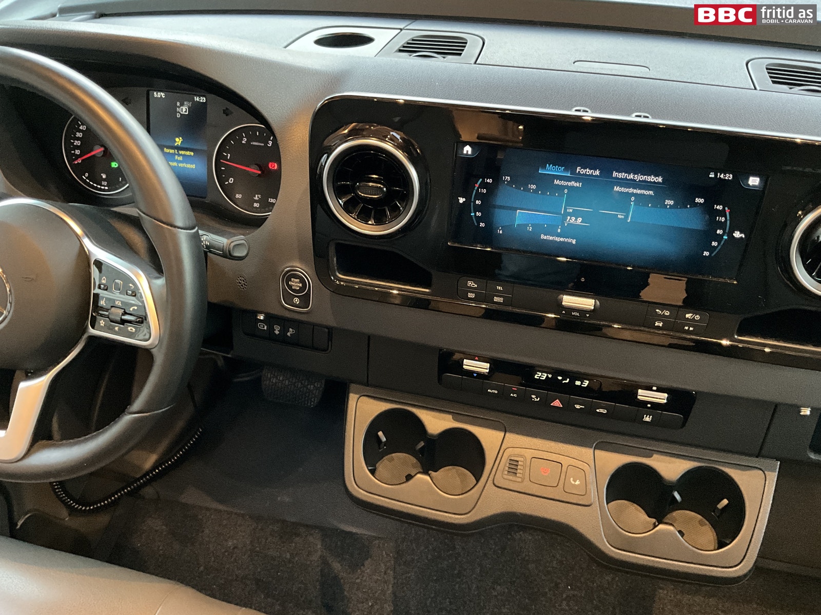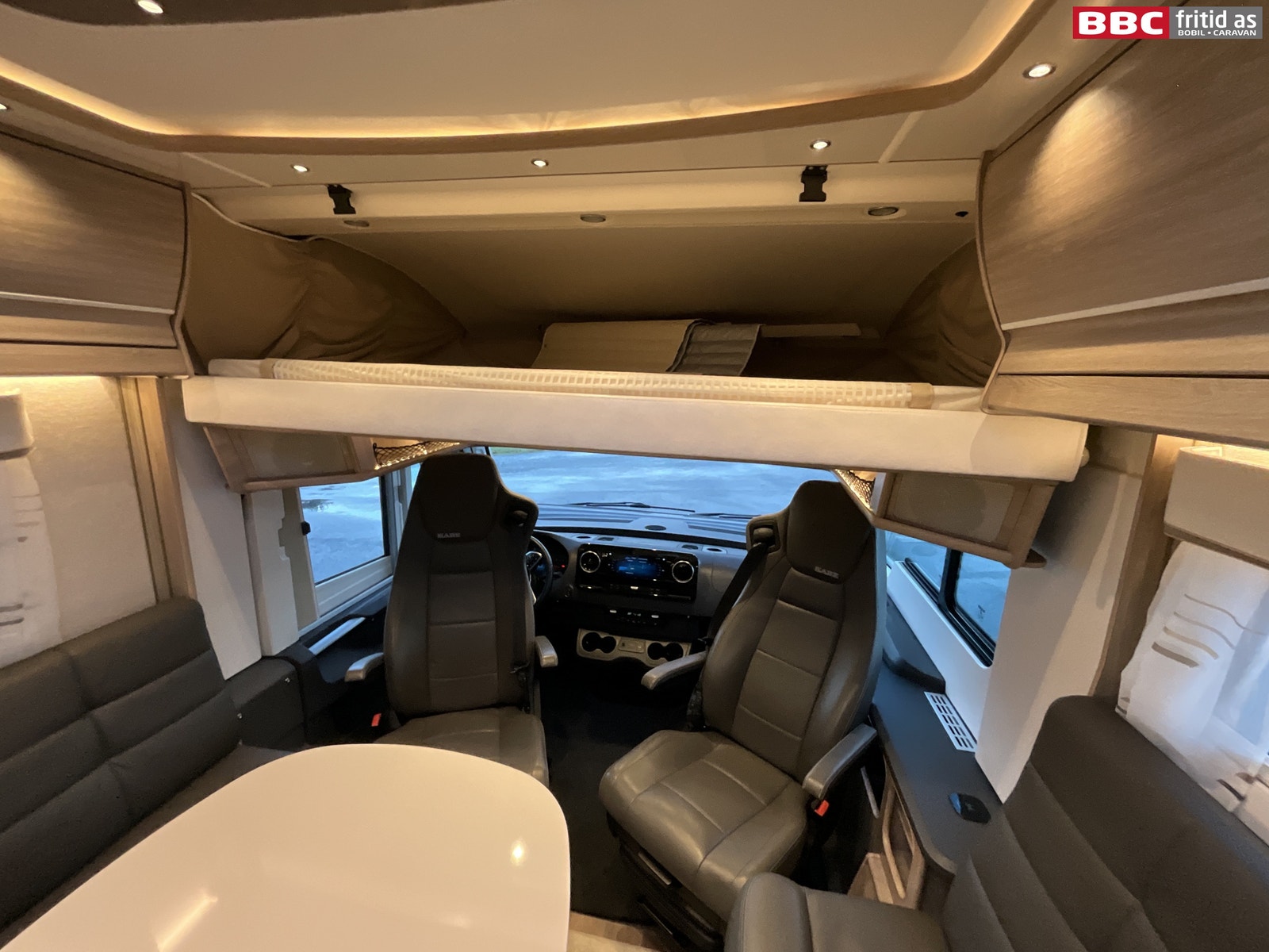 Fremme i bilen har du Mercedes sitt oversiktlige førermiljø. 7 koppholdere, 2 stk USB-uttak, ladeplate for mobil, Mercedes sitt stereo-system med touch-skjerm og masse av bilens funksjoner i ulike menyer. Selvsagt med DAB+, skjerm for ryggekamera, navigasjon, handsfree, bluetooth. Multifunksjonsratt med masse muligheter. Digitalt varmeapparat styres fra skjermen, AC, 7 lys i taket, 8 hyller, elektrisk blendingsgardin i frontrute, remis-gardiner på siderutene, varme i fremsetene (flere styrker), og adaptiv cruisecontrol som fungerer kjempefint opp mot bilen motorstyrke og automatgir.