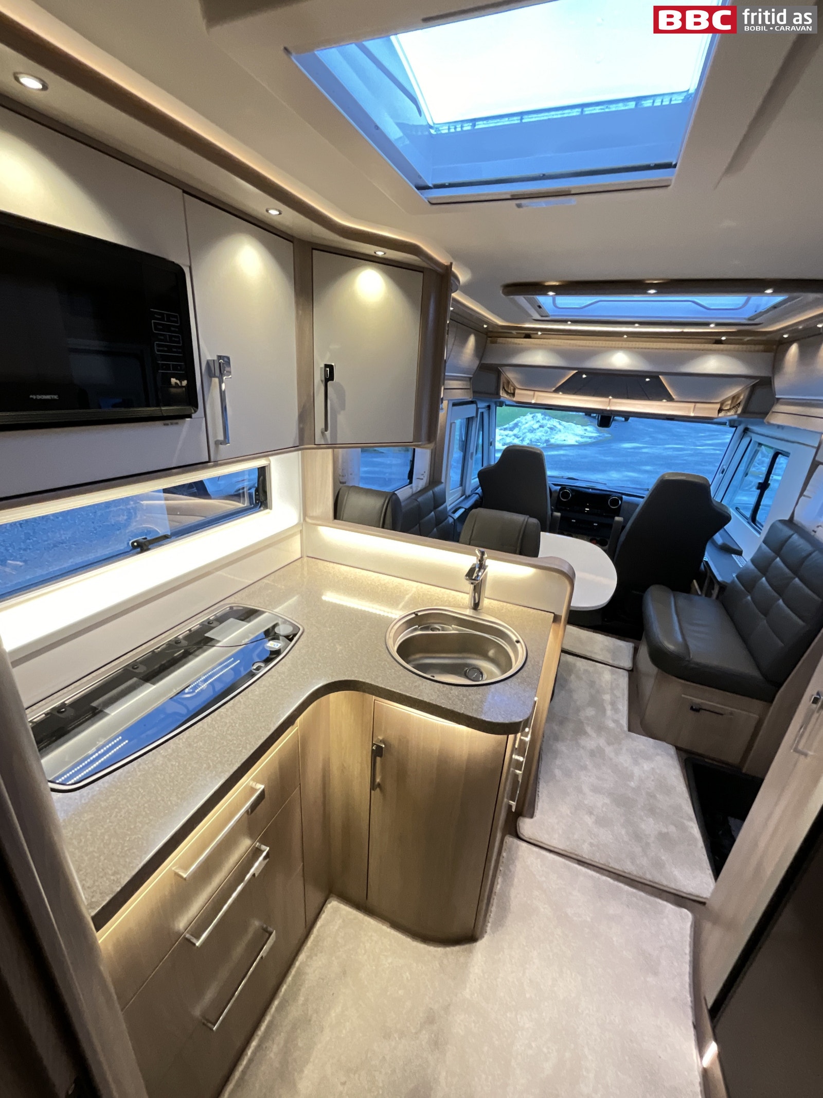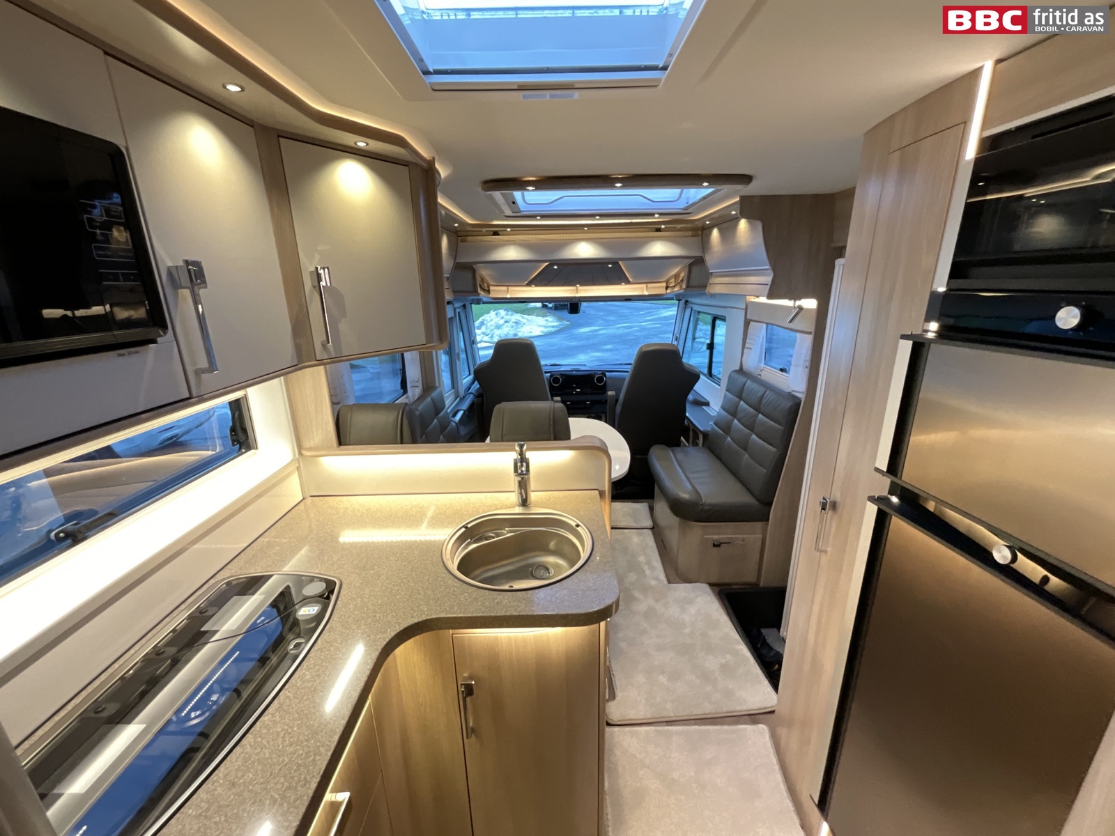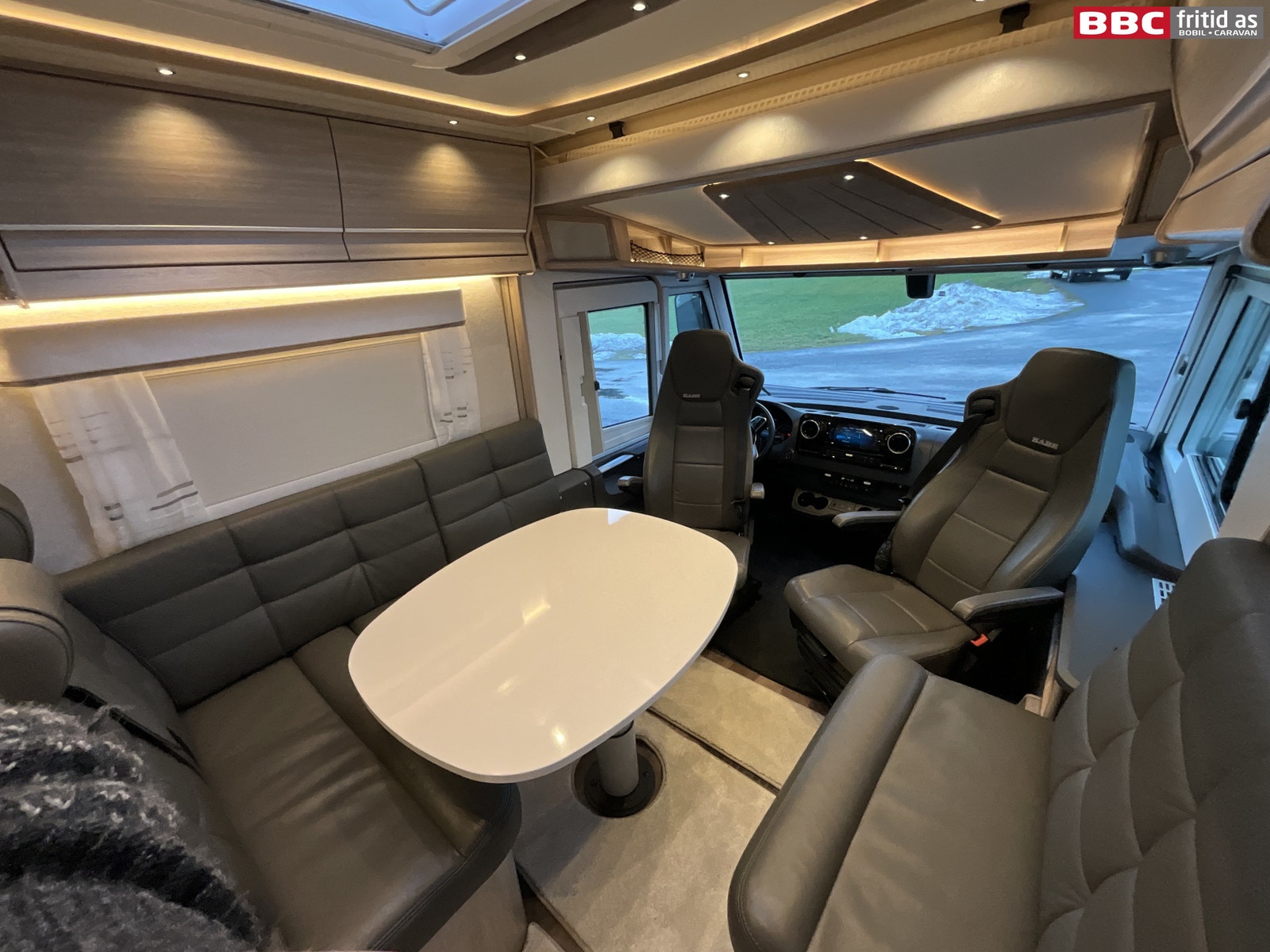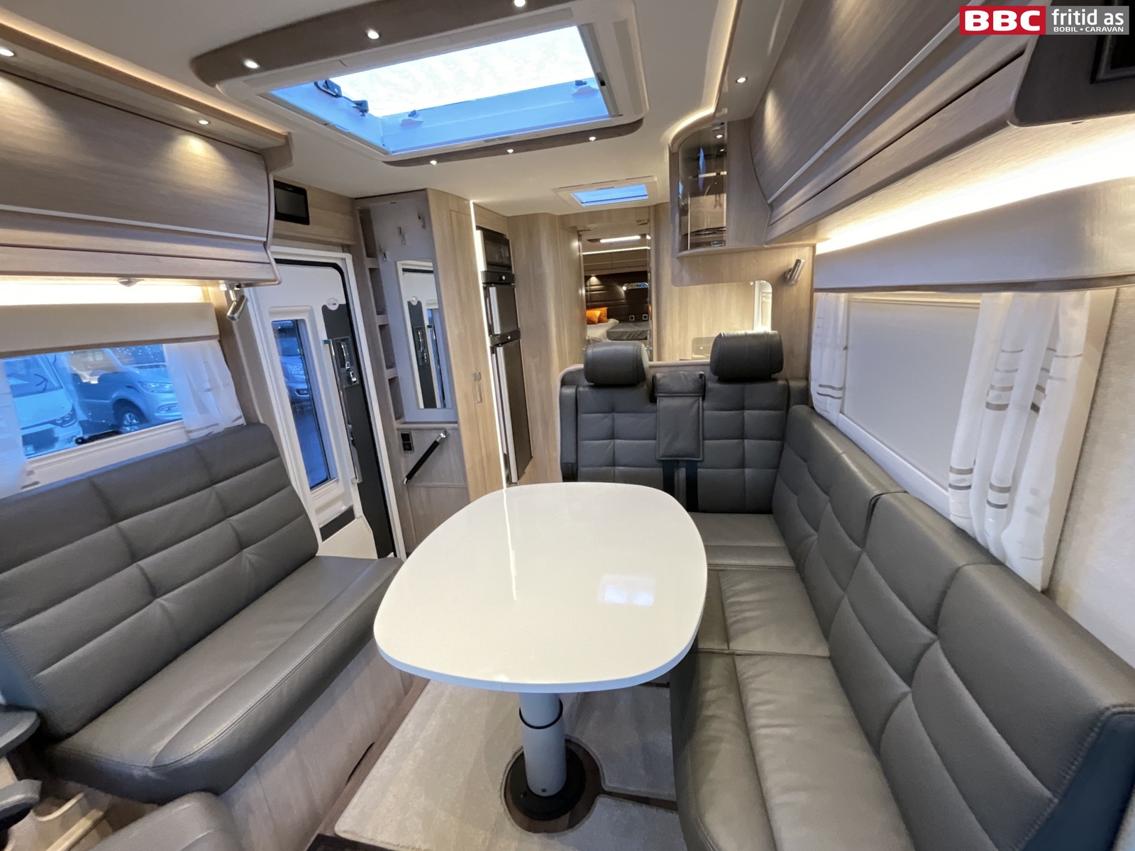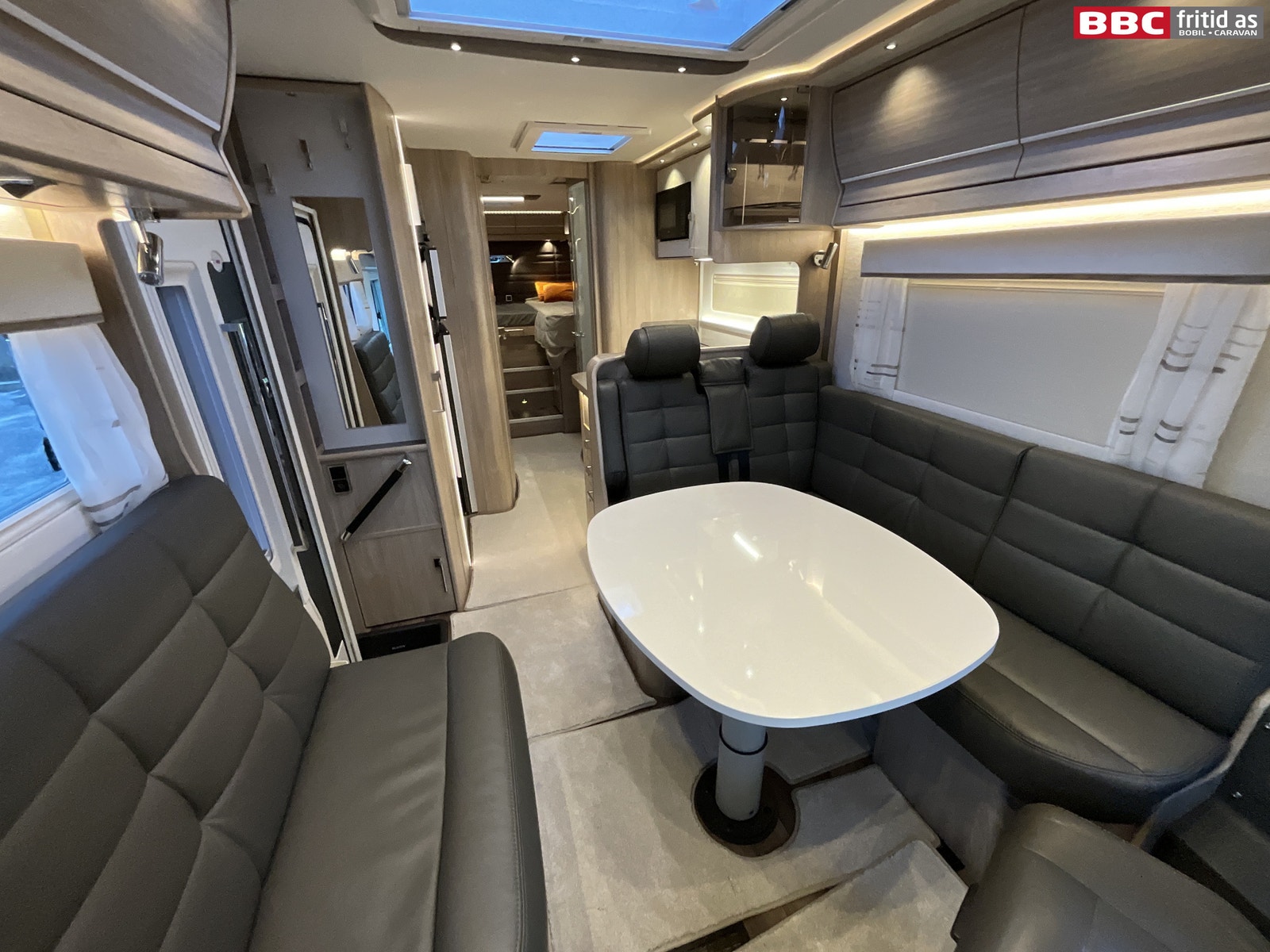 Stor og romslig L-salong i skinn. Sidesitteren er hele 85 cm bred og bordet som kan høydejusteres måler 96 x 80 cm. 7 personer sitter behagelig i salongen samtidig. Ellers er det 4 overskap, 1 høyskap på ca 200 x 25 cm, 2 underskap, 230V og 12V-uttak. Inverter på 3000W er koblet slik at alle kontakter i bilen kan kjøres på 230V via Lithium-batteriet. Belysningen i stuedelen består av 15 taklys, 2 lys under overskapene og flere led-striper innfeldt i innrendingen. Lysene er dimbare. Takluke på 85 x 55 cm slipper inn godt med dagslys i bilen. Helt nye originale formsydde tepper i hele bilen. Vindu i bodelsdøren og myggdør er originalt montert. Elektrisk senkeseng i front på ca 190 x 130 cm. TV-feste er montert bak overskap, og kan trekkes ned med enkelt håndgrep. Speil på 80 x 20 cm ved bodelsdøren.