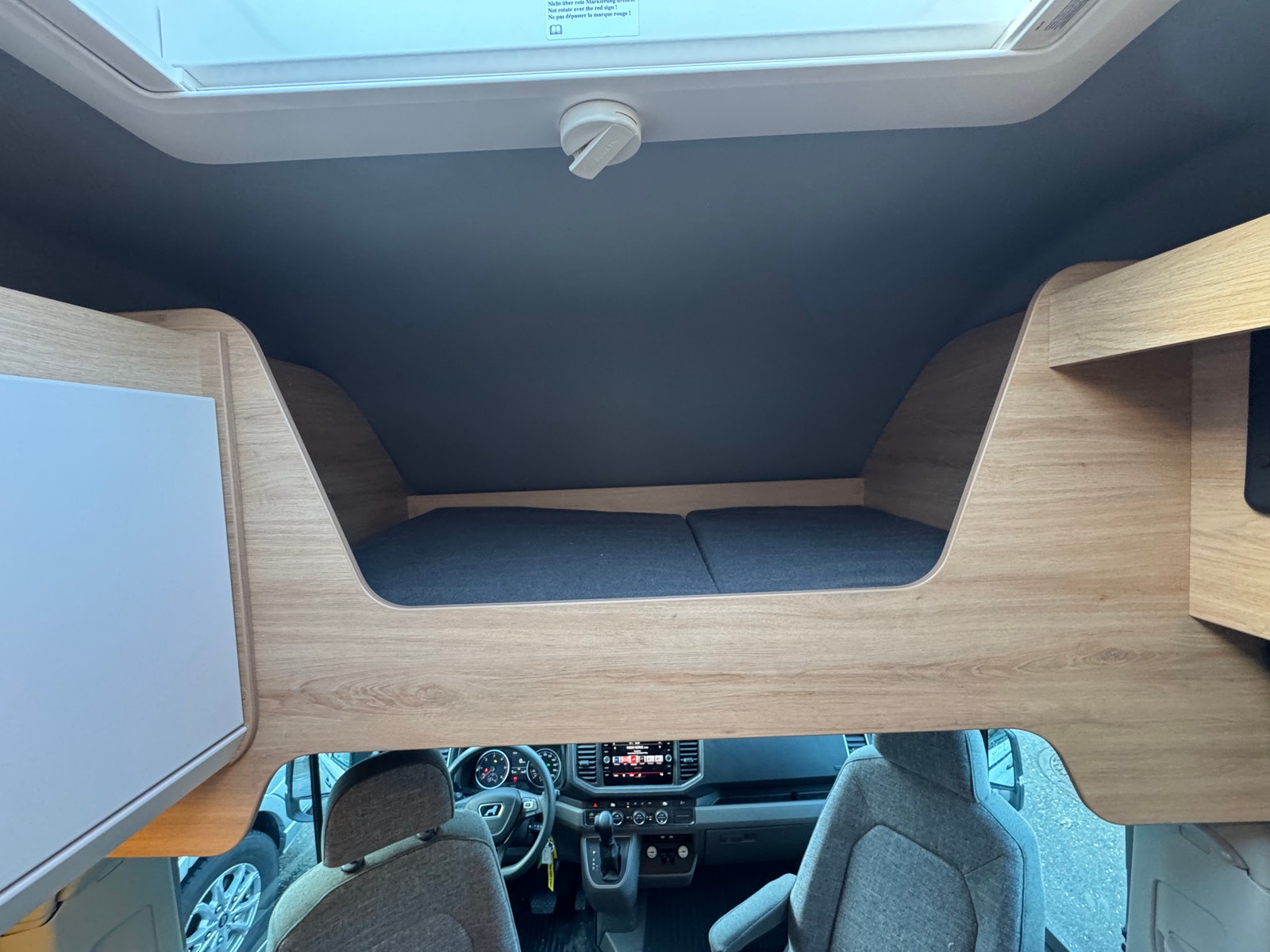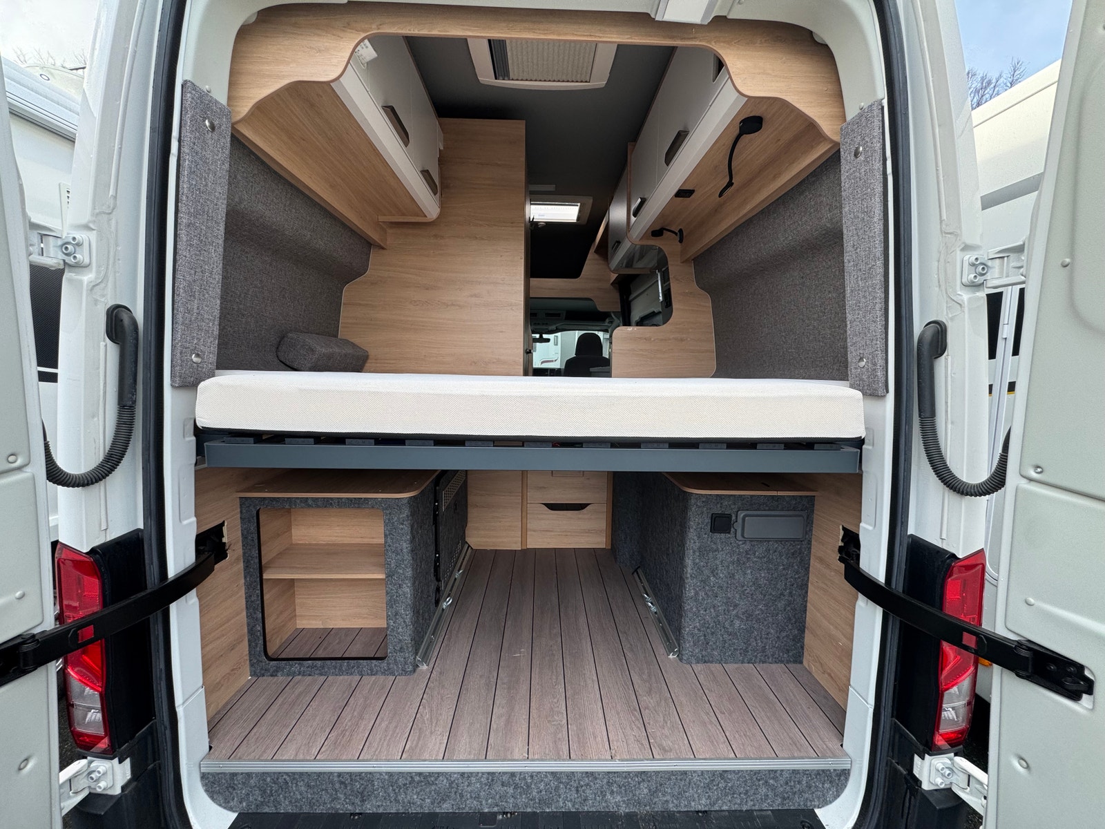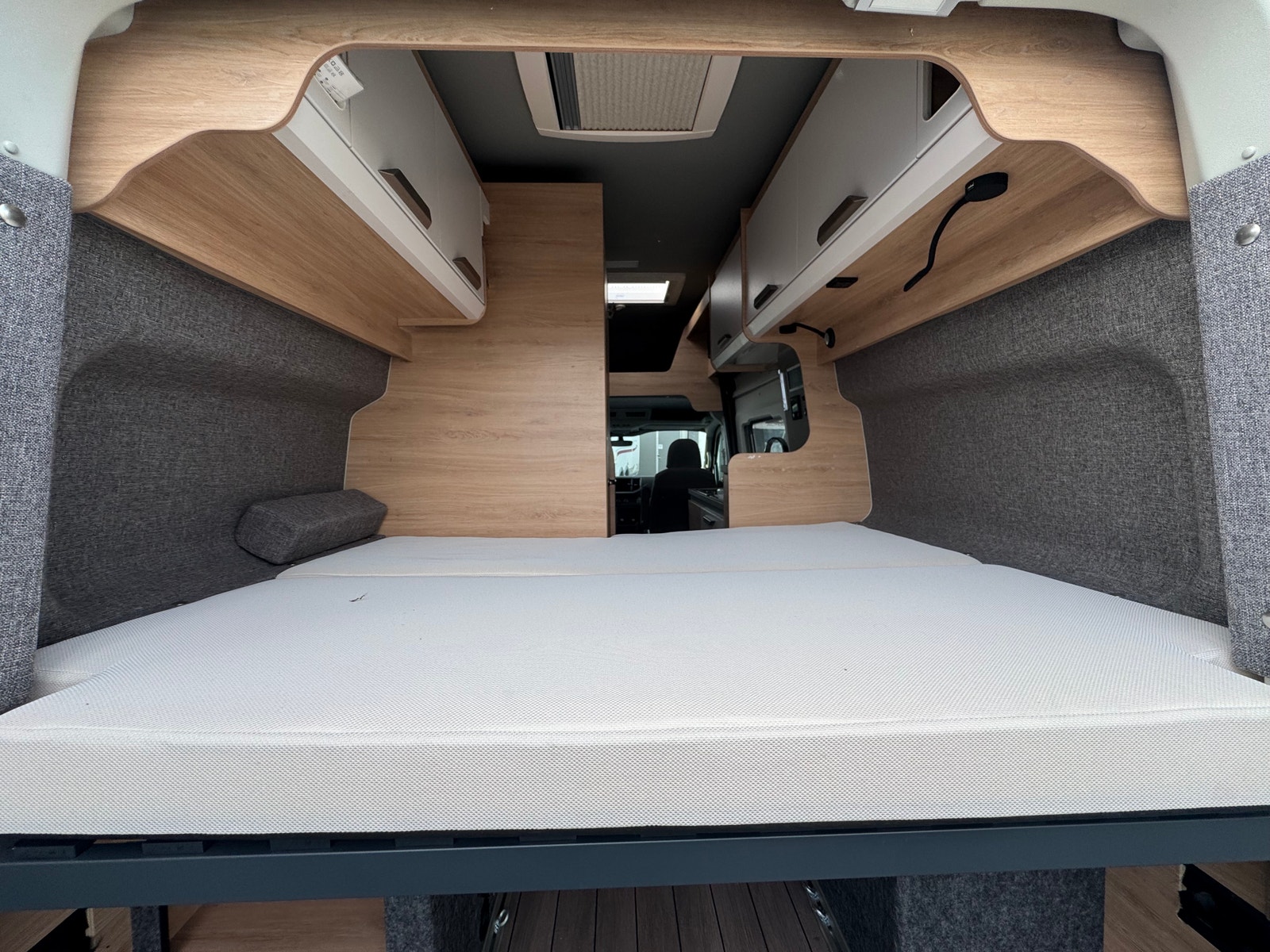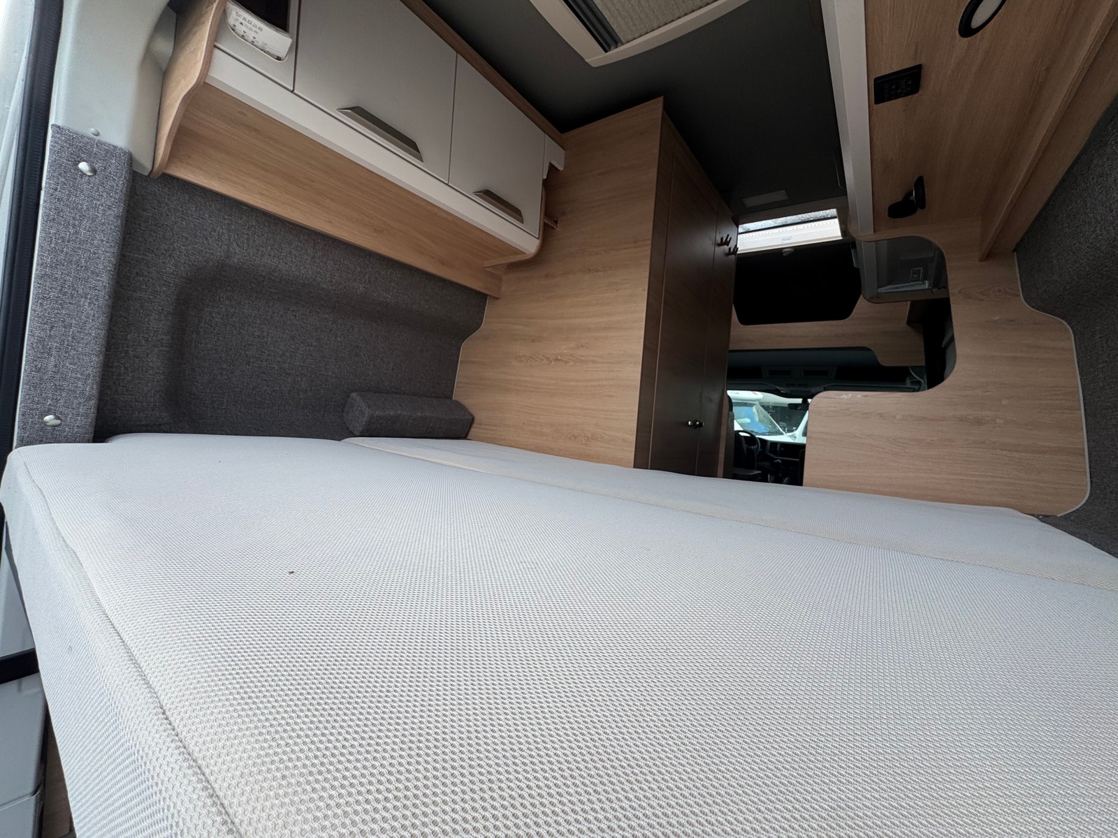Tverrgående seng bak (185cm L x 135cm B) Meget praktisk løsning og godt med skapplass over seng. Stor garasje for oppbevaring av utstyr under seng.