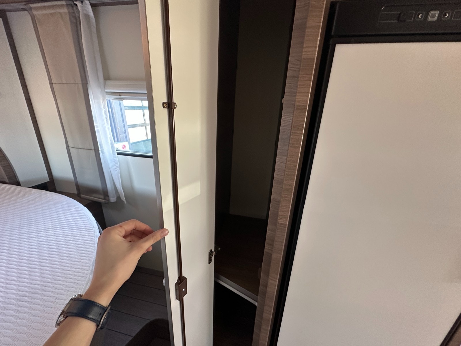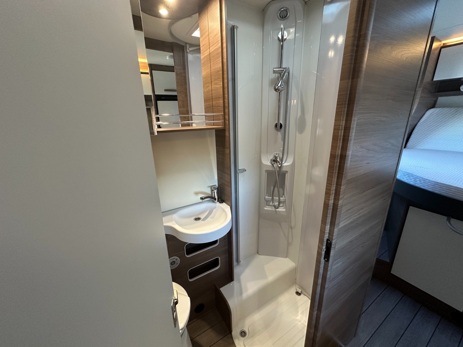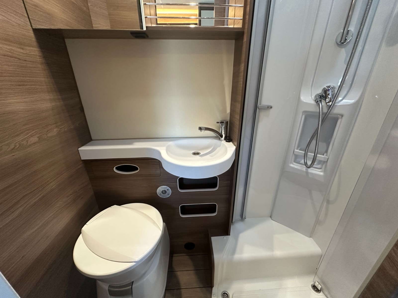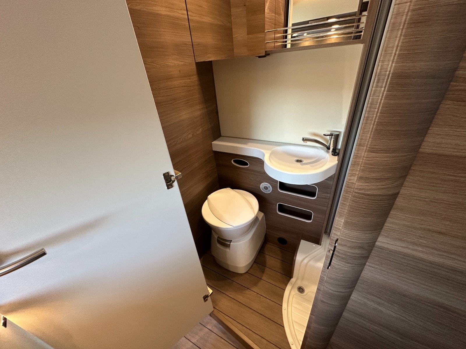 Baderommet er i eget separat rom med svingbart toalett og flotte detaljer som stort speil, såpeholdere, skapplass for toalettsaker og en egen takluke. Takluken har myggnetting.