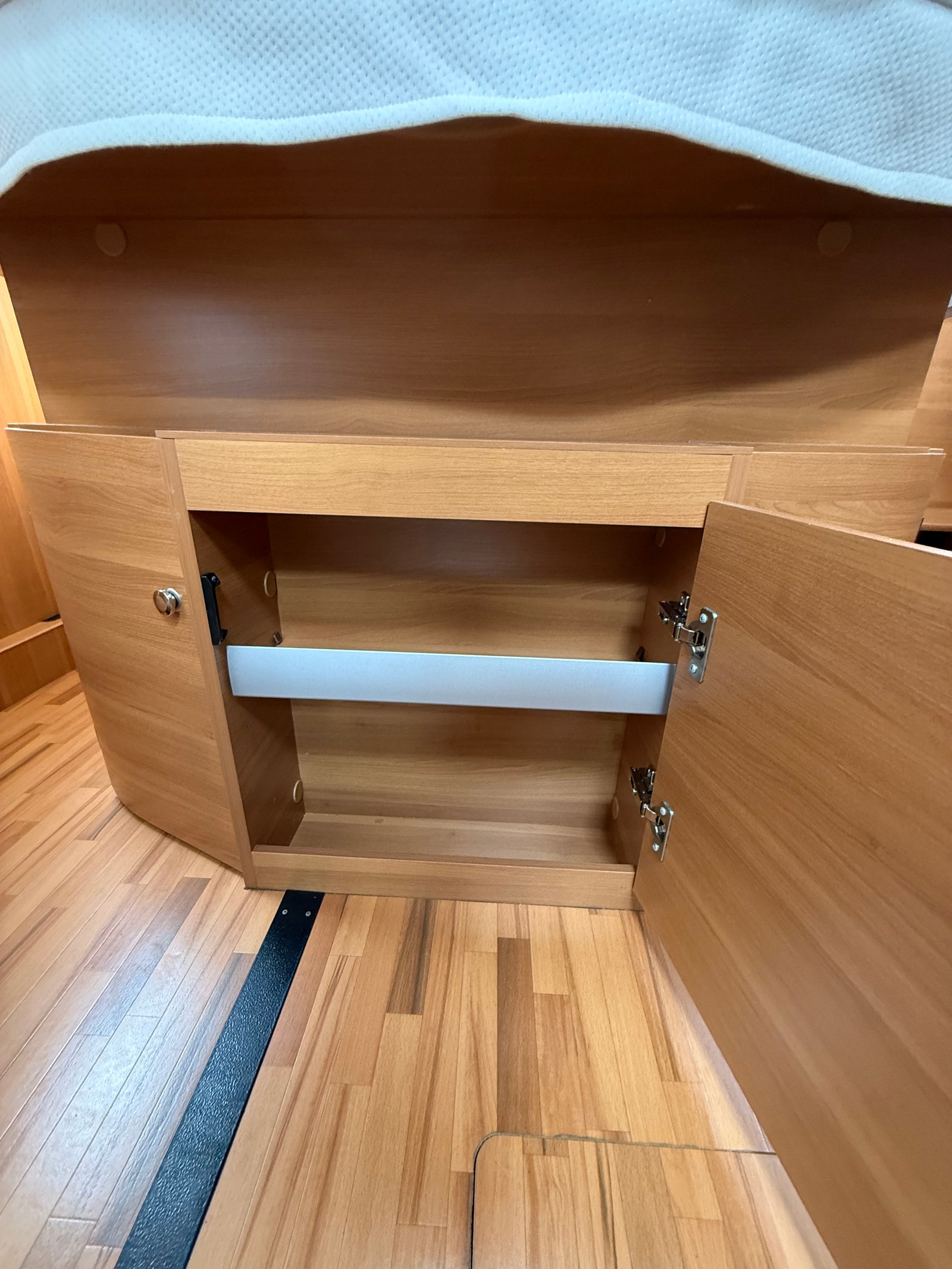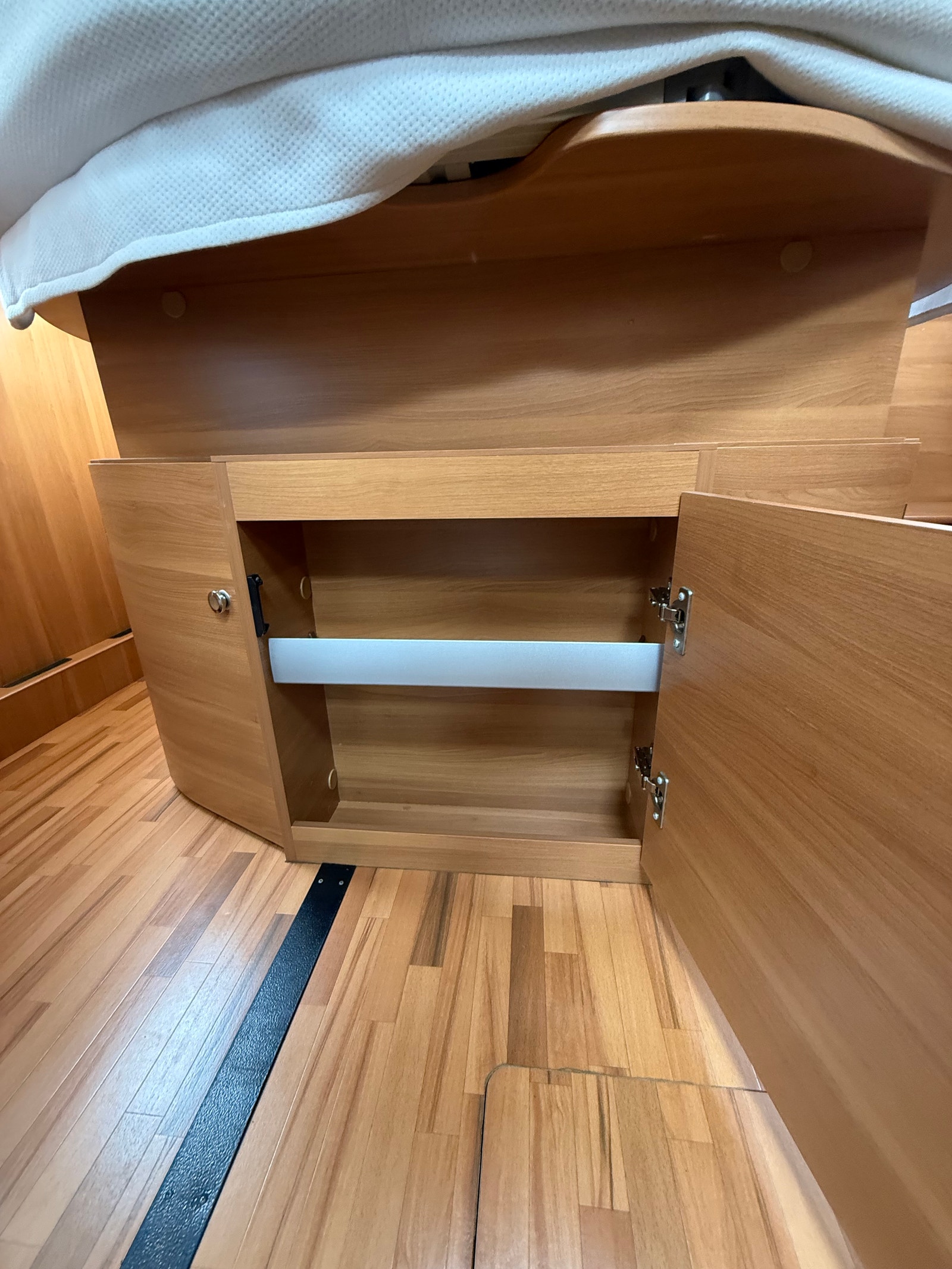 - Front: Romslig sittegruppe med svingbare pilotstoler og en stor senkeseng over førerhuset som ikke hindrer sittegruppen.