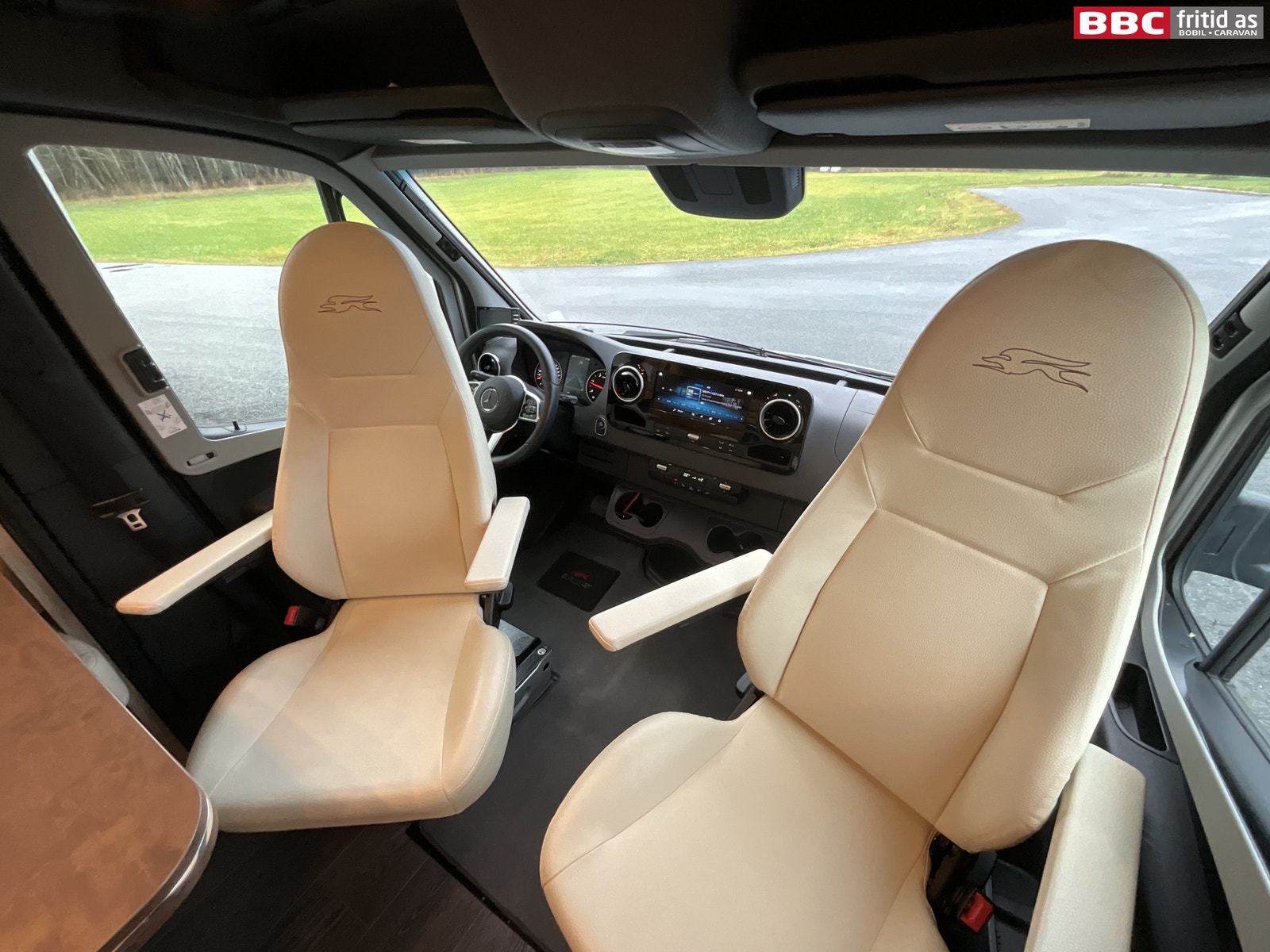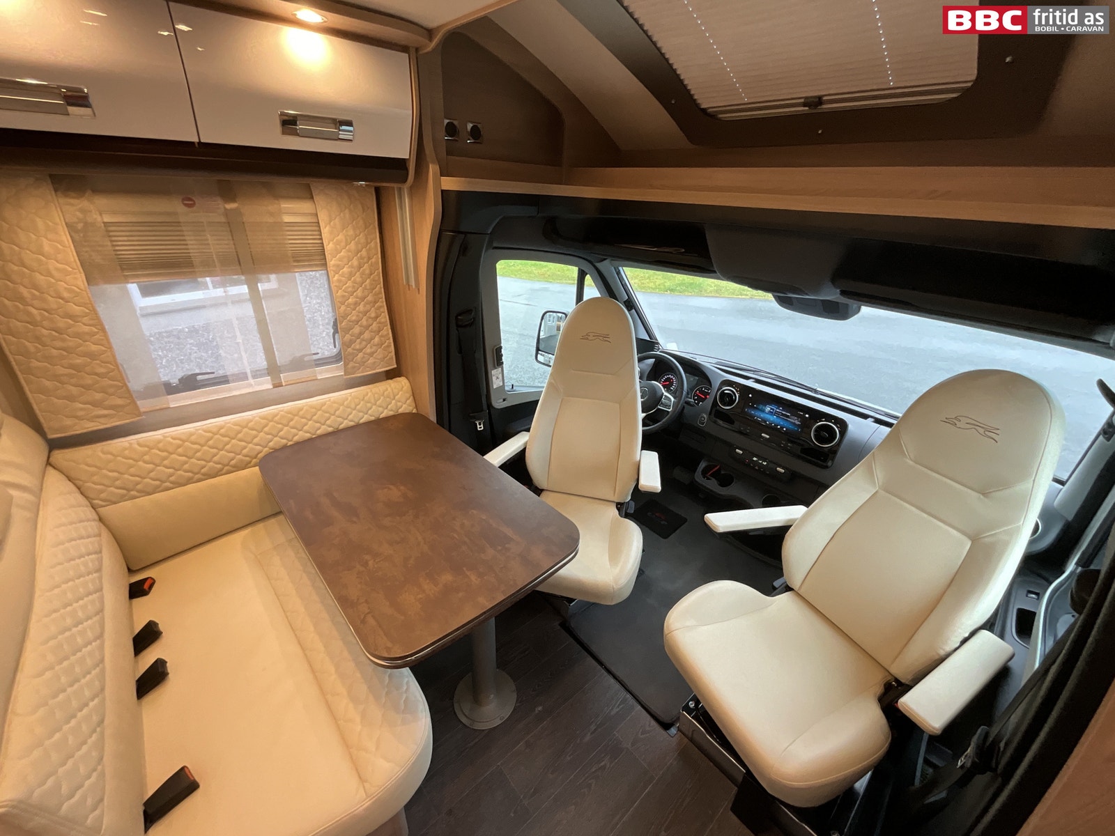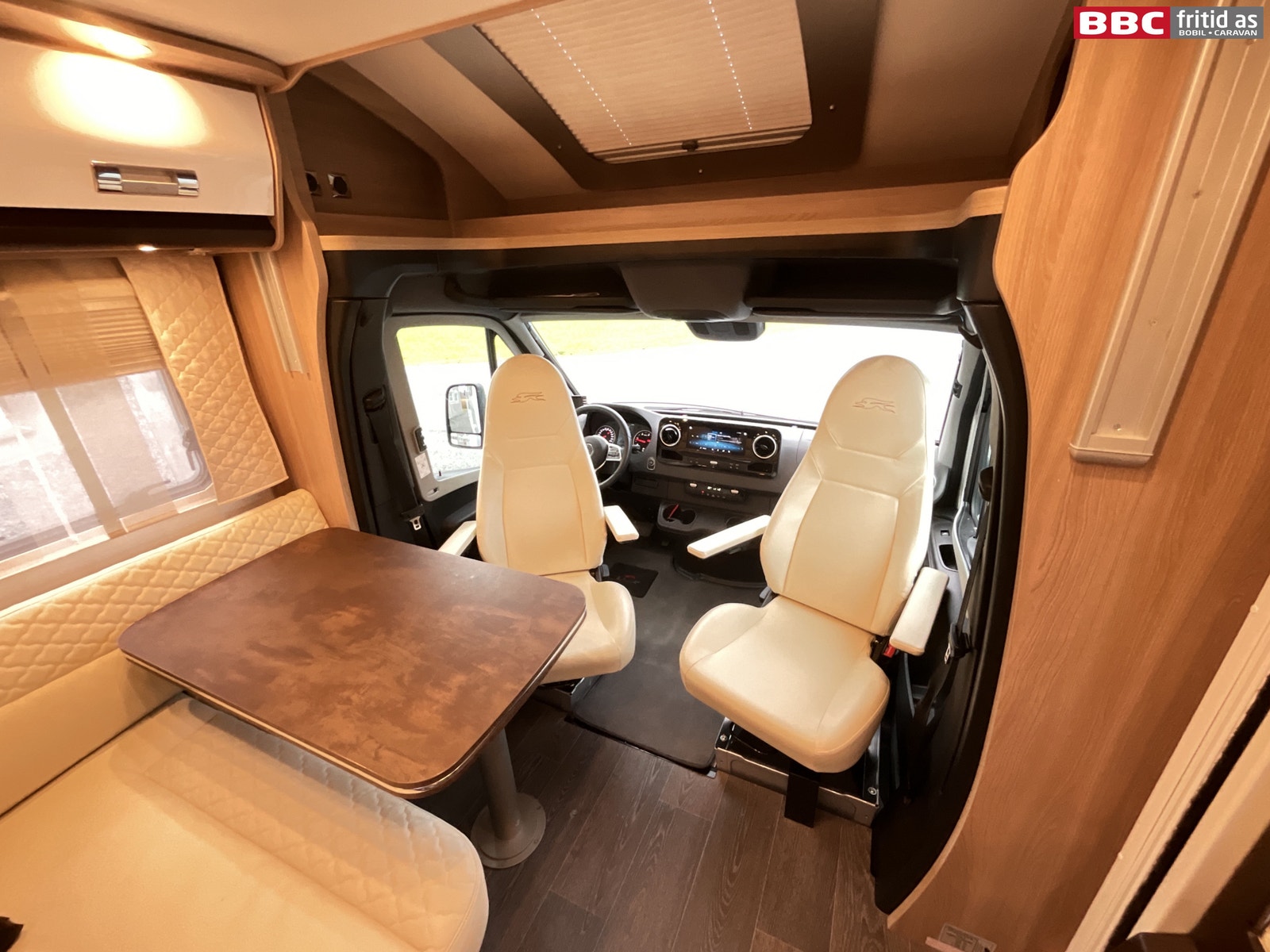 Fremme i bilen er det 2 gode vendbare fremseter med justerbare armlener. 4 koppholdere, 2 stk USB-uttak, og Mercedes sin store infoskjerm med DAB+, Navigasjon, bluetooth og MASSE muligheter for innstillinger. Hele dette systemet henger sammen med multifunksjonsrattet som kan styre det aller meste. Remis blendingsgardiner på vinduene, 2 lys i taket, takluke og 3 hyller over fremsetene.