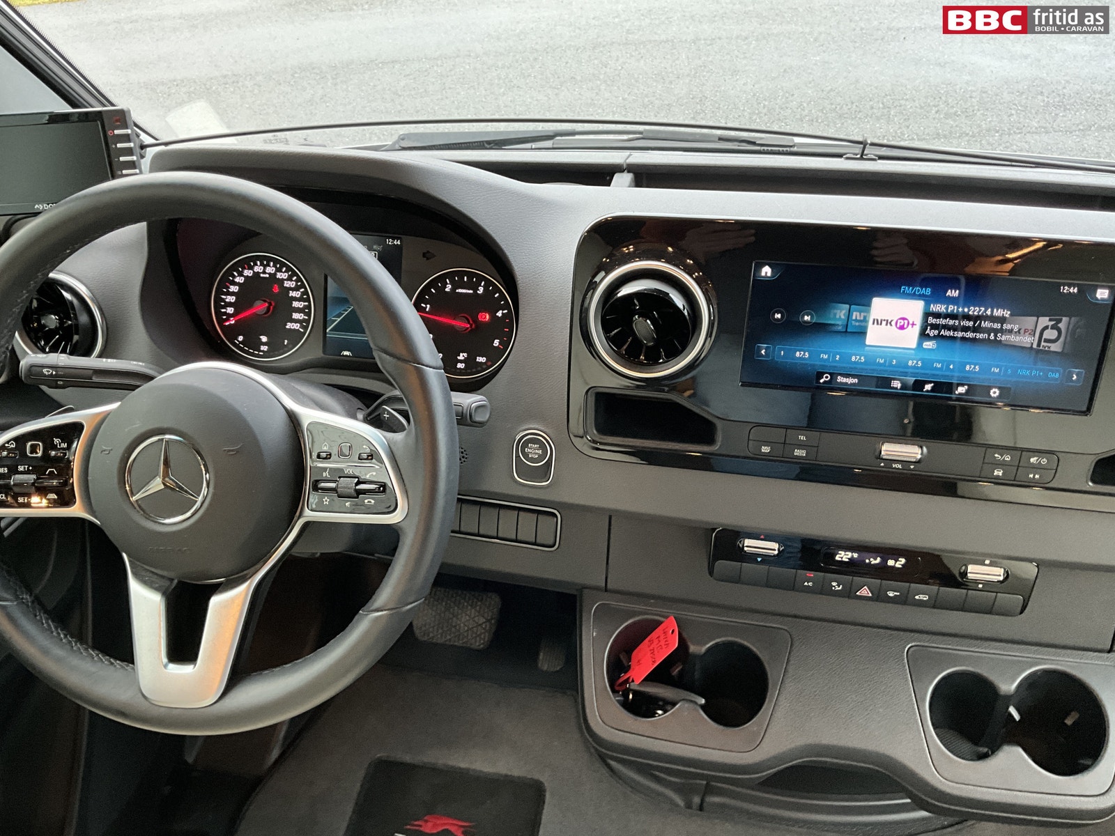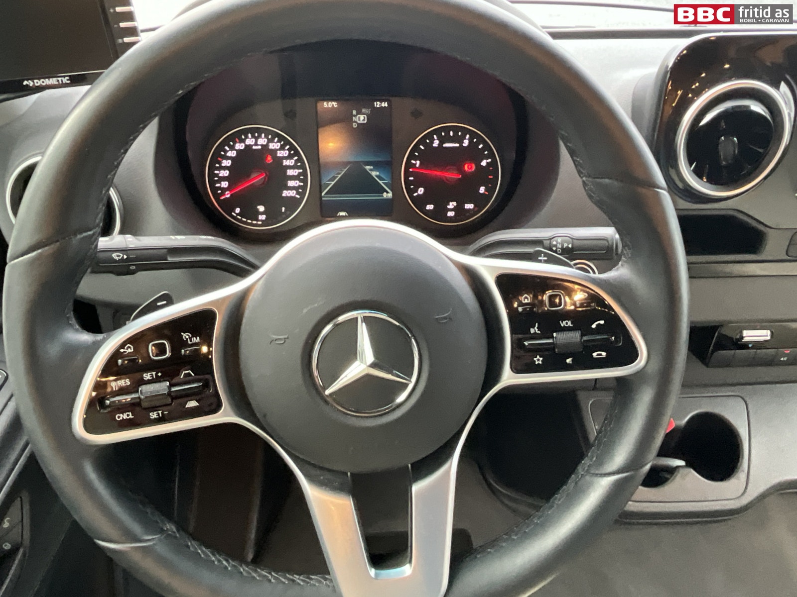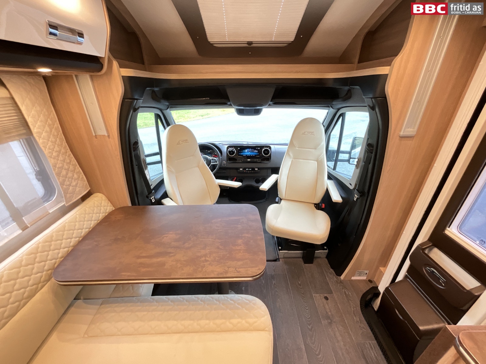 Fremme i bilen er det 2 gode vendbare fremseter med justerbare armlener. 4 koppholdere, 2 stk USB-uttak, og Mercedes sin store infoskjerm med DAB+, Navigasjon, bluetooth og MASSE muligheter for innstillinger. Hele dette systemet henger sammen med multifunksjonsrattet som kan styre det aller meste. Remis blendingsgardiner på vinduene, 2 lys i taket, takluke og 3 hyller over fremsetene.