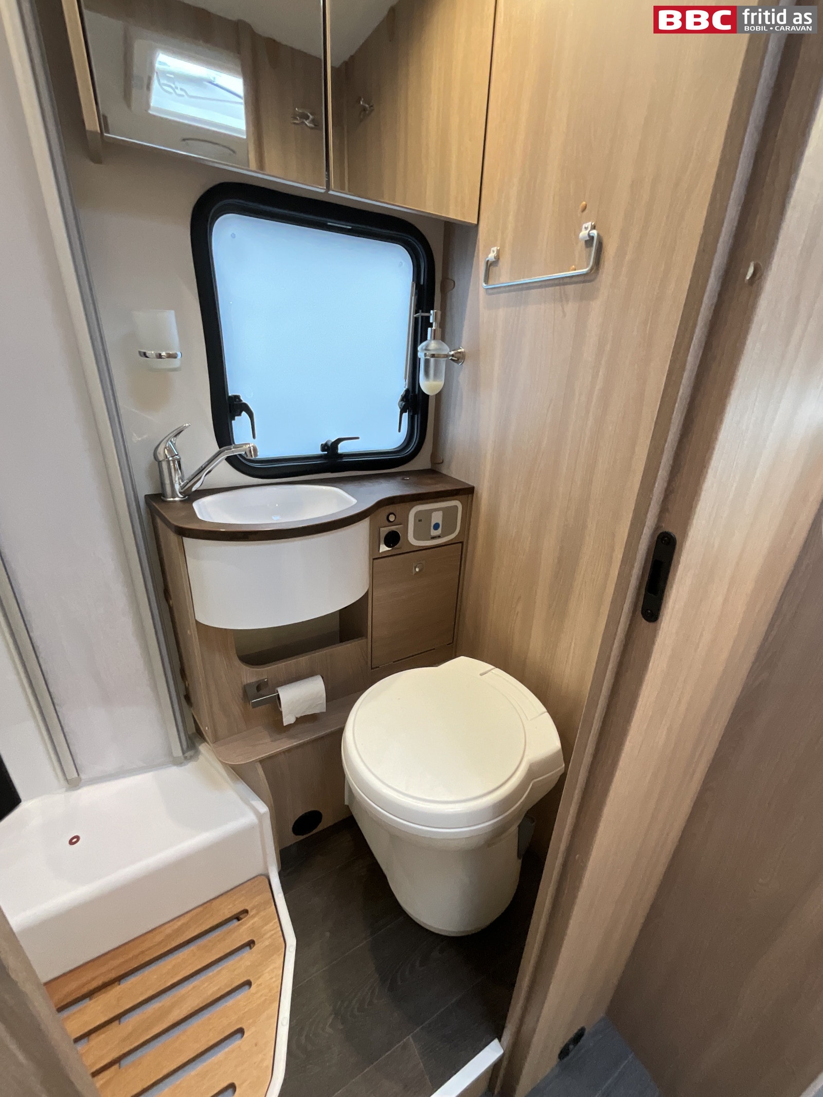 Fastdør inn til badet som har WC, vask, 2 overskap, 1 underskap, 2 speil, 3 taklys, håndkleholder, 230V-uttak, takluke og dusj. Trerist/plate i dusjgulvet og såpeholder på veggen.