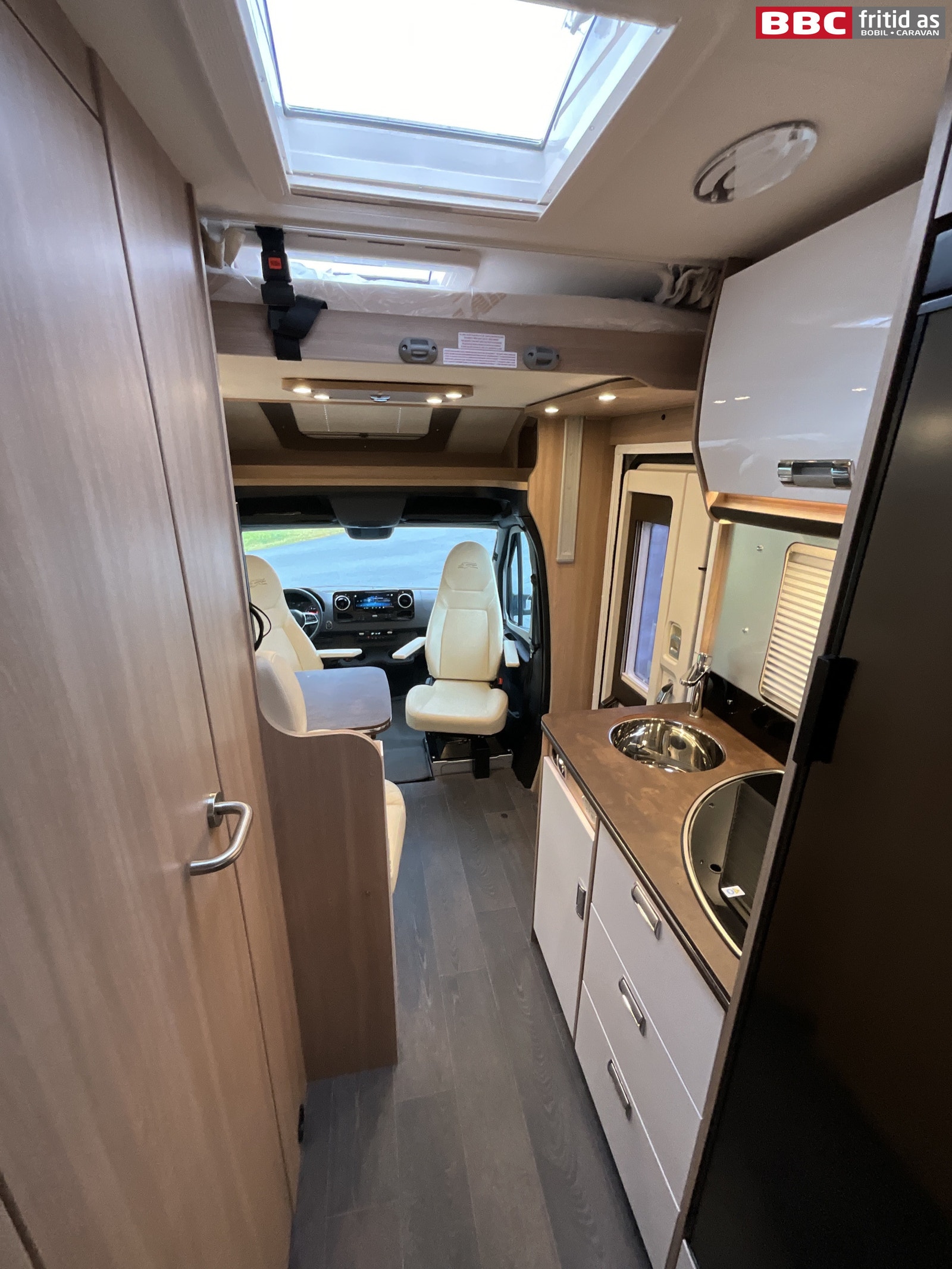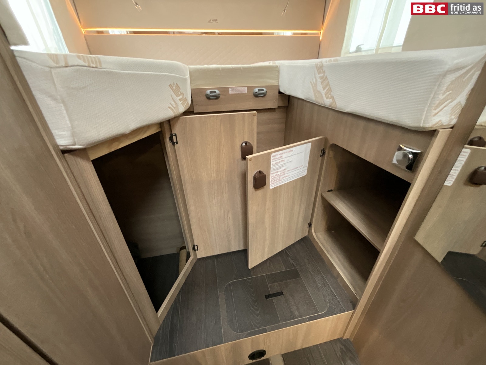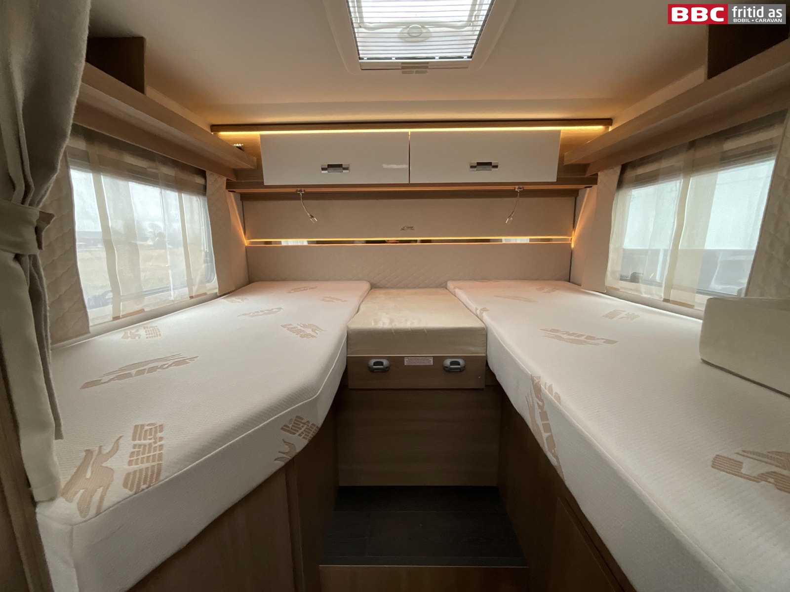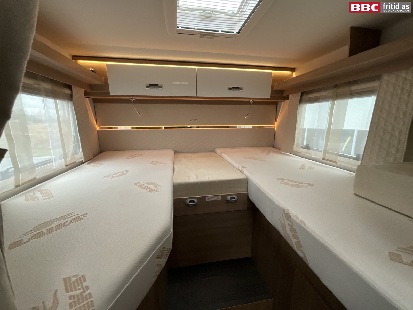 Bakerst i bilen er det 2 enkeltsenger på 193 x 80 og 185 x 80 cm som også kan legges sammen til stor dobbeltseng hvis det er ønskelig. 2 overskap, 2 underskap, 4 hyller, 1 høyskap på ca 180 x 22 cm, 2 leselys, ledstriper innfeldt, 230V-uttak og 2 stk USB-uttak. Takluke på 40 x 40 cm, 2 vinduer og trappetrinn opp til sengene.