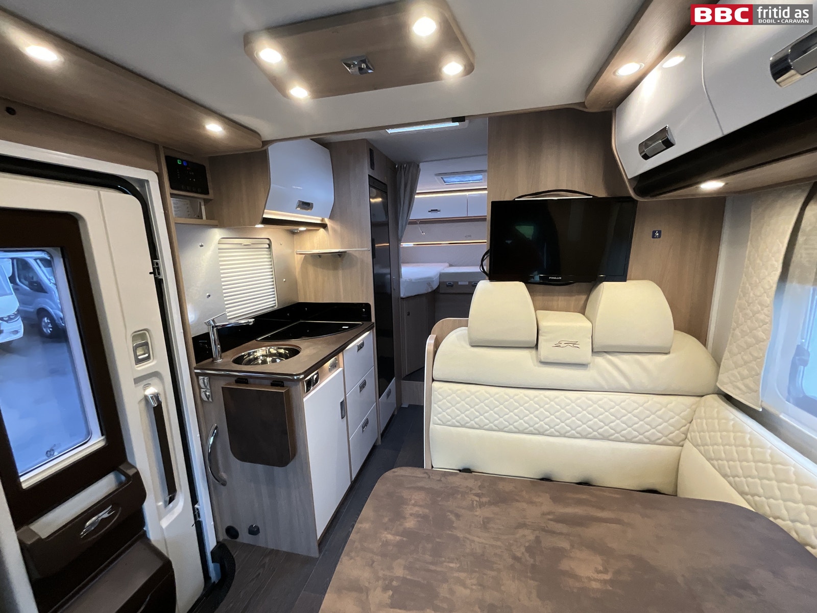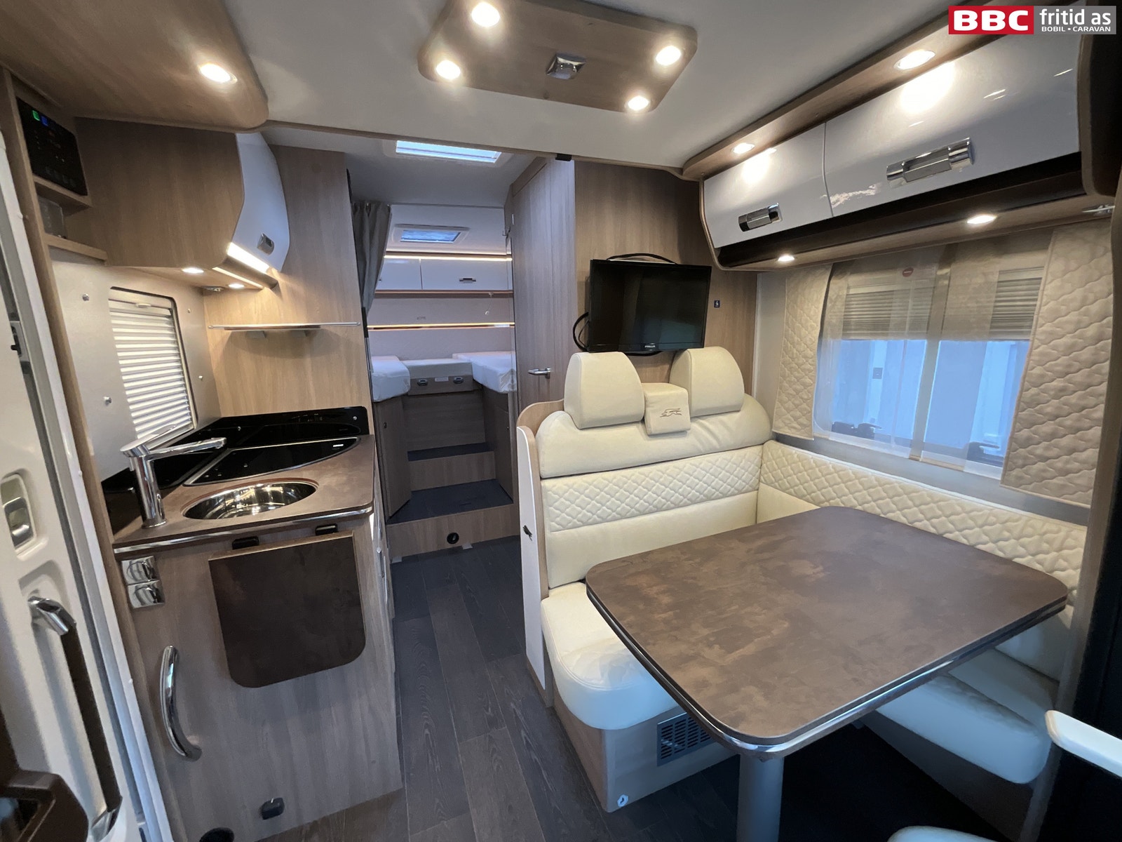 Her er det en L-salong som sammen med de vendbare fremsetene gir grei plass til 4 personer rundt det justerbare bordet på 95 x 55 cm. Det er også 2 overskap, 2 x 4 taklys, 2 lys under overskapene, myggdør i bodelsdøren, vindu i bodelsdøren og en Finlux TV som er ferdig montert. I tillegg er det en elektrisk styrt senkeseng på 200 x 95 cm.