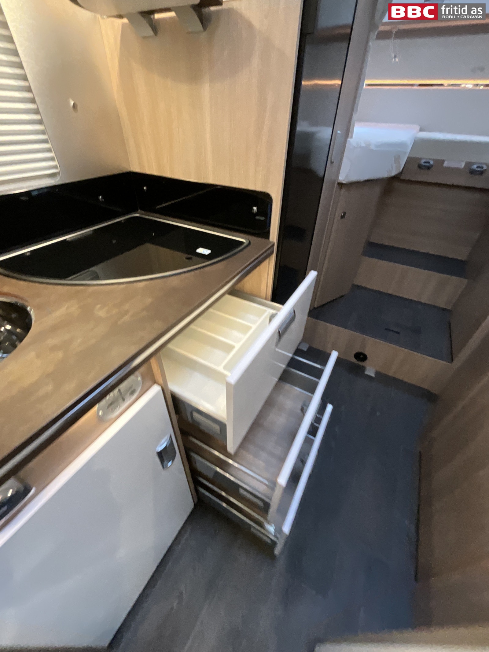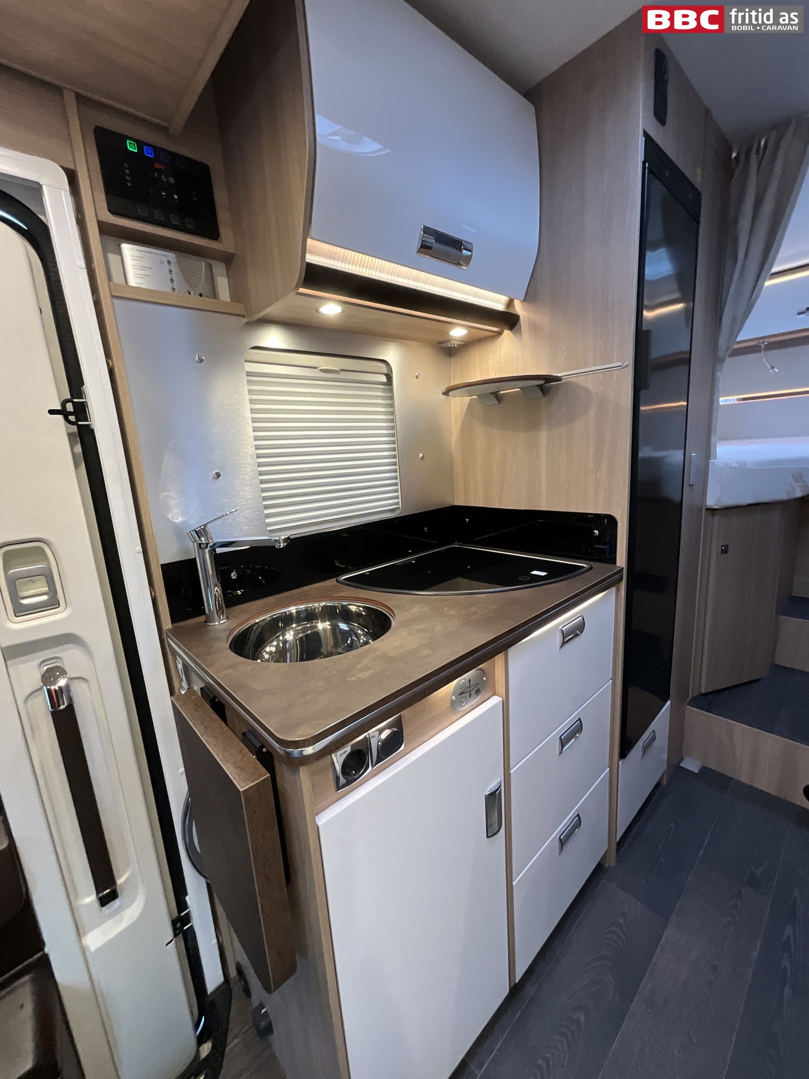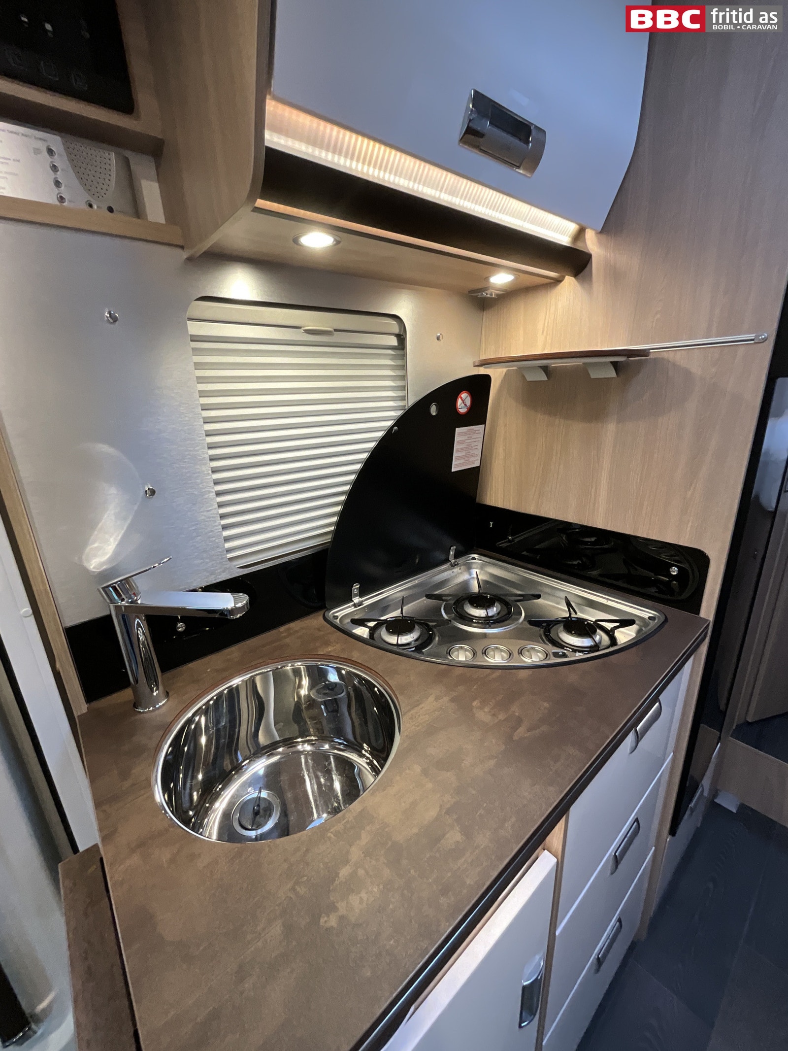 I kjøkkendelen er det benk med 3 kokebluss, vask, 1 stort overskap, 4 skuffer, 1 underskap og flere hyller. 2 lys over benken, taklys og ledstriper innfeldt i innredningen. Kjøleskapet er et høyt Thetford-skap med innebygd fryseboks. Takluke på 40 x 40 cm, 230V-uttak og godt med gulvplass.