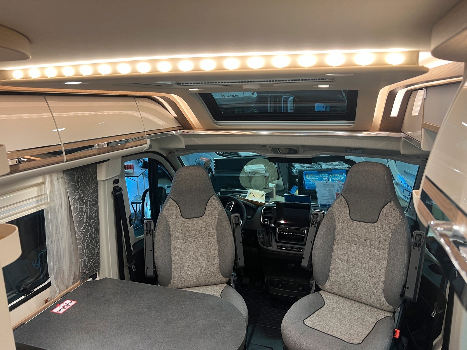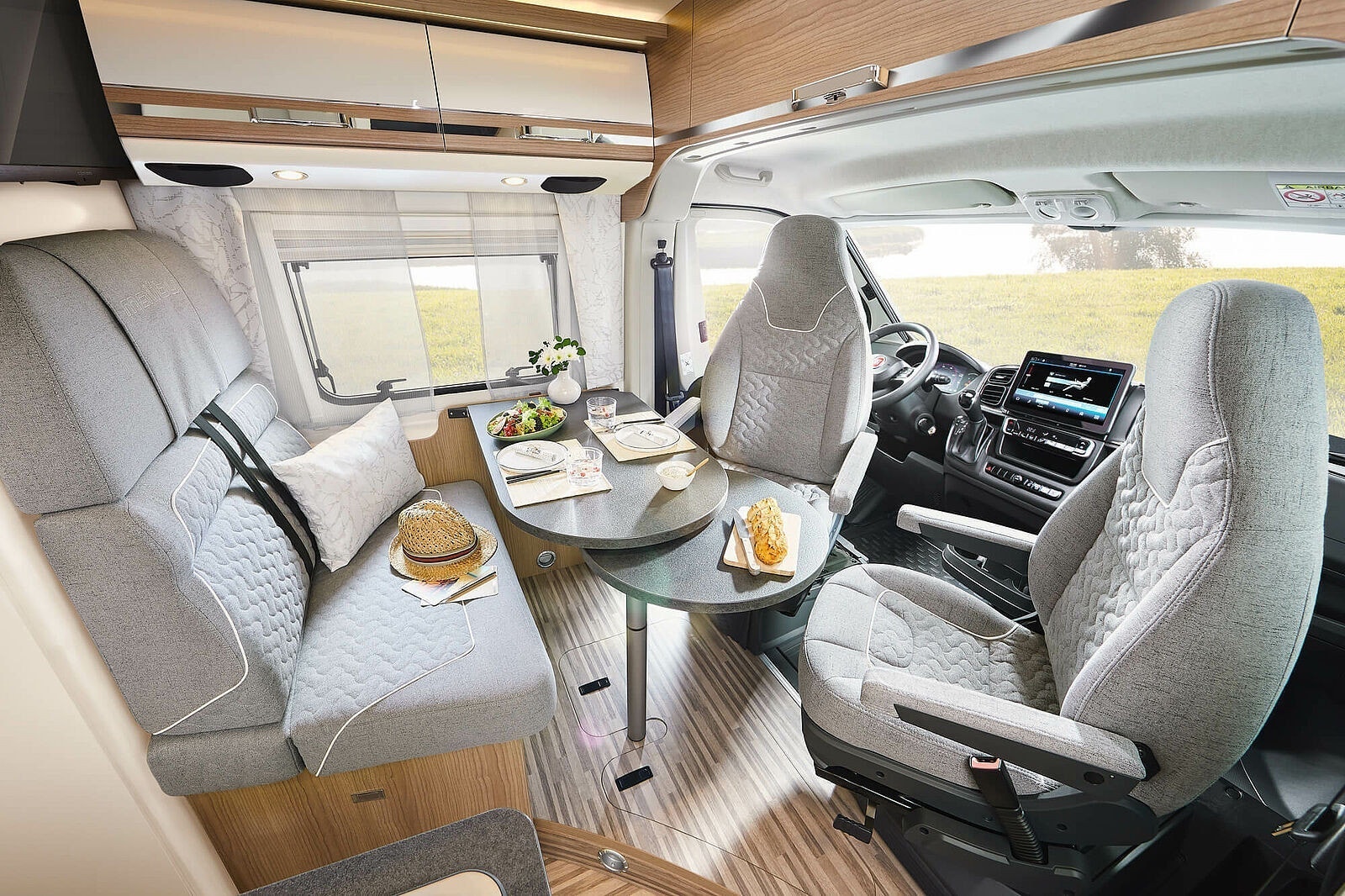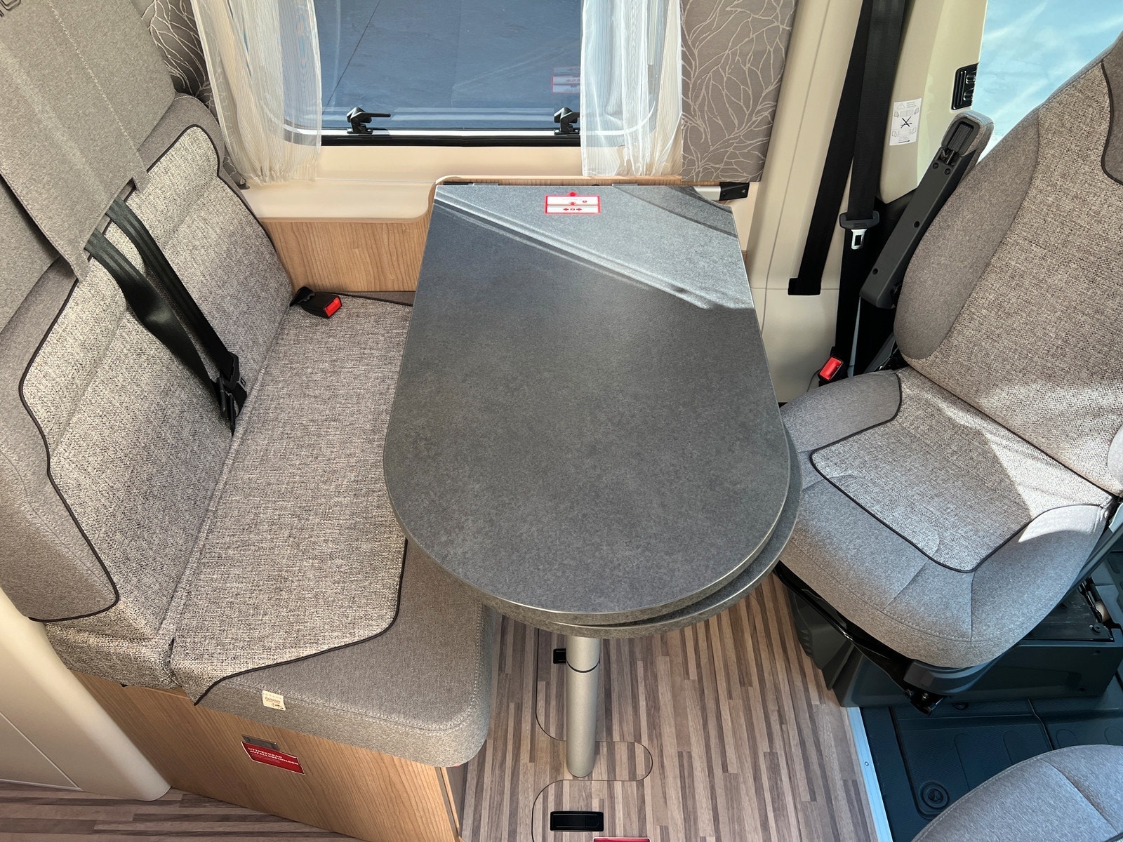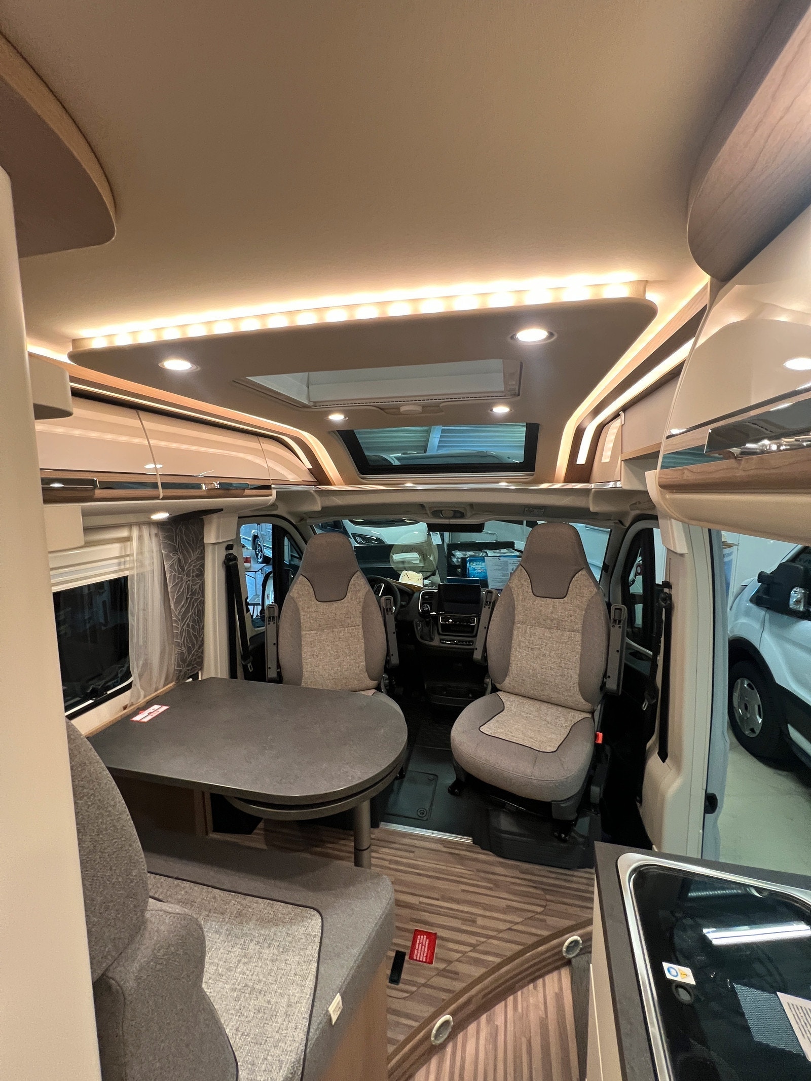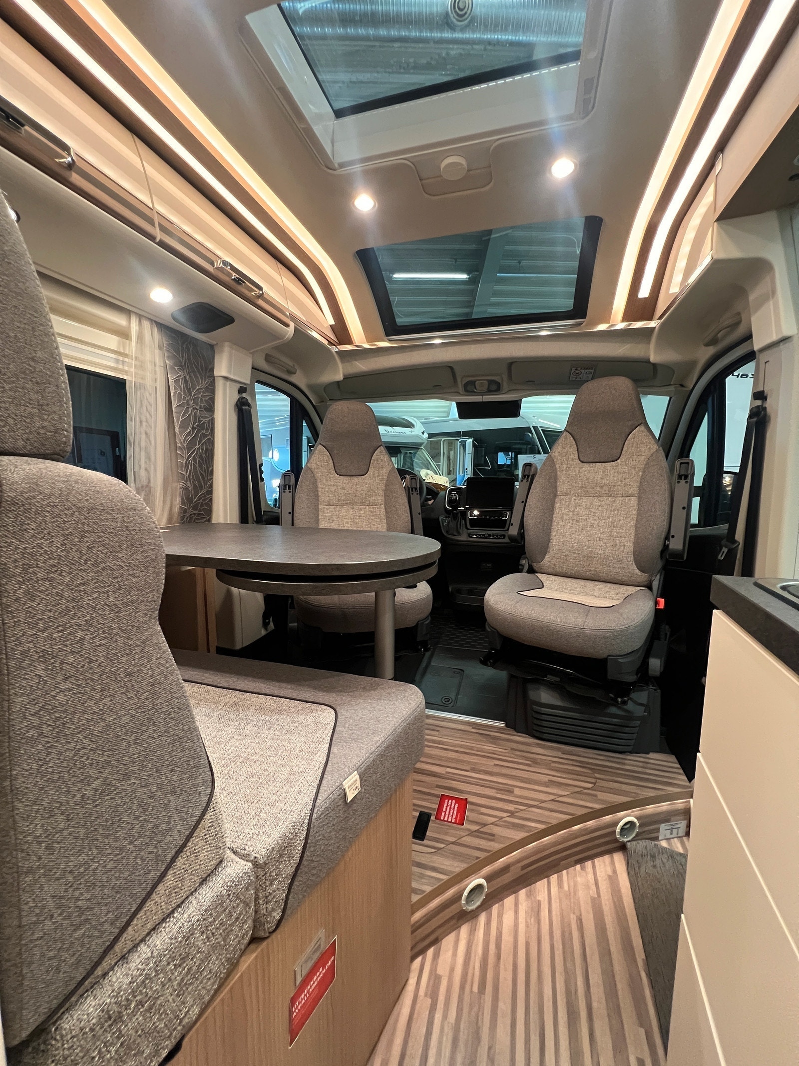 Sittegruppen oppleves som romslig. Begge setene i førerhuset er svingbare. Bordet kan utvides etter behov. Bilen er oppgradert med LED – belysning både på fører og passasjerside og langs dobbeltgulv ved sittegruppen. Med sin utvidet innvendig høyde i førerhus og bodel får du en helt ny rom- og kjørefølelse.