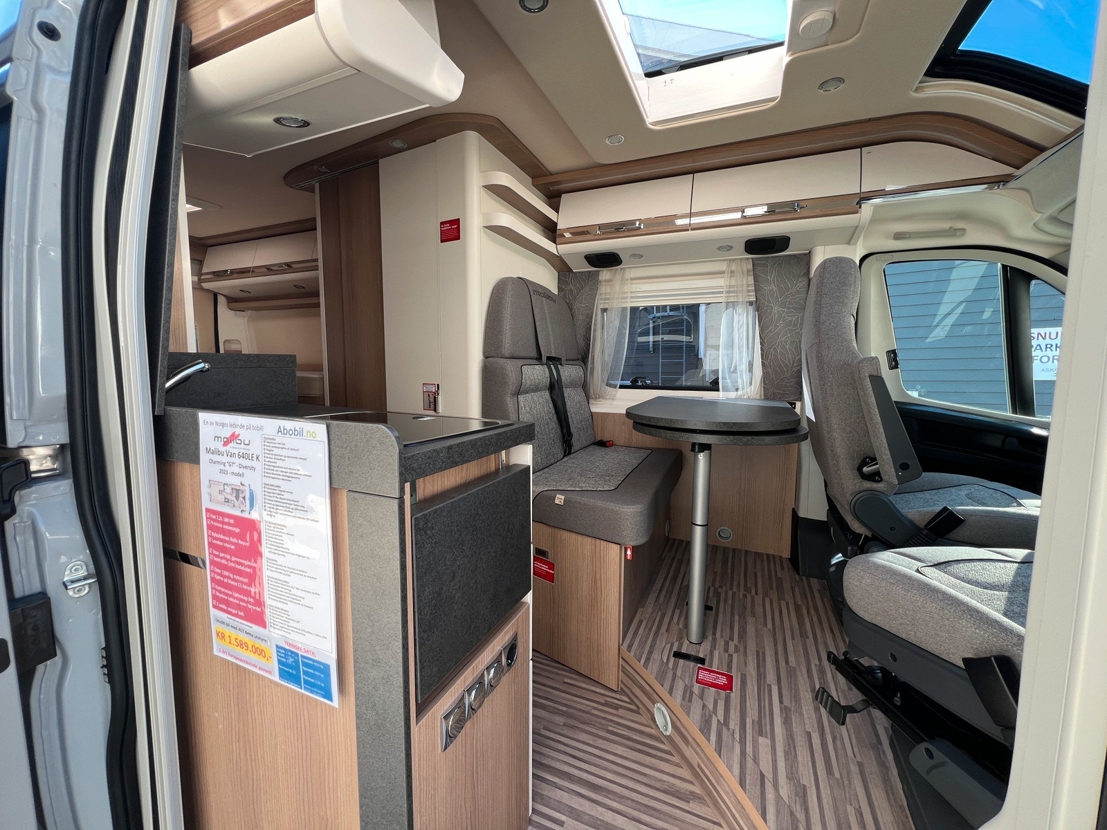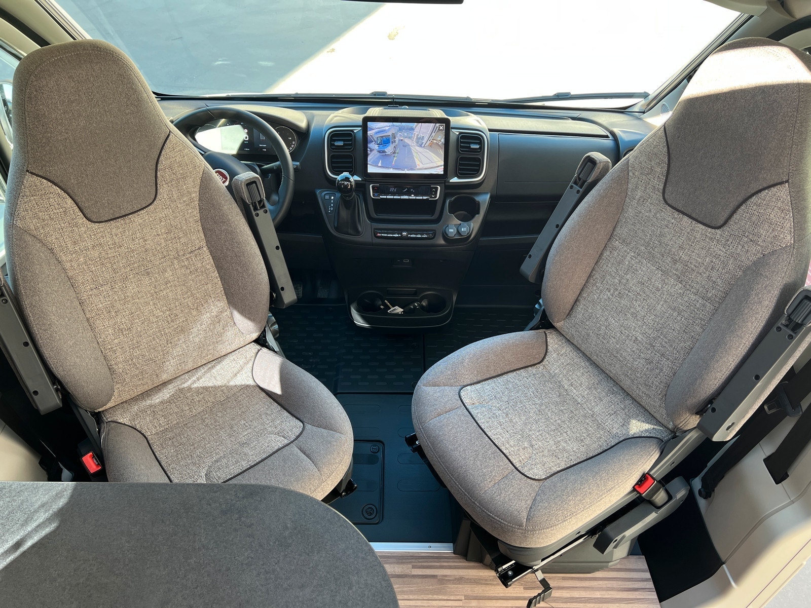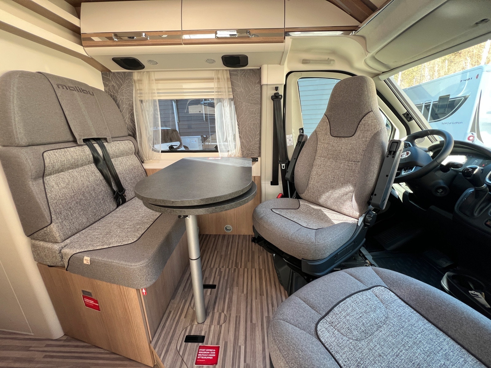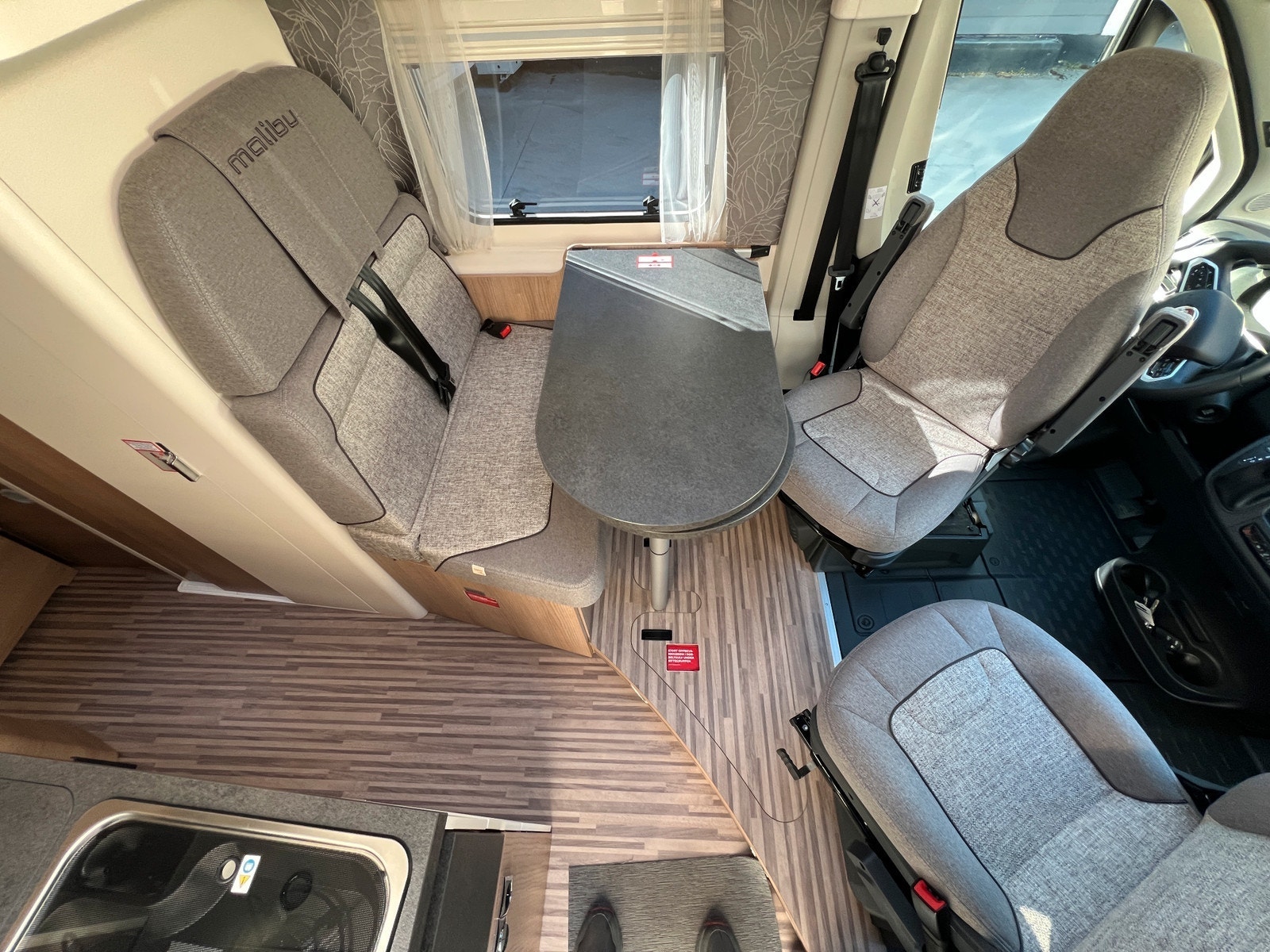 Sittegruppen oppleves som romslig. Begge setene i førerhuset er svingbare. Bordet kan utvides etter behov. Bilen er oppgradert med LED – belysning både på fører og passasjerside og langs dobbeltgulv ved sittegruppen. Med sin utvidet innvendig høyde i førerhus og bodel får du en helt ny rom- og kjørefølelse.