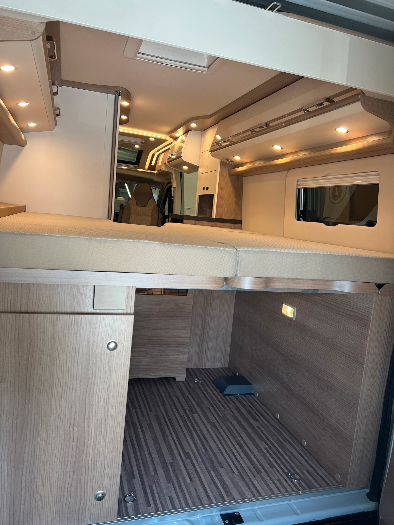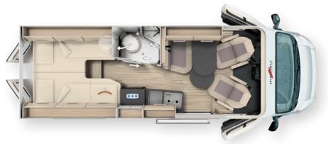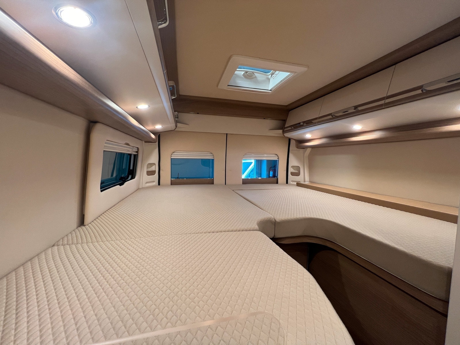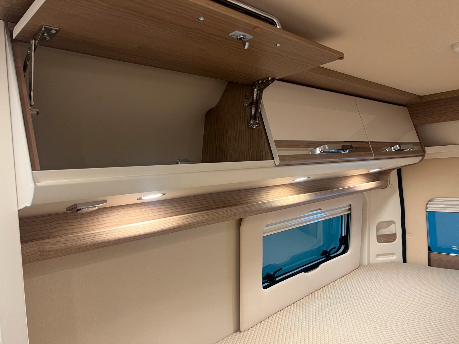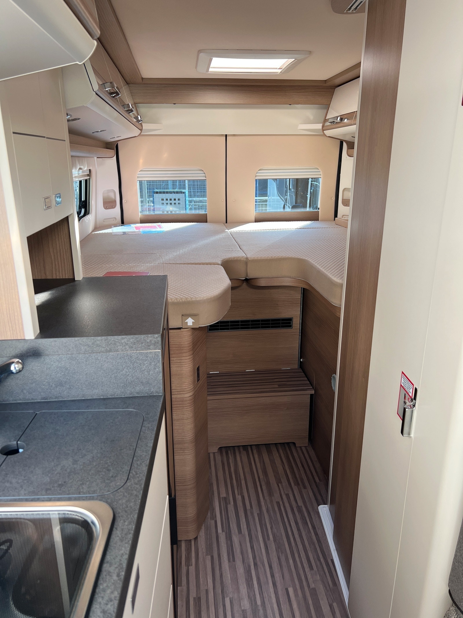 Sittegruppen oppleves som romslig. Begge setene i førerhuset er svingbare. Bordet kan utvides etter behov. Bilen er oppgradert med LED – belysning både på fører og passasjerside og langs dobbeltgulv ved sittegruppen. Med sin utvidet innvendig høyde i førerhus og bodel får du en helt ny rom- og kjørefølelse.