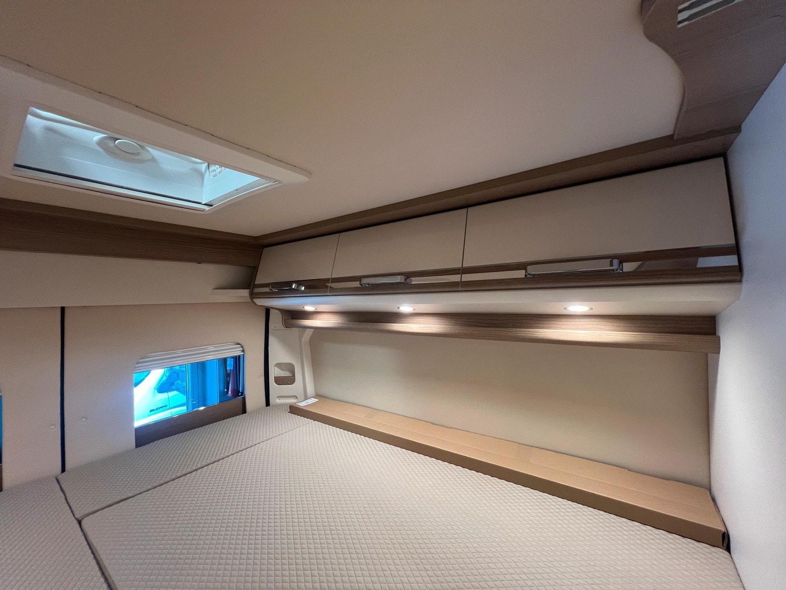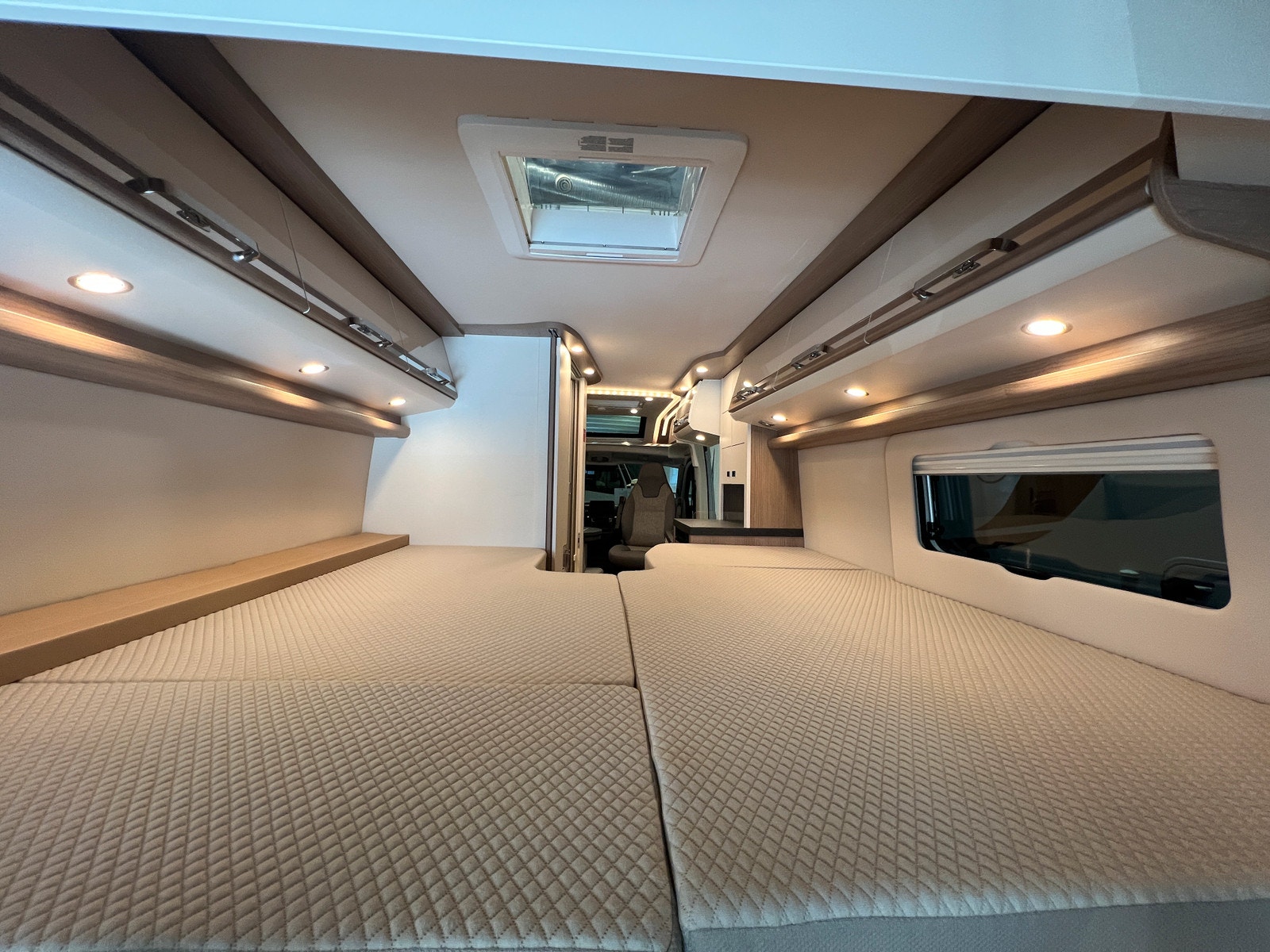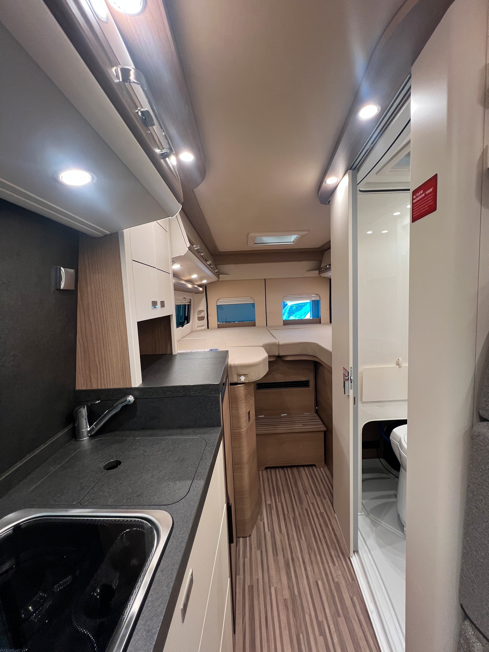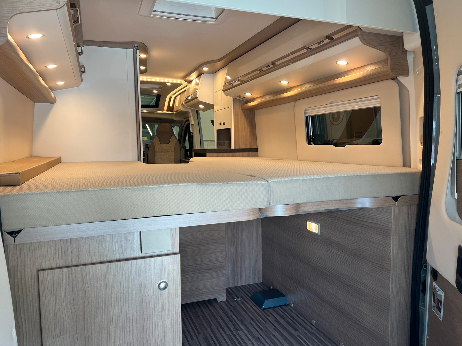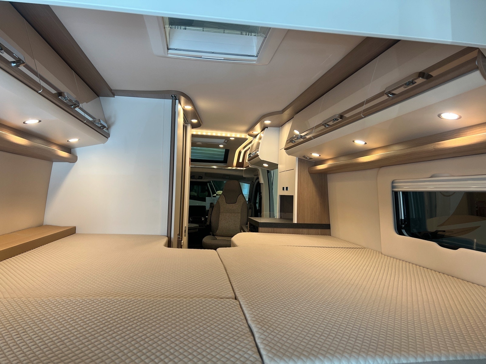 Sittegruppen oppleves som romslig. Begge setene i førerhuset er svingbare. Bordet kan utvides etter behov. Bilen er oppgradert med LED – belysning både på fører og passasjerside og langs dobbeltgulv ved sittegruppen. Med sin utvidet innvendig høyde i førerhus og bodel får du en helt ny rom- og kjørefølelse.