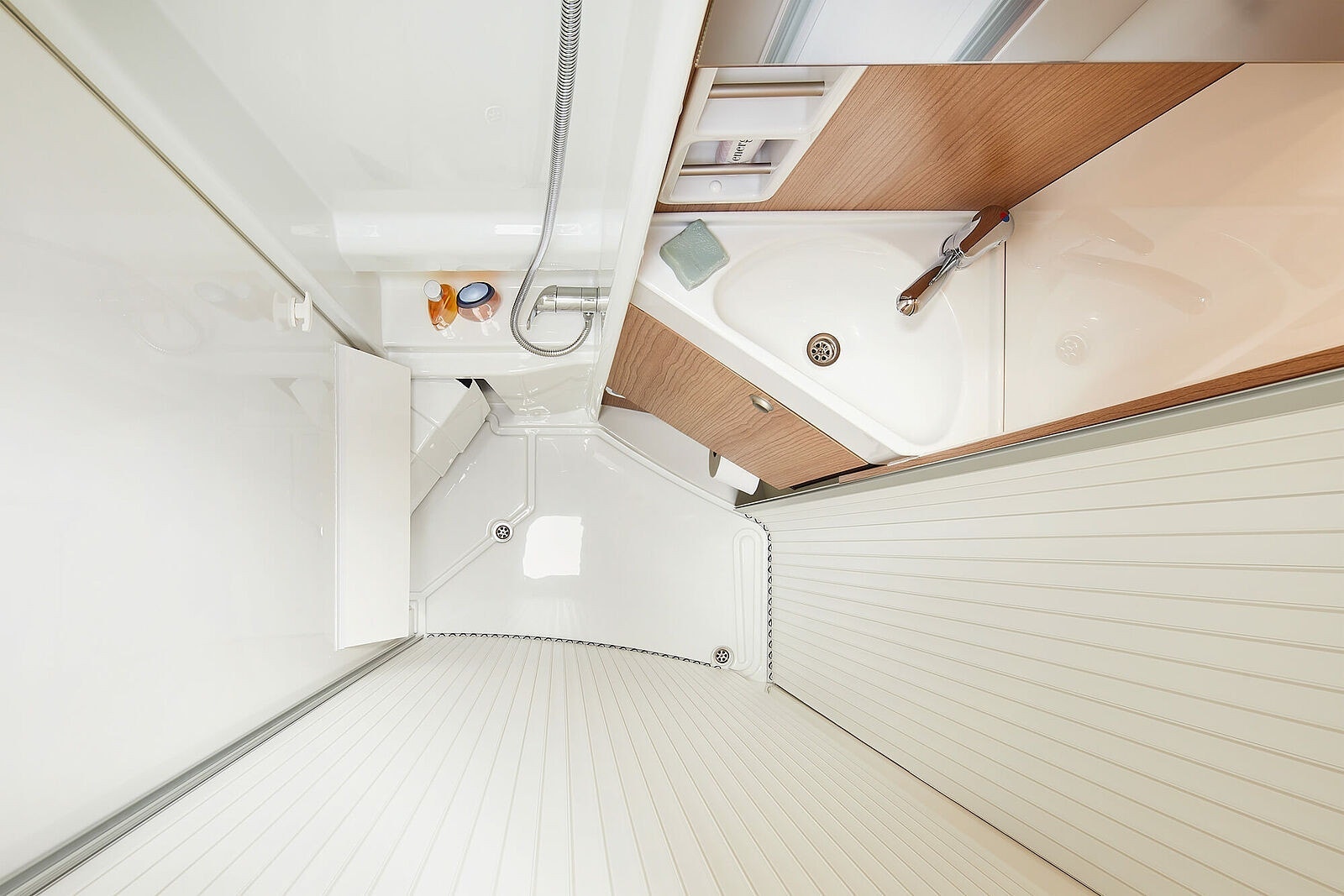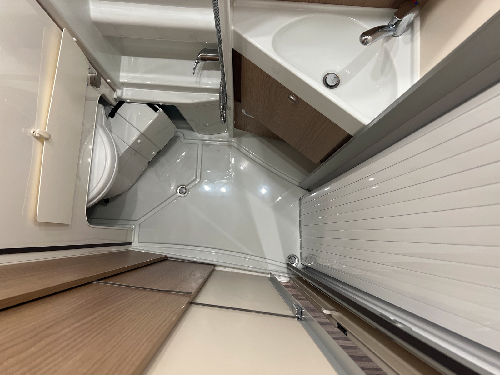Badet er imponerende! Romslig og praktisk baderom med smarte løsninger. Toalettet kan enkelt svinges bort for perfekt utnyttelse av rommet. Ved hjelp av to svingbare "Skyvedører" kan du  enkelt gjøre badet om til dusj UTEN klebrig dusjforheng!