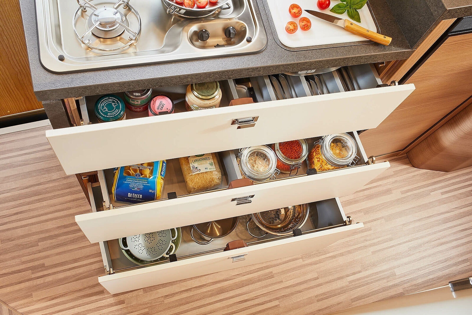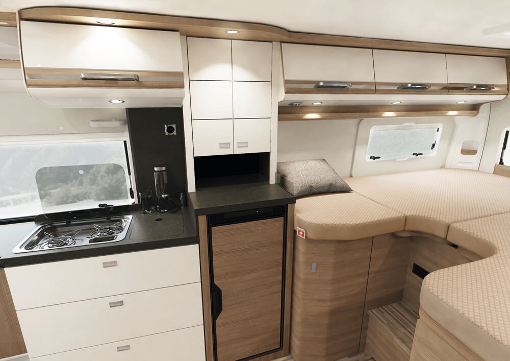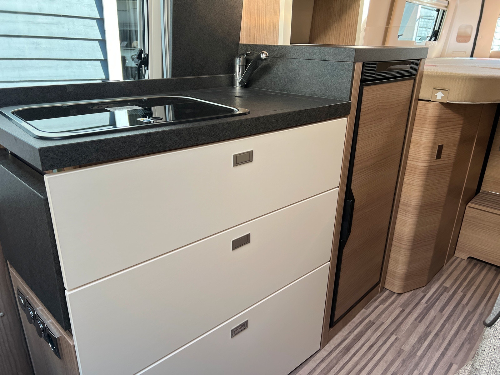 Stor kjøkkenbenk og to romslige kjøkkenskuffer med demping samt ett lite skap. Romselig kompressor kjøleskap. Det er gode muligheter for lagring under sittebenk til tørrvarer etc. Her kommer du til uten å fjerne puten, skuff som svinges ut. Koketopp med elektrisk tenner og praktisk glasslokk. Dekselet over oppvaskkum kan med fordel brukes som ekstra kjøkkenbenk/avlastningsplate.