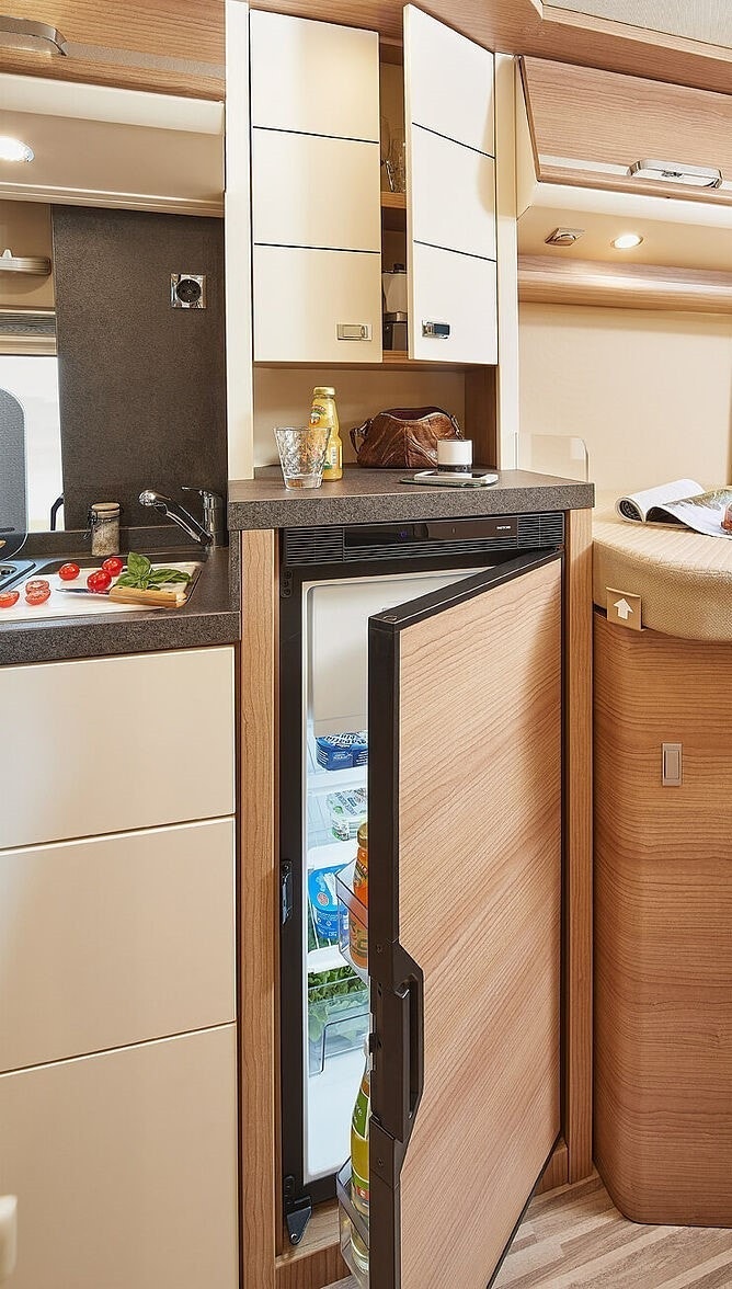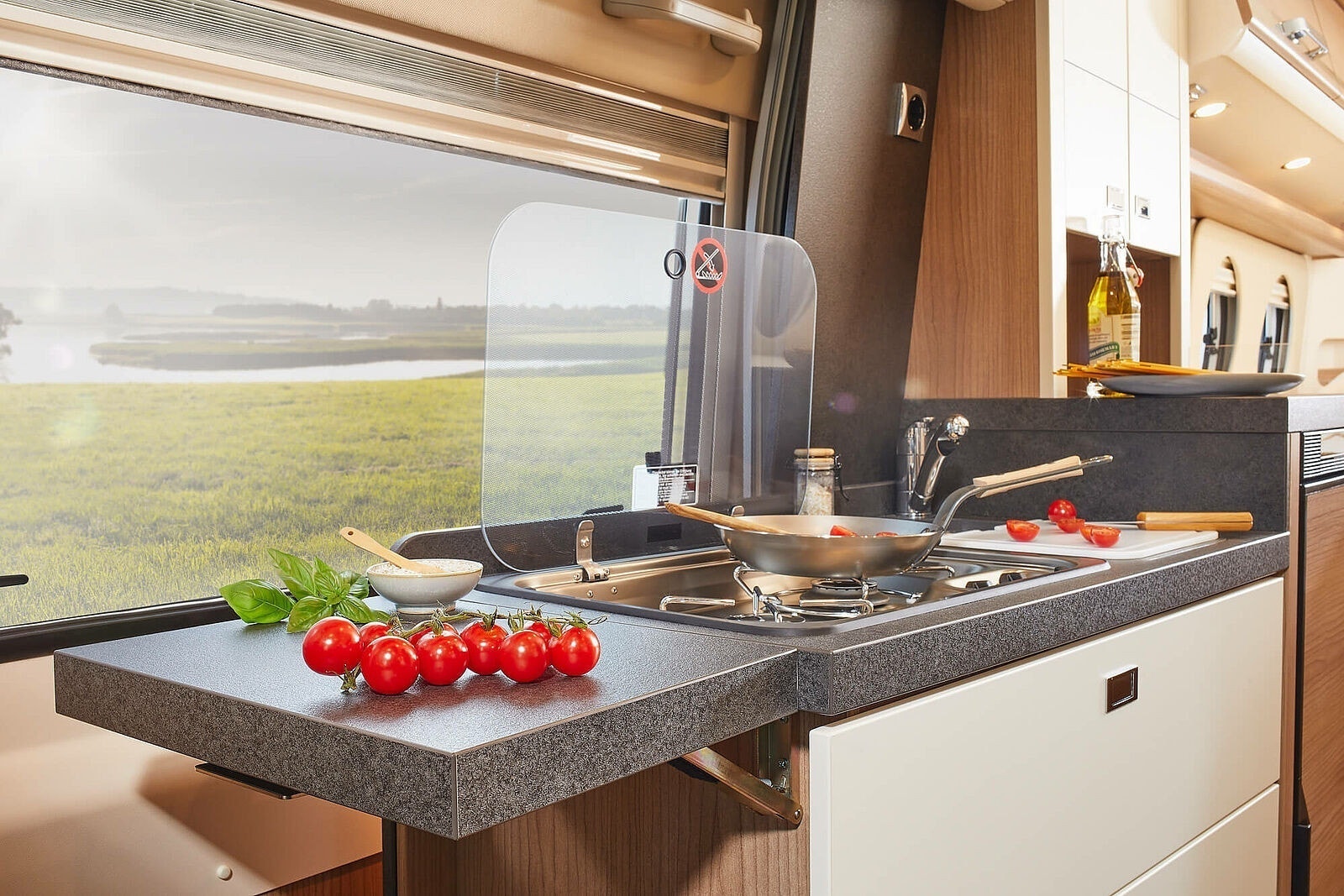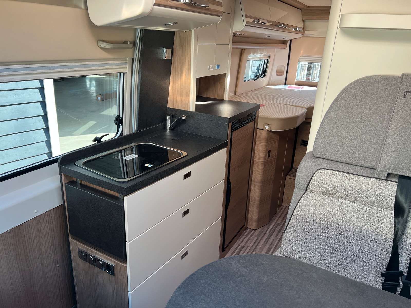 Stor kjøkkenbenk og to romslige kjøkkenskuffer med demping samt ett lite skap. Romselig kompressor kjøleskap. Det er gode muligheter for lagring under sittebenk til tørrvarer etc. Her kommer du til uten å fjerne puten, skuff som svinges ut. Koketopp med elektrisk tenner og praktisk glasslokk. Dekselet over oppvaskkum kan med fordel brukes som ekstra kjøkkenbenk/avlastningsplate.